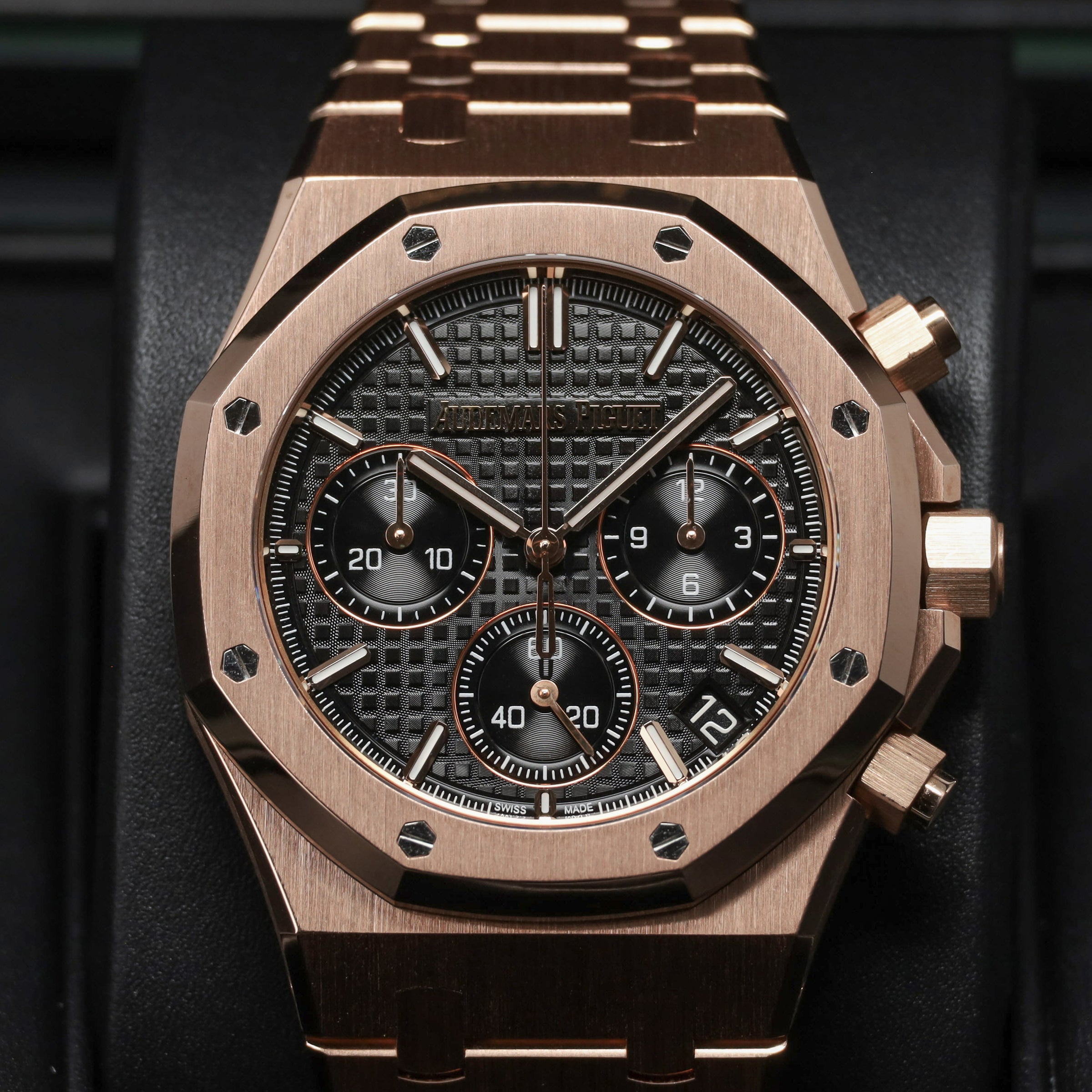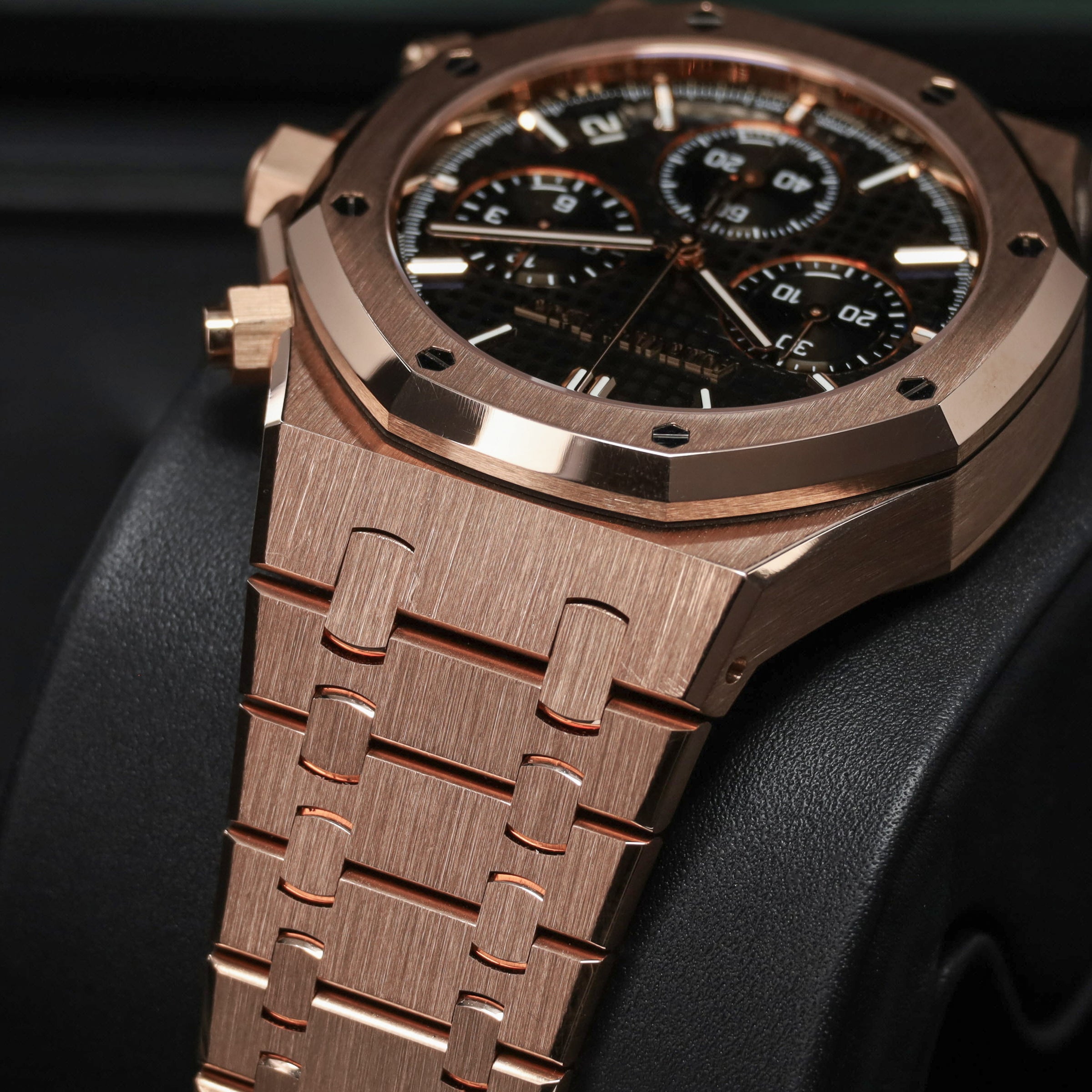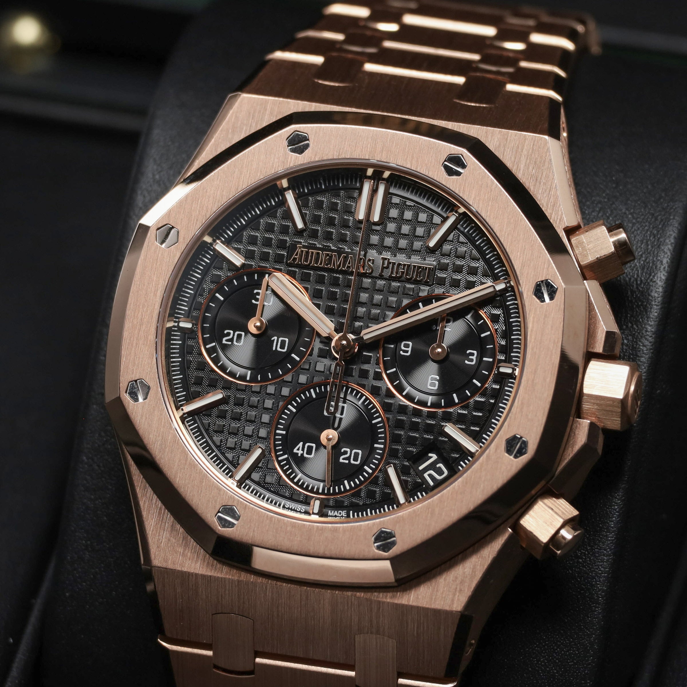 This reference features a 41mm 18k rose gold case with the signature octagonal bezel, paired with a black “Grande Tapisserie” dial and chronograph sub-dials. It is powered by the Audemars Piguet Caliber 4401 automatic chronograph movement, offering a 70-hour power reserve and flyback functionality. The watch is fitted on a strap (converted from bracelet) with an 18k rose gold clasp, giving it a lighter and more flexible wrist feel.