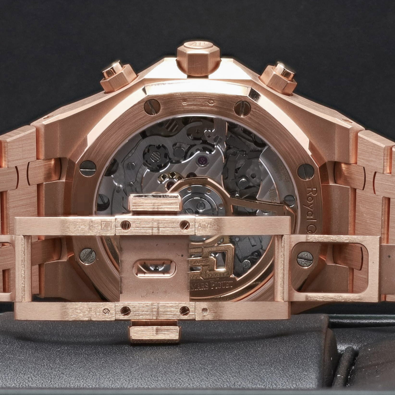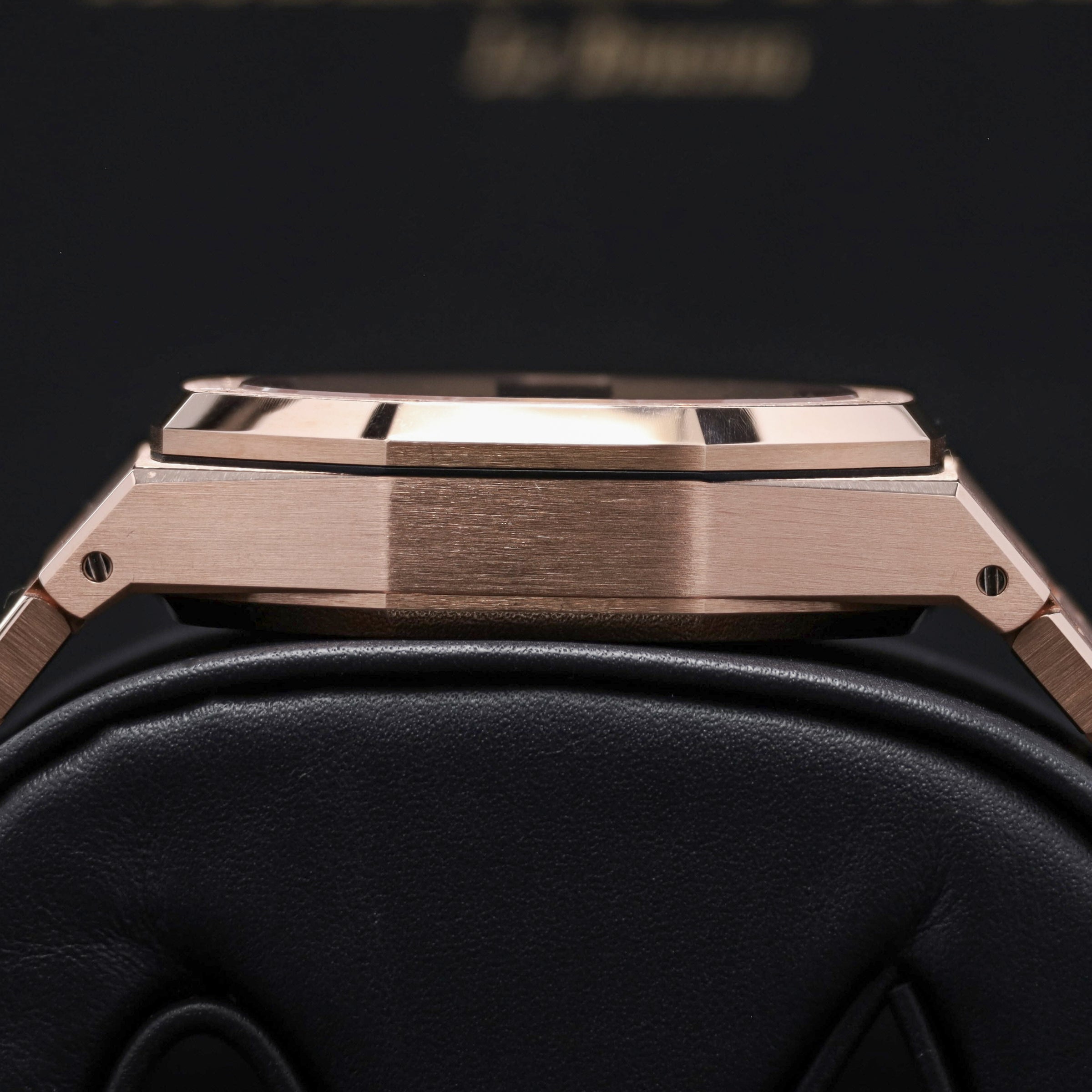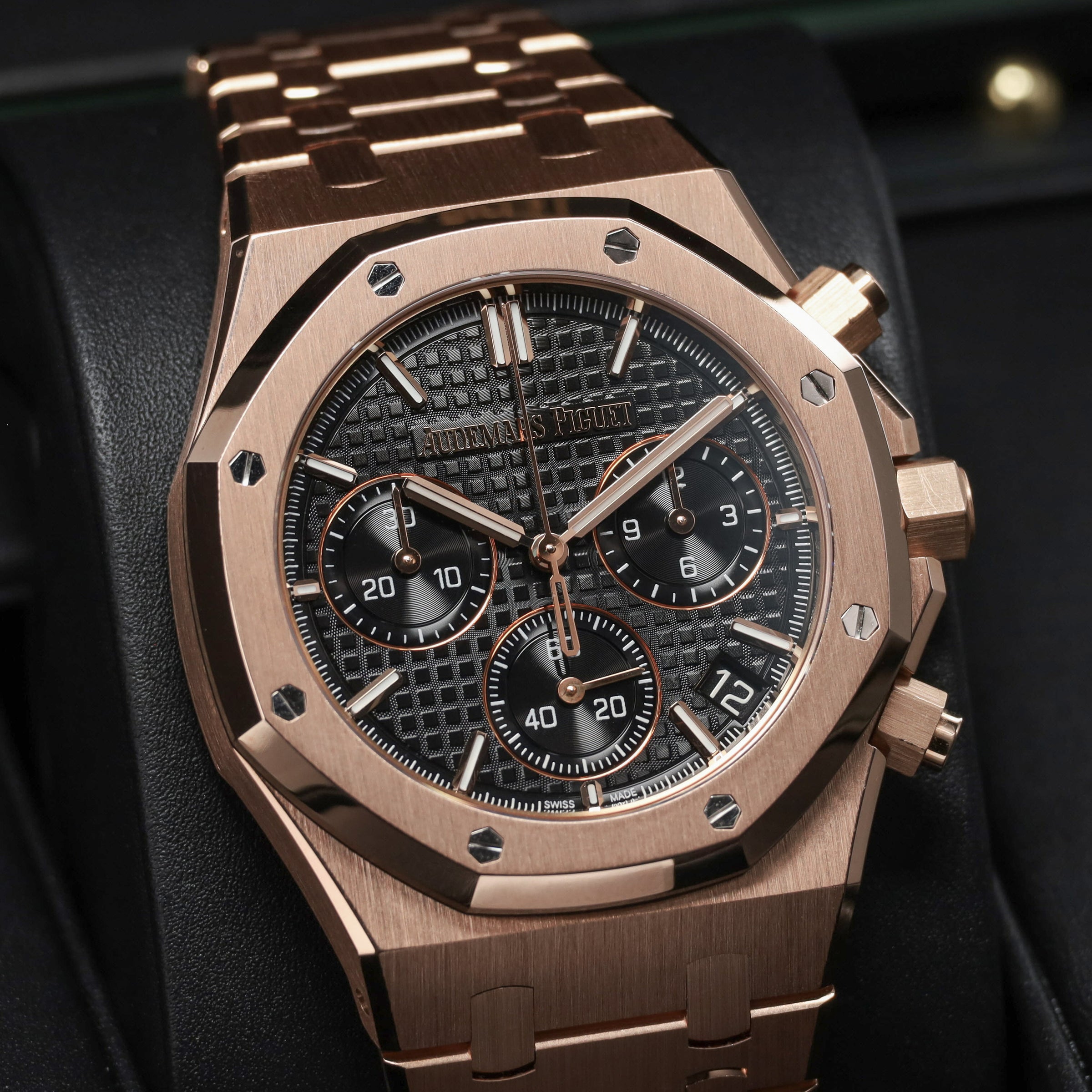 This reference features a 41mm 18k rose gold case with the signature octagonal bezel, paired with a black “Grande Tapisserie” dial and chronograph sub-dials. It is powered by the Audemars Piguet Caliber 4401 automatic chronograph movement, offering a 70-hour power reserve and flyback functionality. The watch is fitted on a strap (converted from bracelet) with an 18k rose gold clasp, giving it a lighter and more flexible wrist feel.