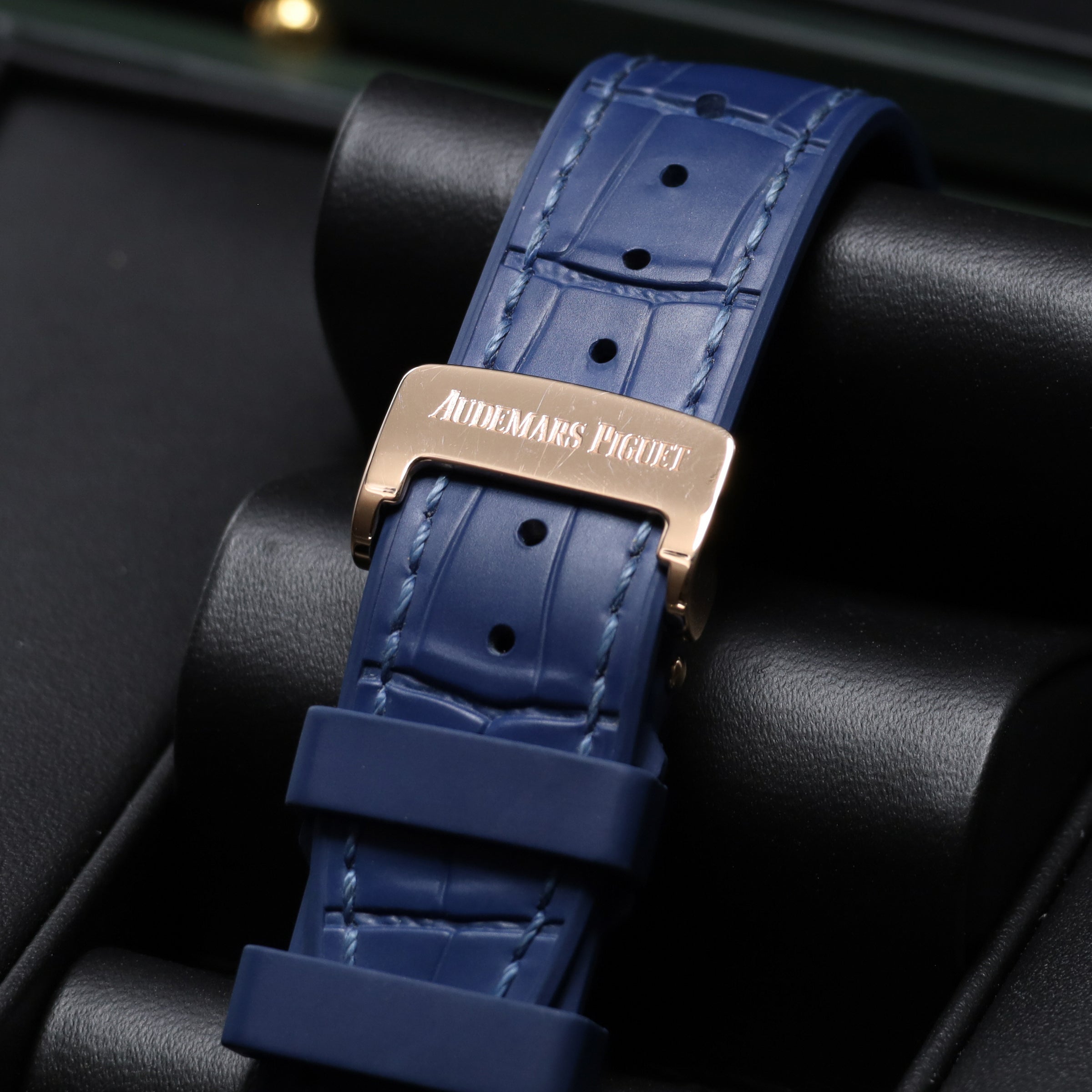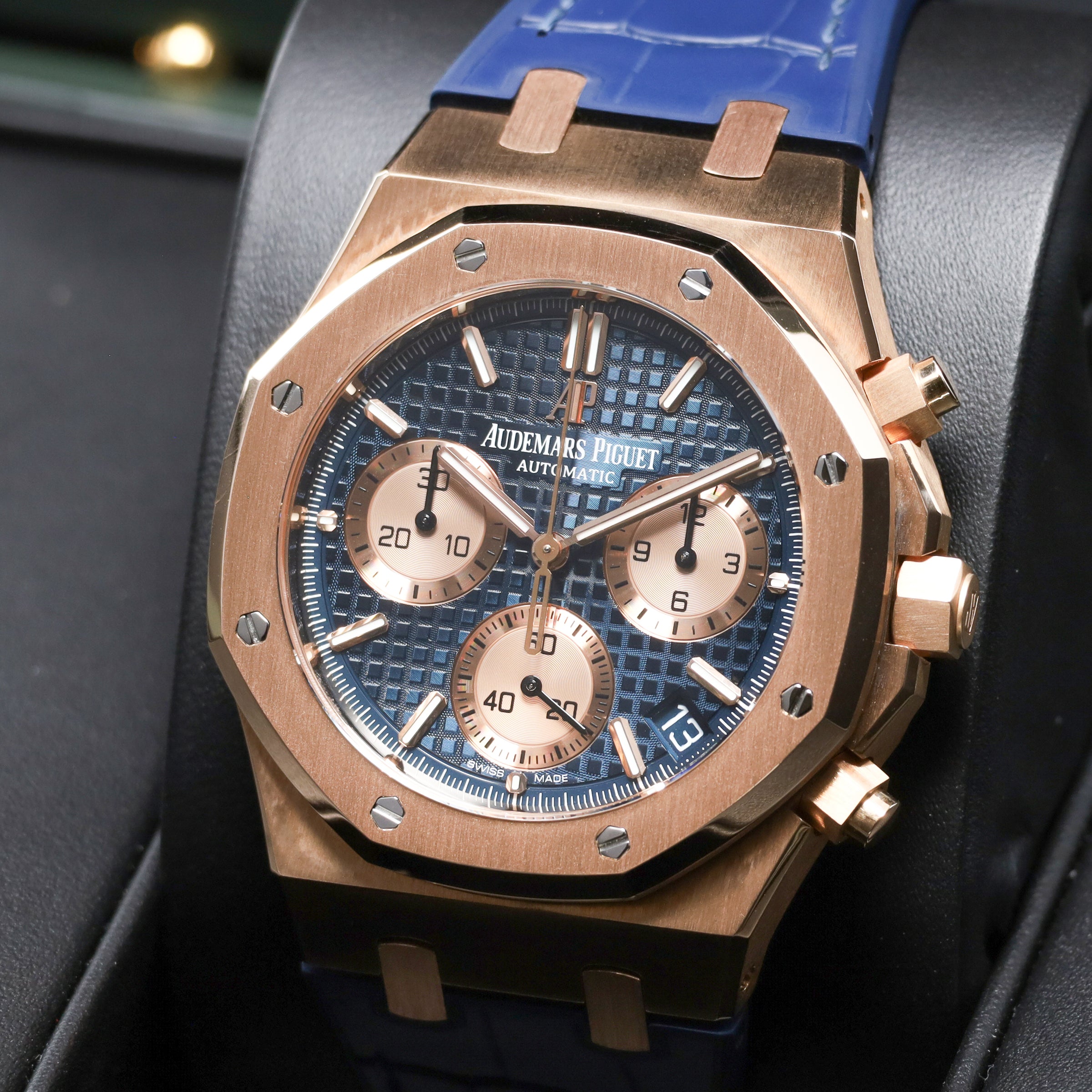 This reference features a 41mm 18k rose gold case with the signature octagonal bezel, paired with a deep blue dial adorned with the classic "Tapisserie" pattern. It is powered by the Audemars Piguet Caliber 4302, a self-winding movement with a 70-hour power reserve. The watch is fitted with a blue alligator leather strap with an 18k rose gold folding clasp, offering a sophisticated and comfortable fit.