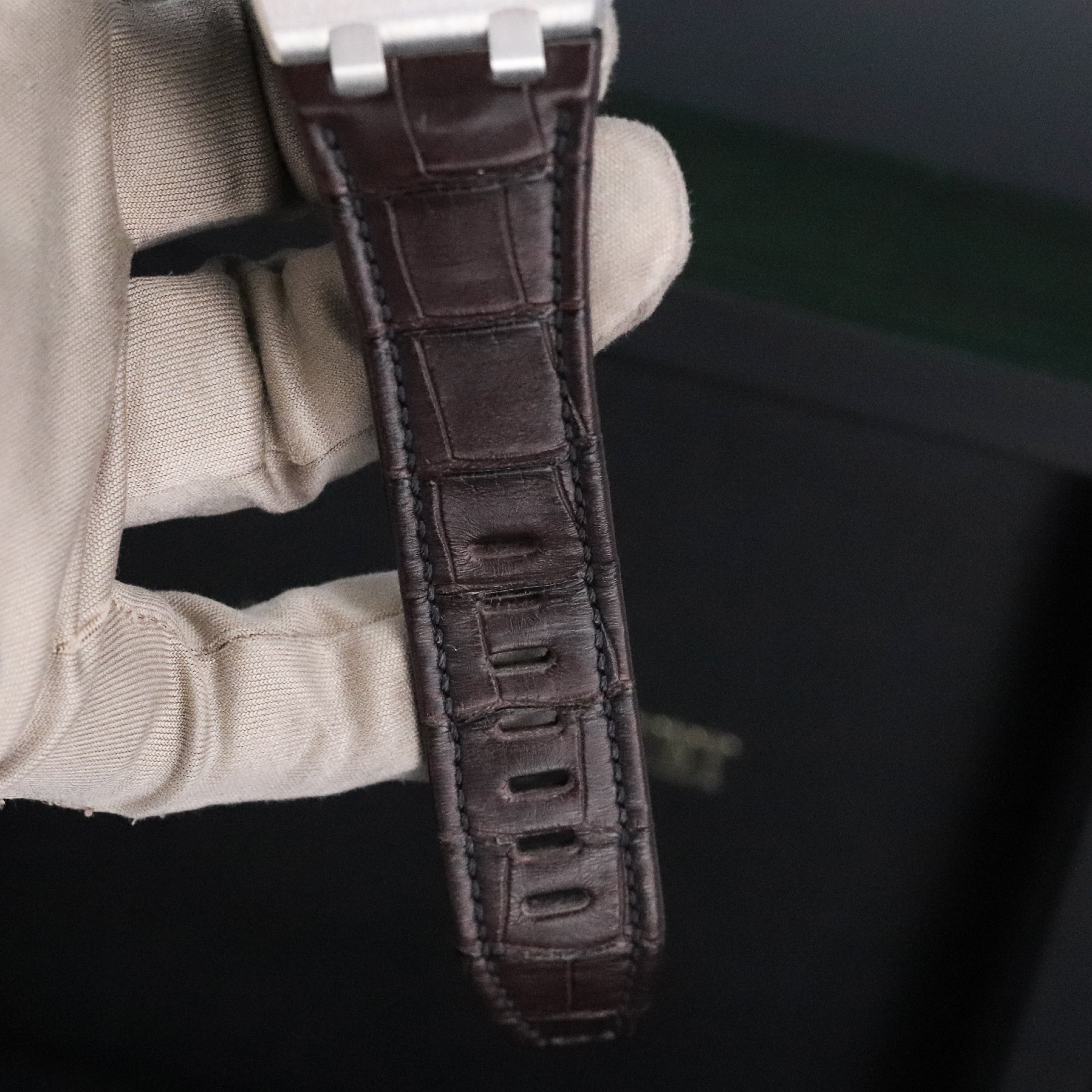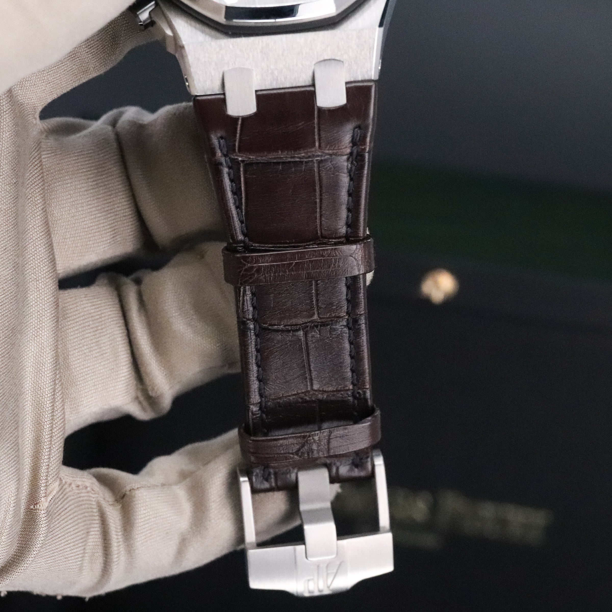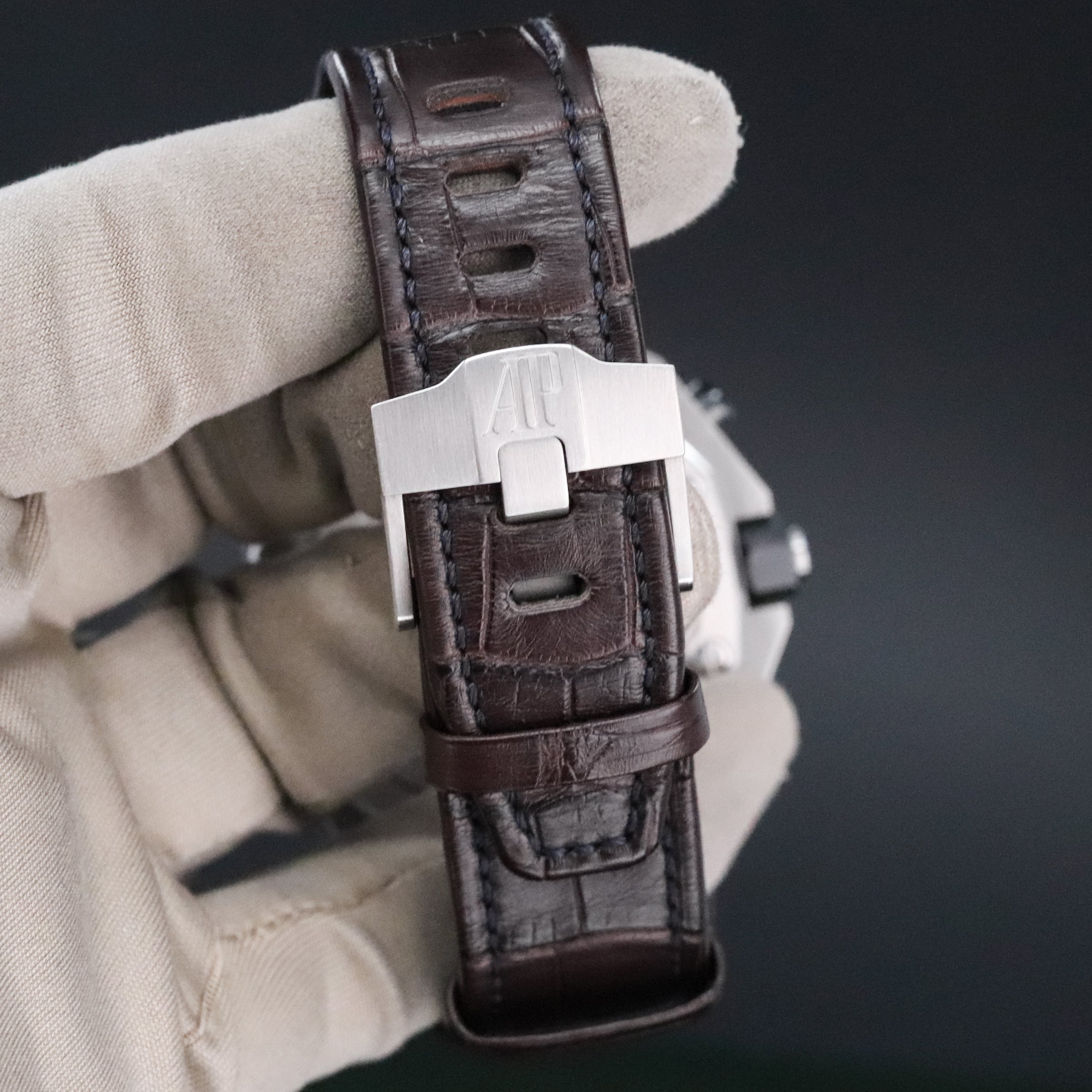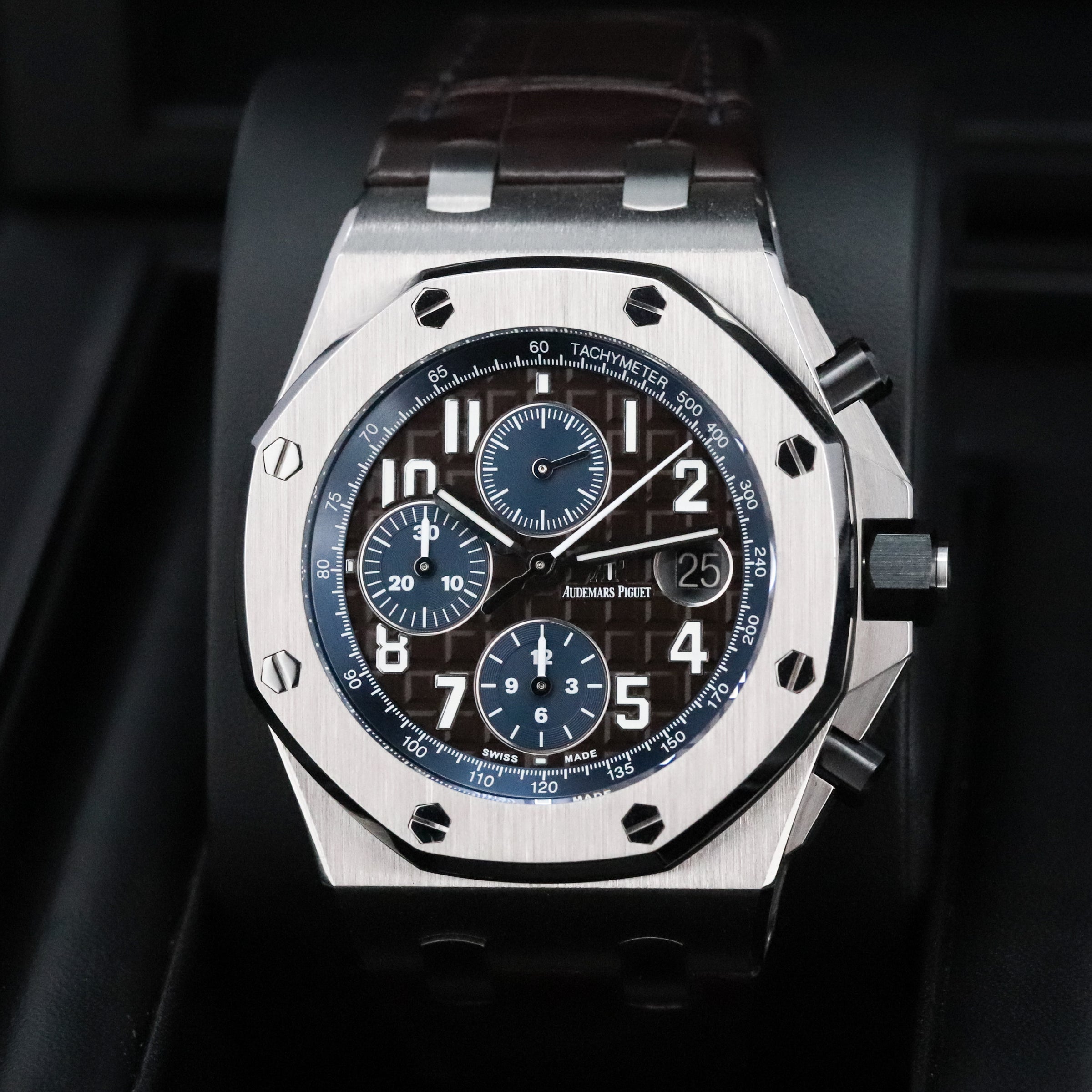 This reference features a 42mm stainless steel case with glareproofed sapphire crystal and caseback, black ceramic pushpieces and screw-locked crown, brown dial with Méga Tapisserie pattern and blue counters. Powered by AP's automatic chronograph movement with 50-hour power reserve and 100-meter water resistance. The watch is fitted with a hand-stitched large square scale brown alligator strap with stainless steel pin buckle.