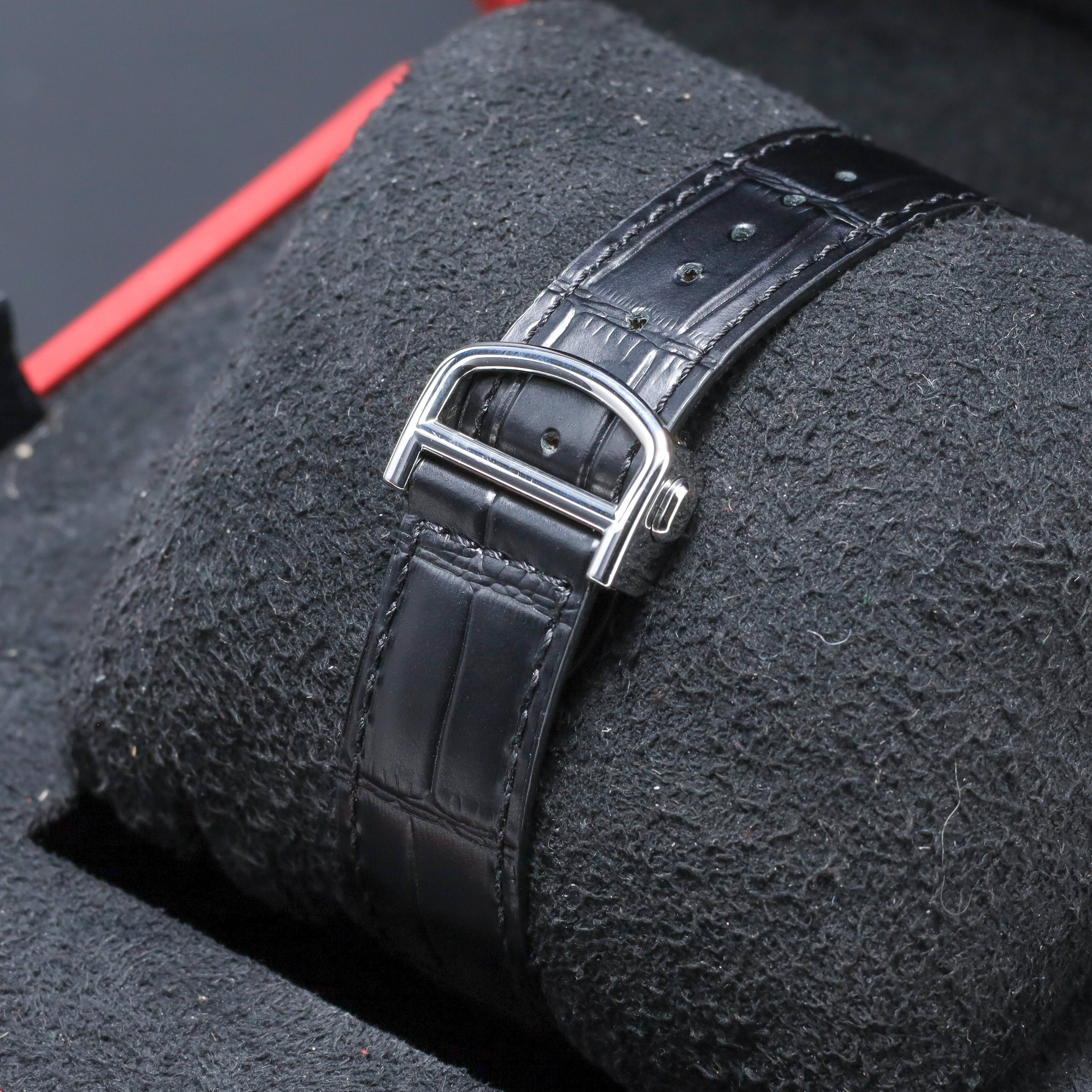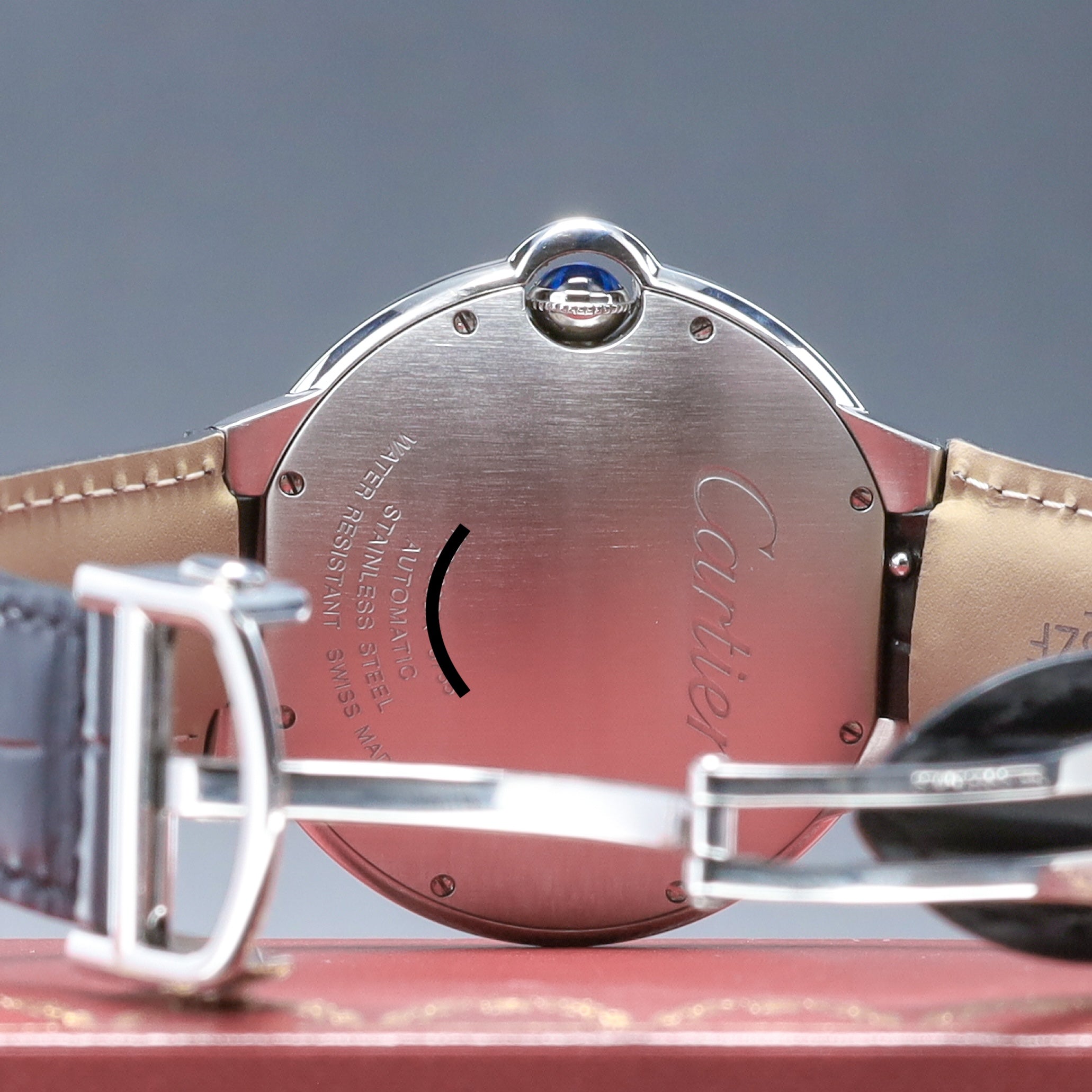 This reference features a 42mm stainless steel case, a smooth polished bezel with the iconic crown guard, and a blue sunray dial with bold Roman numerals and steel hands. Powered by an automatic mechanical movement, it offers reliable performance wrapped in Cartier’s refined aesthetic. The watch is fitted with a blue leather strap and secured by a folding deployant clasp.