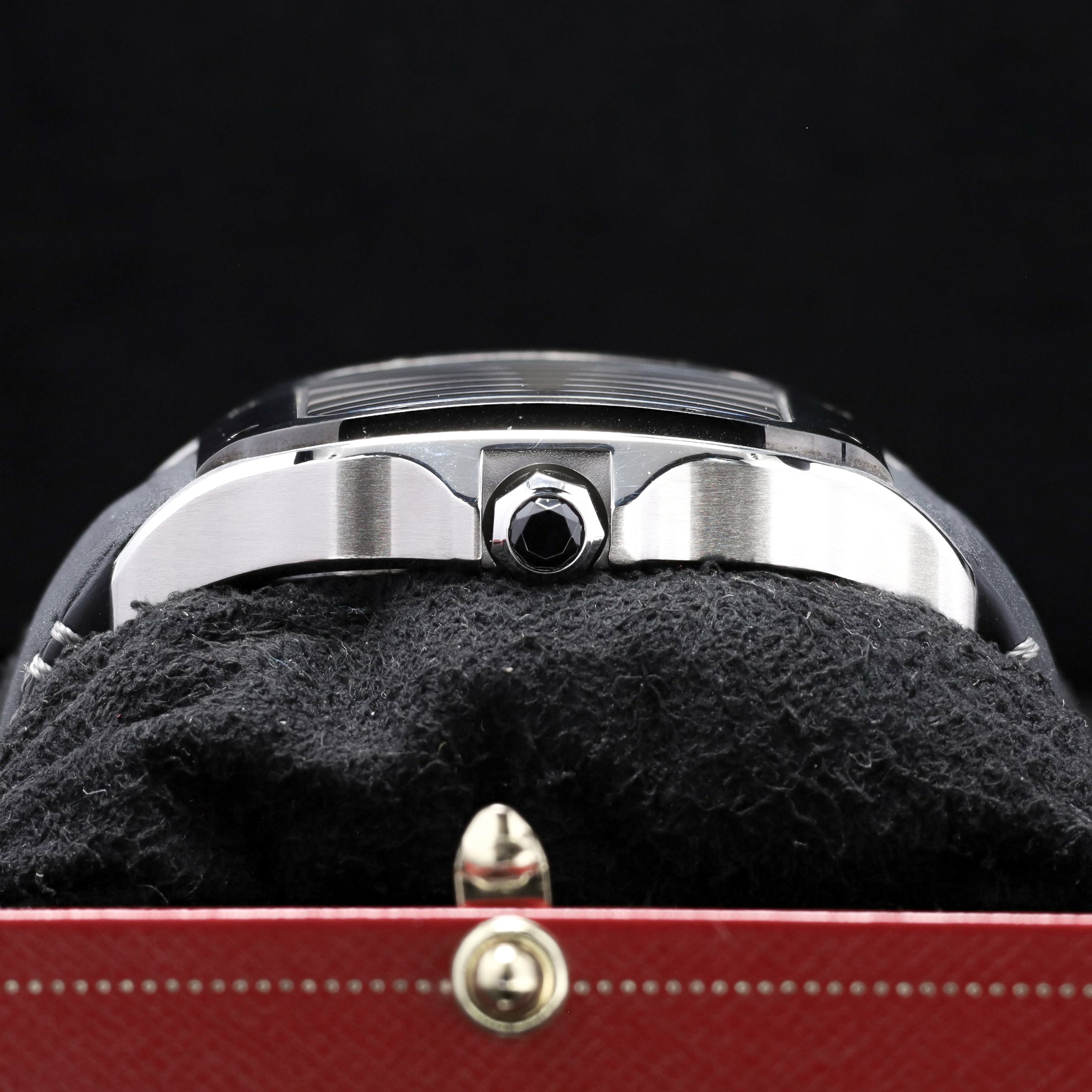 This watch features a 43.3mm steel case and ADLC brushed bezel with a white and silver-toned dial with black Roman numerals and black steel sword-shaped hands, a Cartier signature. Completing the look is a black rubber quick-release strap with a steel folding clasp.