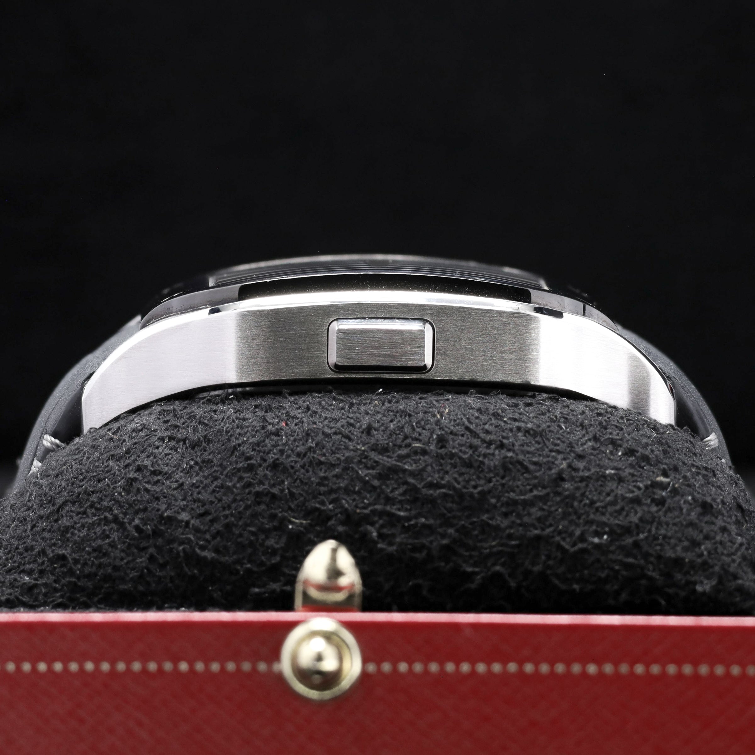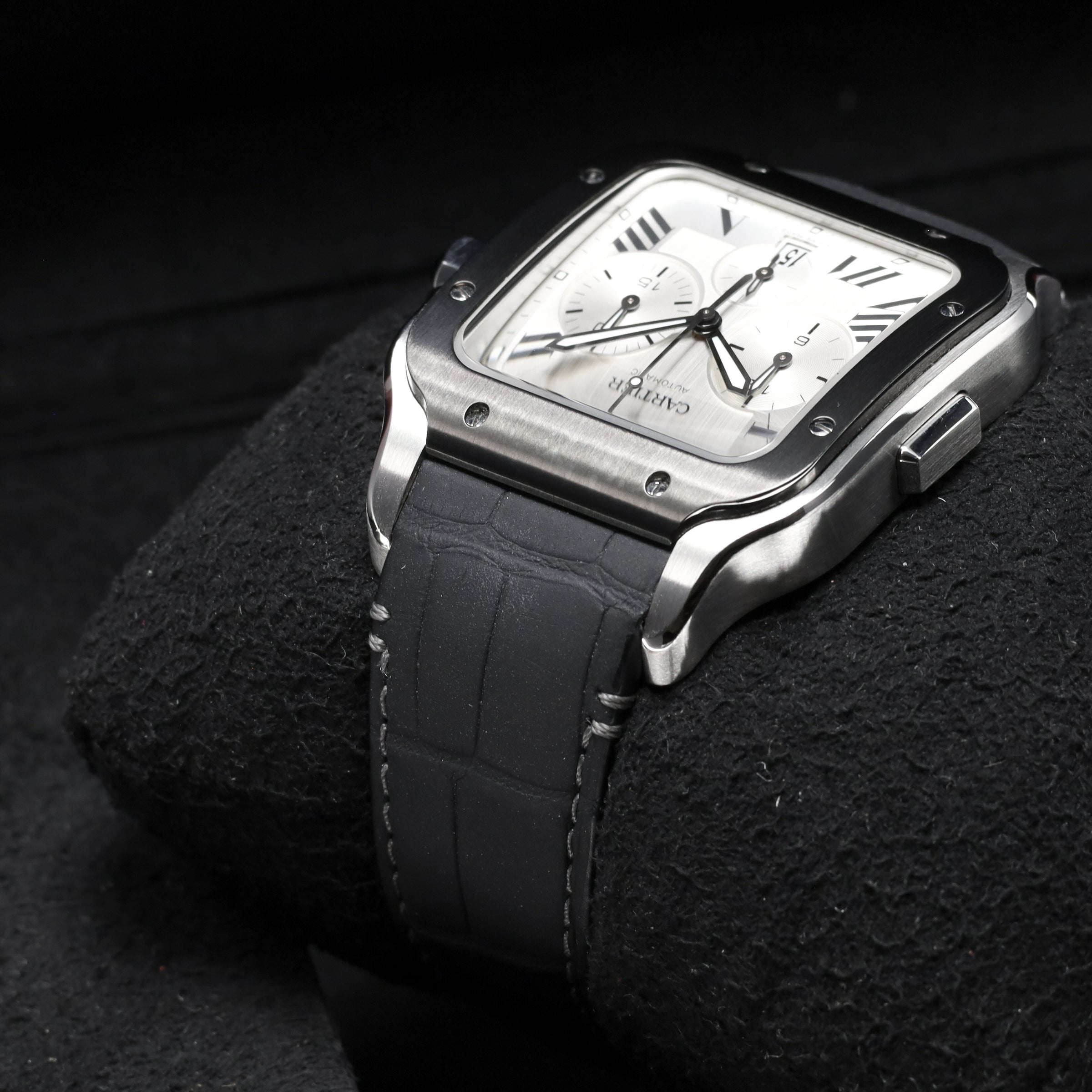 Up for sale today is one of Cartier's most iconic and wearable timepieces, the Santos De Cartier Chronograph White Roman Dial. This watch combines Cartier's classic luxury look with a sports model watch thanks to the black rubber strap and chronograph function.