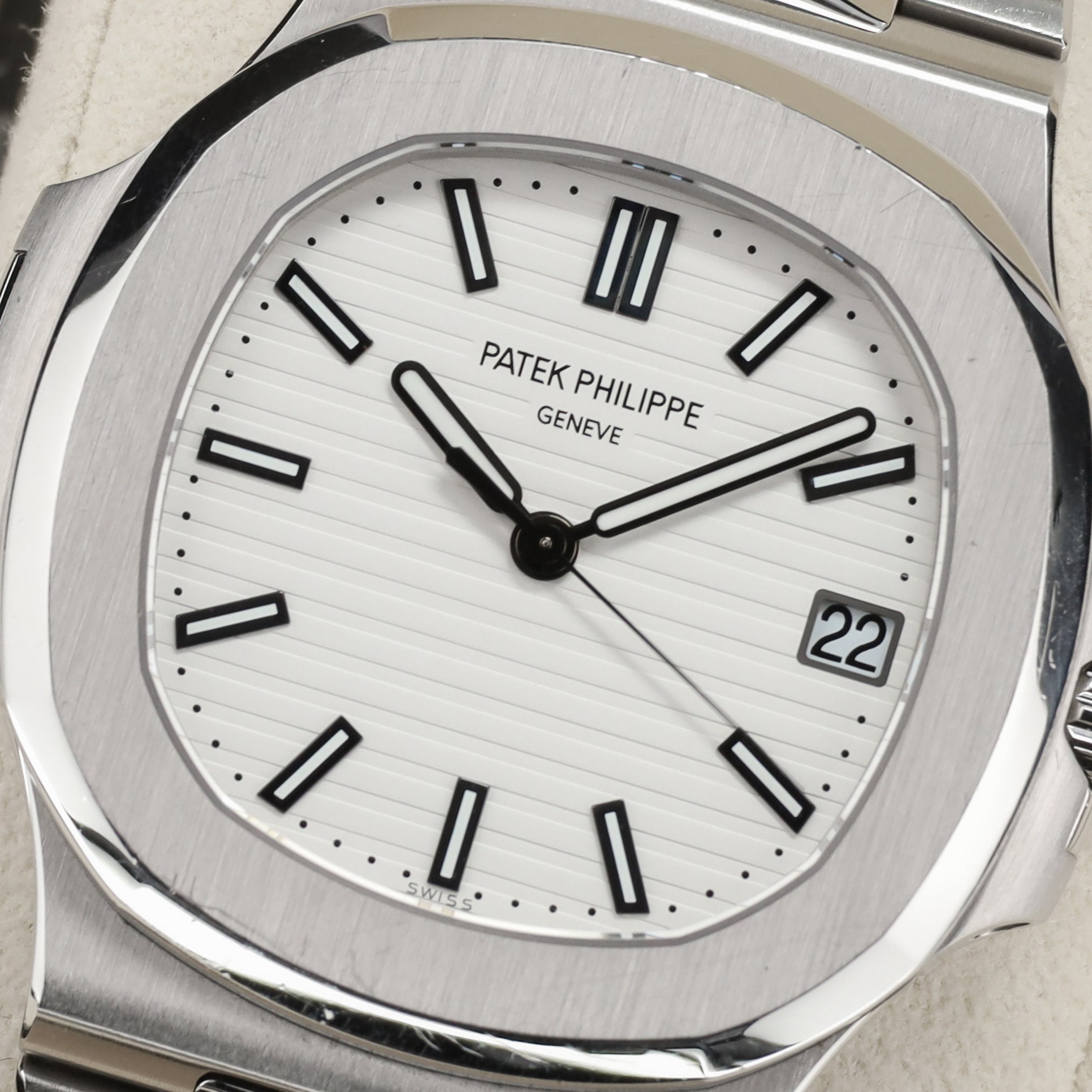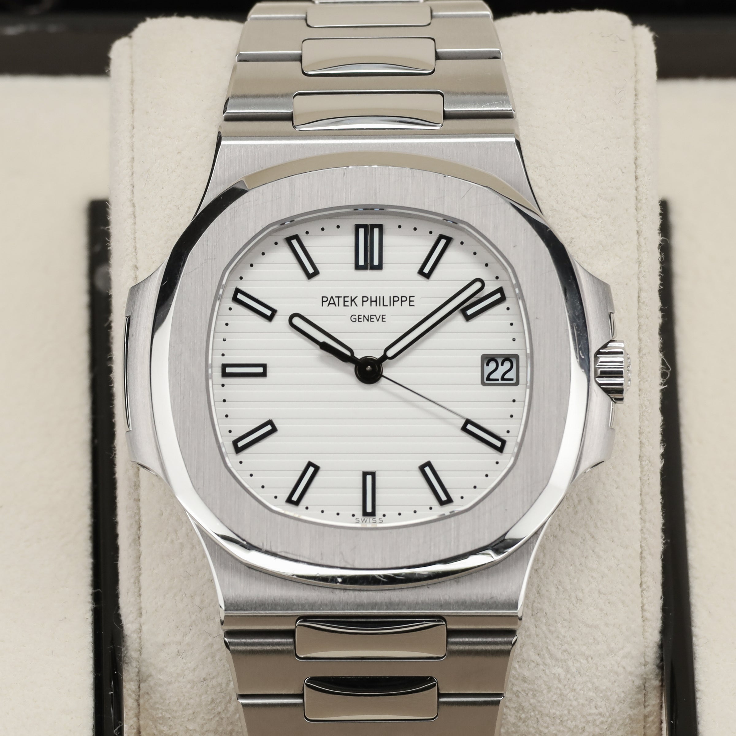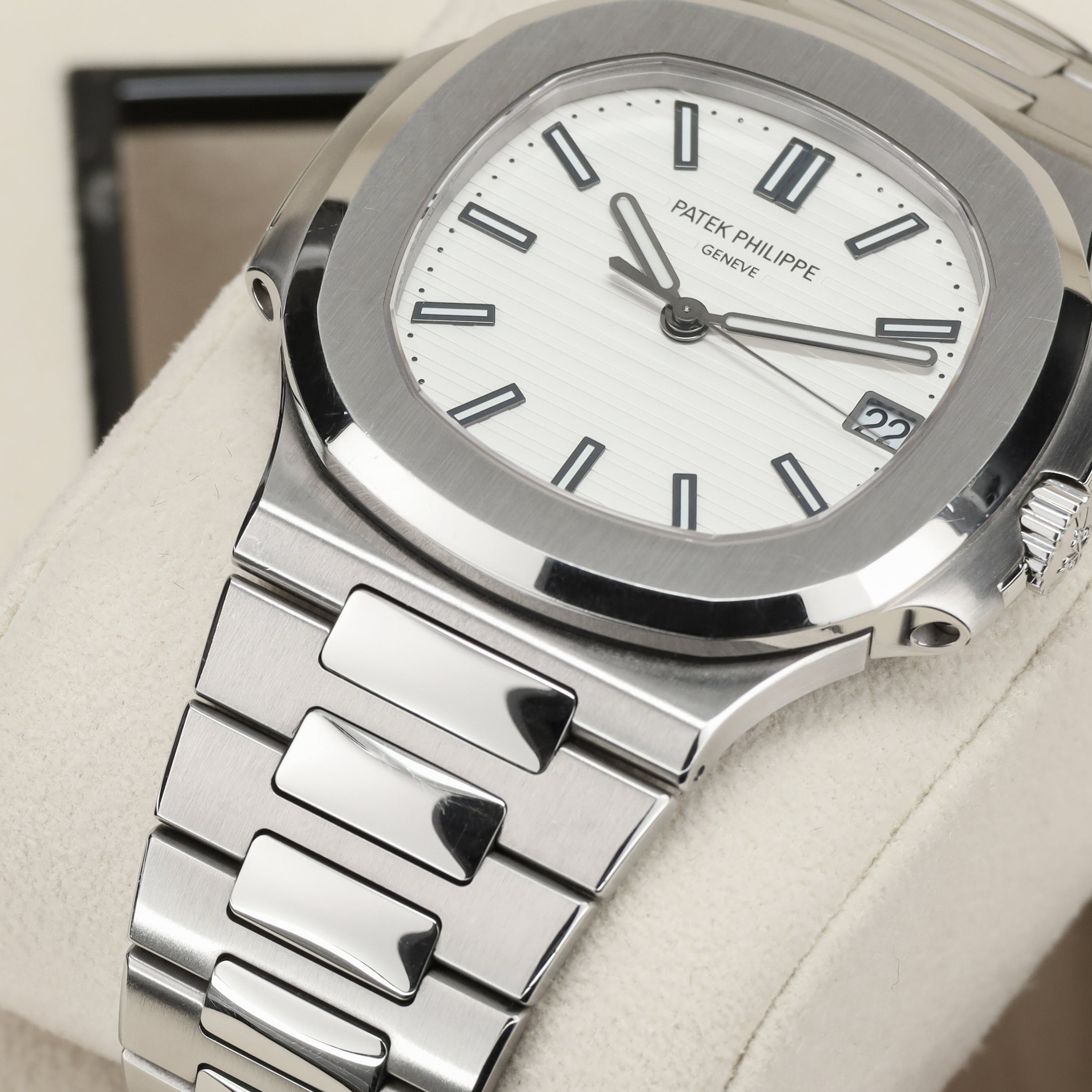 This reference features a 40mm stainless steel case with the signature rounded octagonal bezel, paired with a white dial with horizontal embossing and a date window at 3 o’clock. It is powered by the Patek Philippe Caliber 324 SC automatic movement, offering a 35–45 hour power reserve. The watch is fitted on a stainless steel integrated bracelet with a folding clasp, maintaining the original Nautilus design.