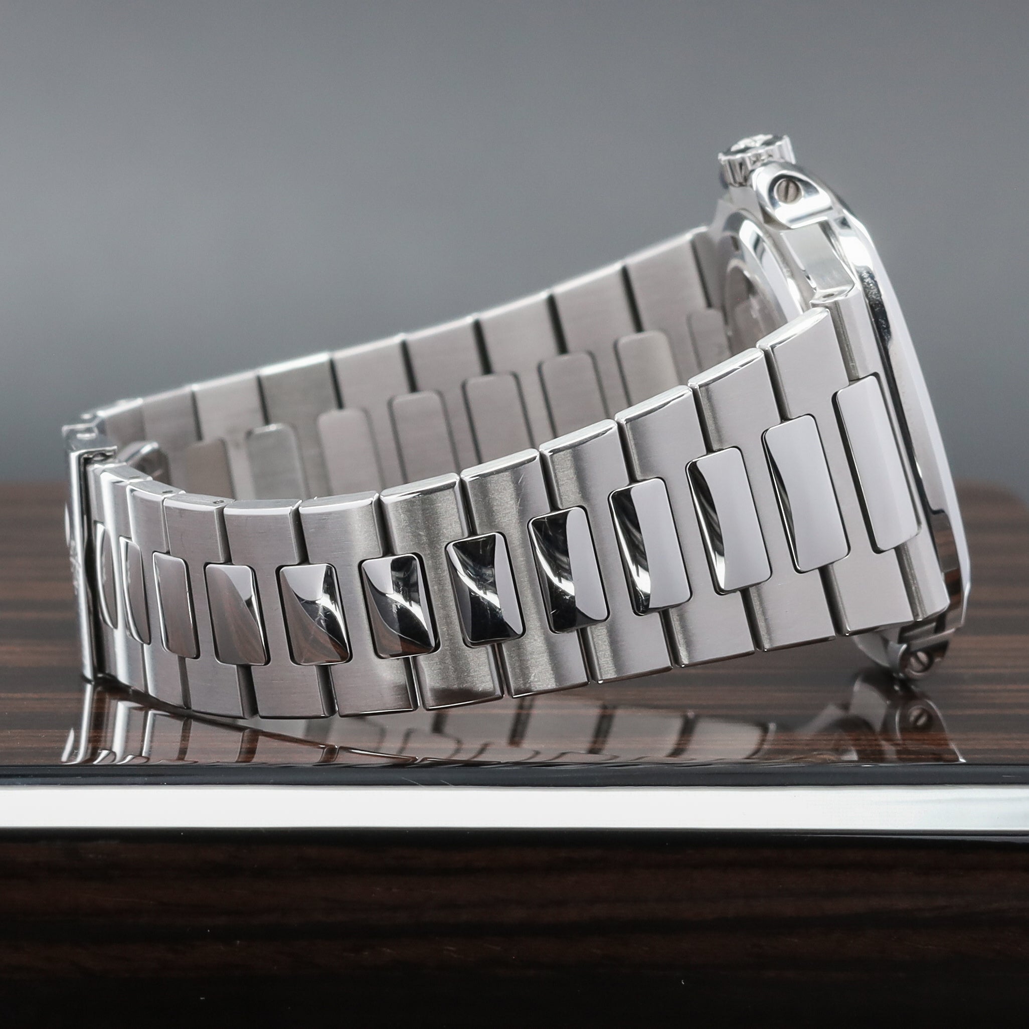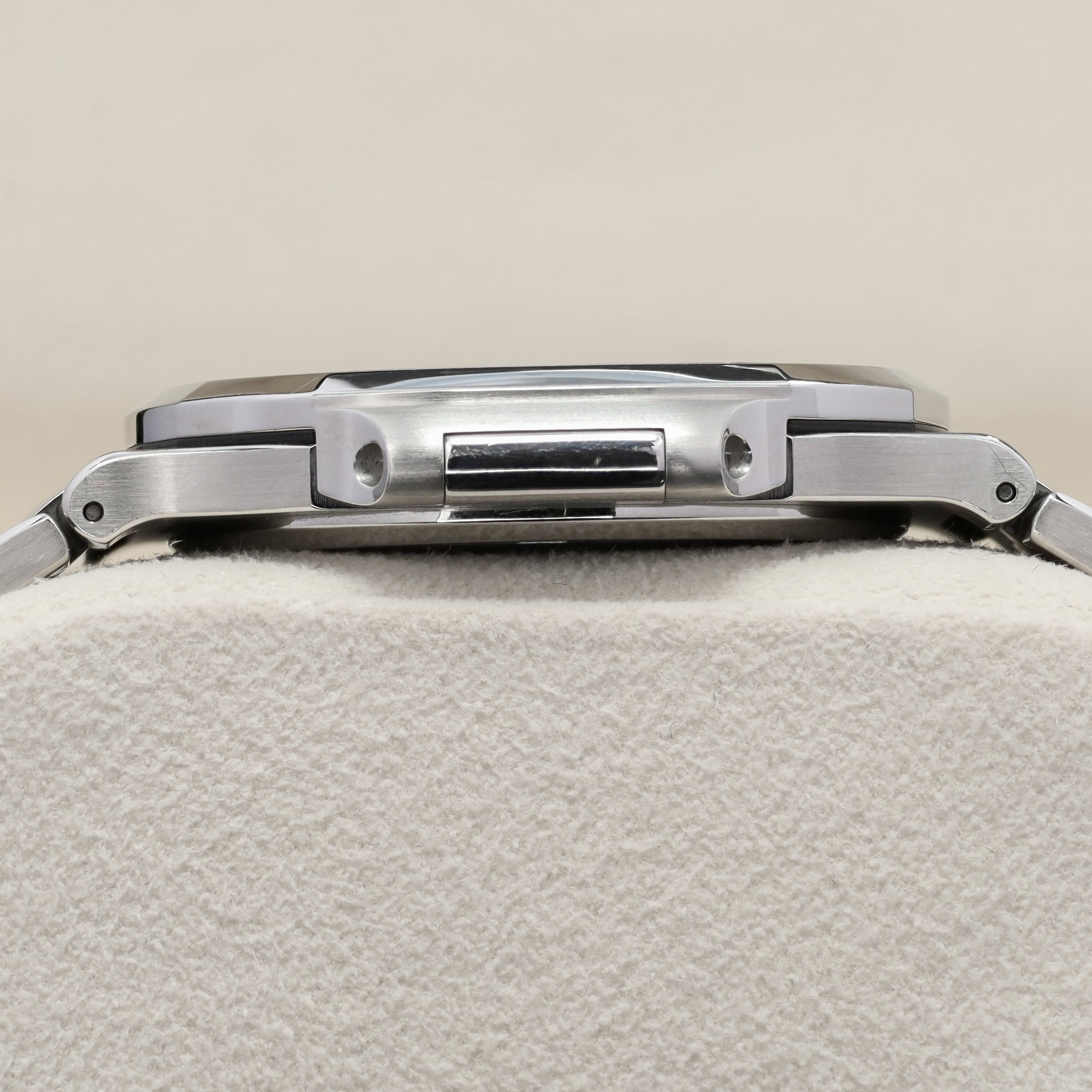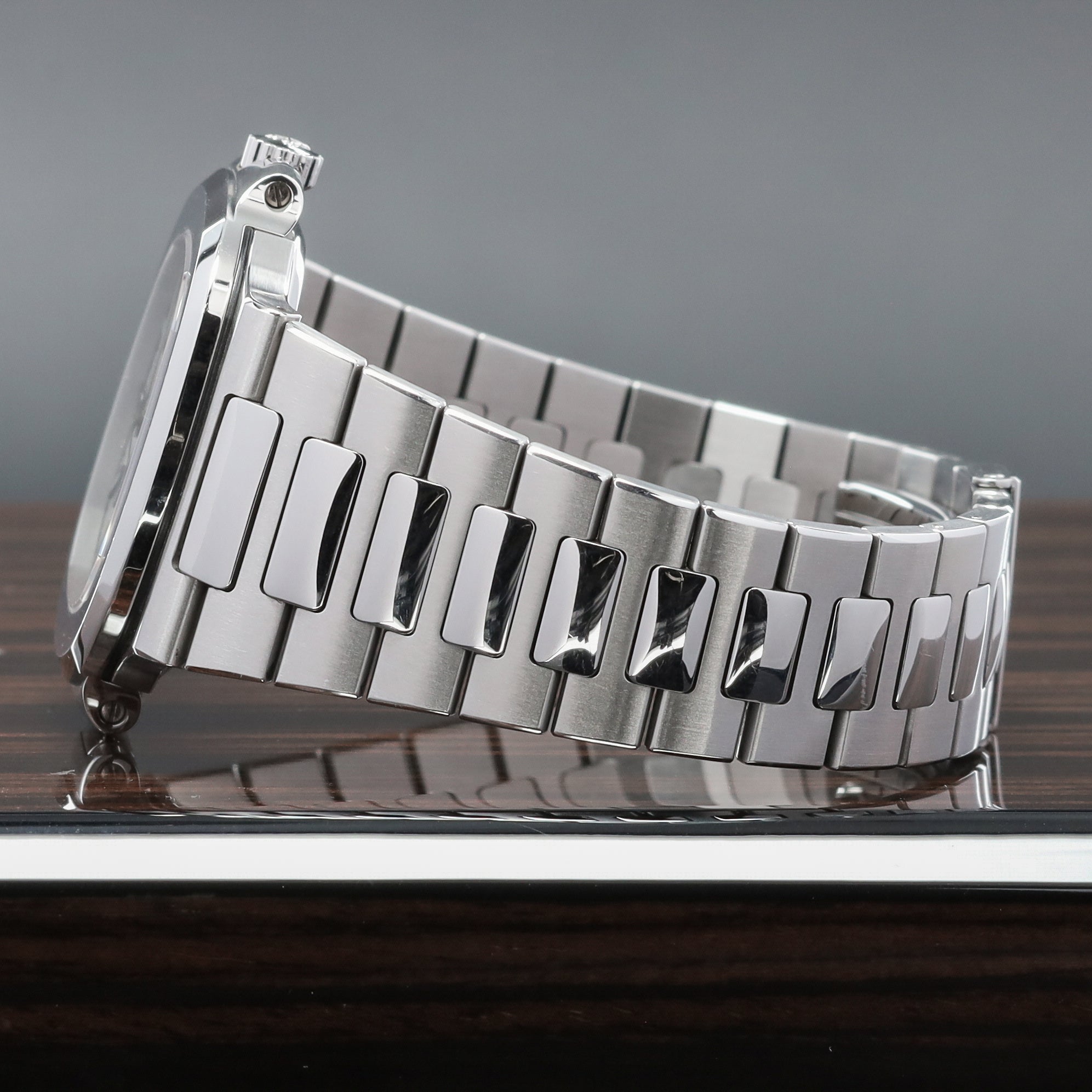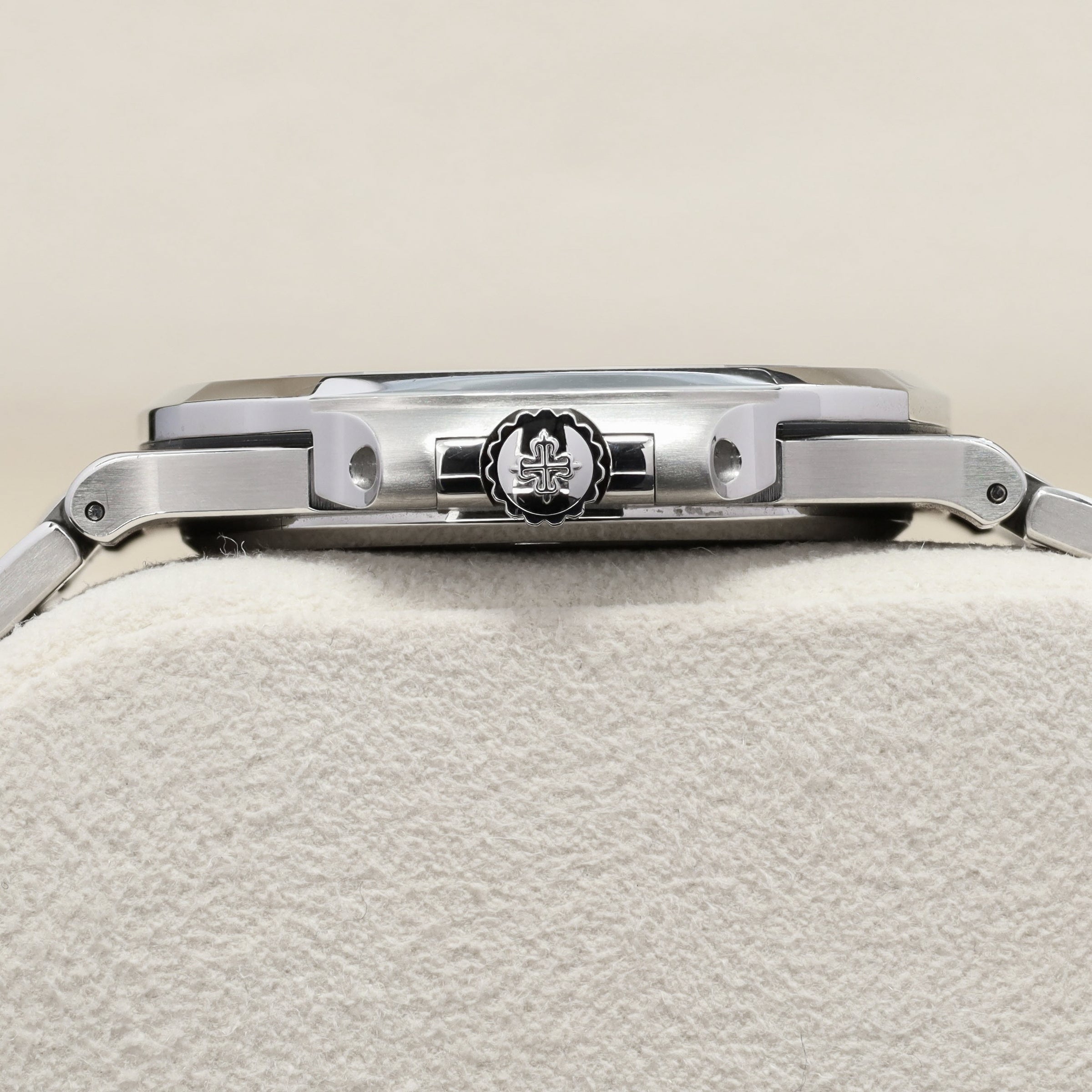 This reference features a 40mm stainless steel case with the signature rounded octagonal bezel, paired with a white dial with horizontal embossing and a date window at 3 o’clock. It is powered by the Patek Philippe Caliber 324 SC automatic movement, offering a 35–45 hour power reserve. The watch is fitted on a stainless steel integrated bracelet with a folding clasp, maintaining the original Nautilus design.
