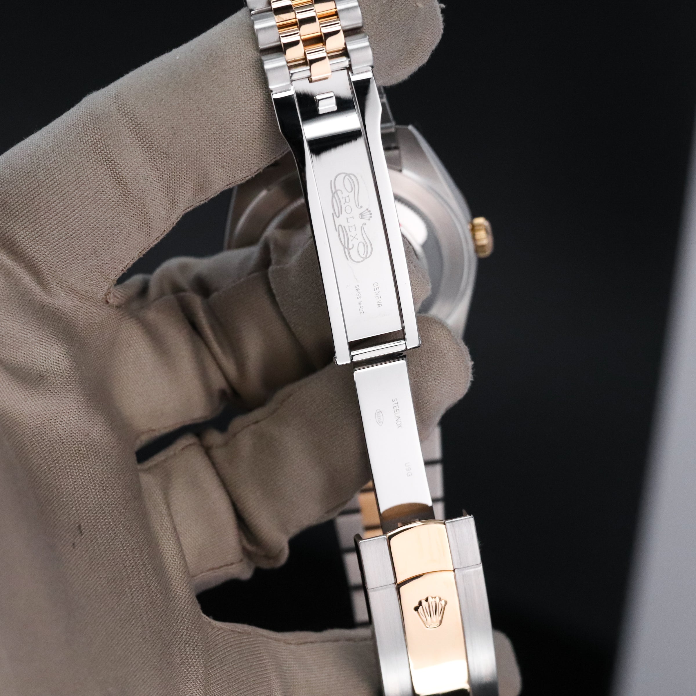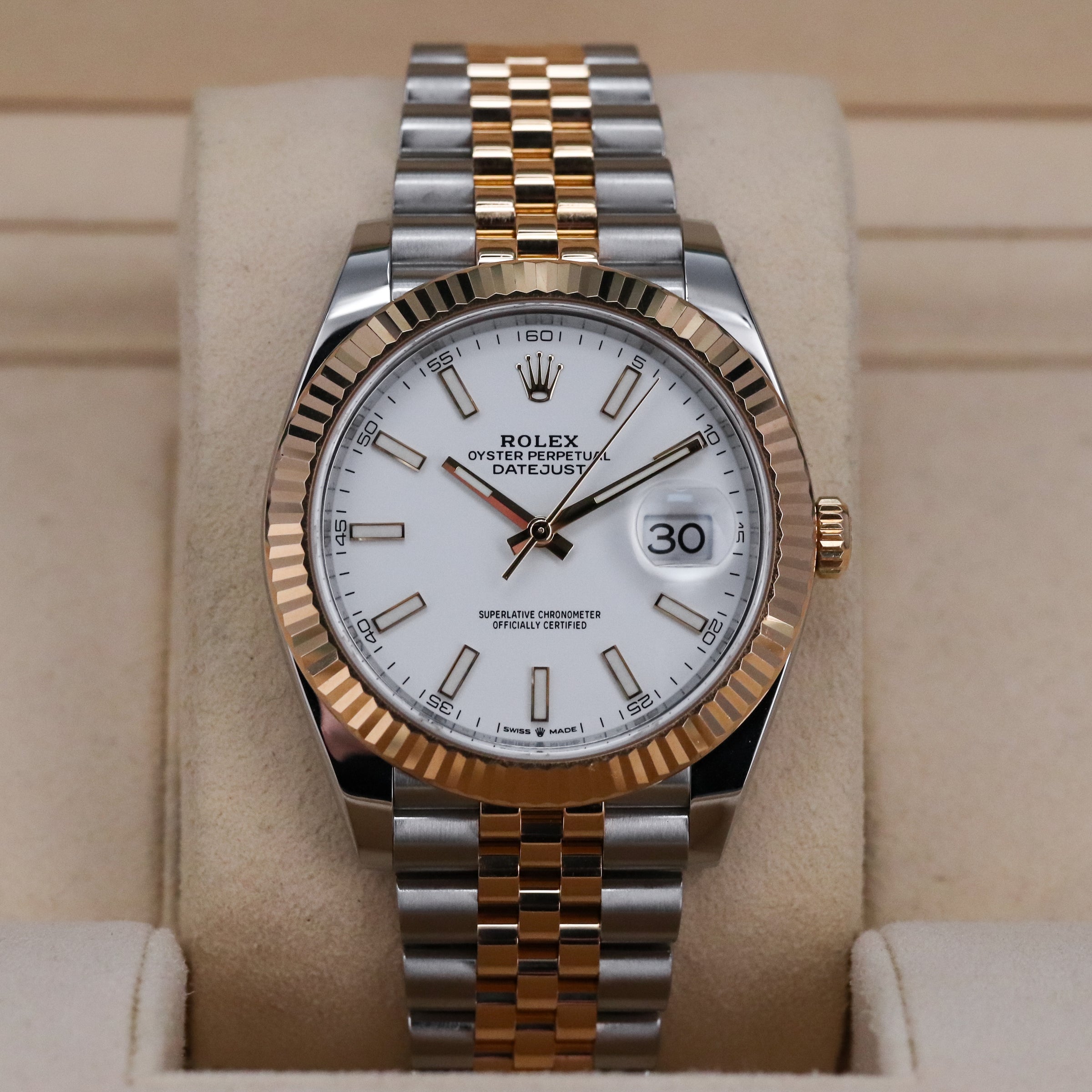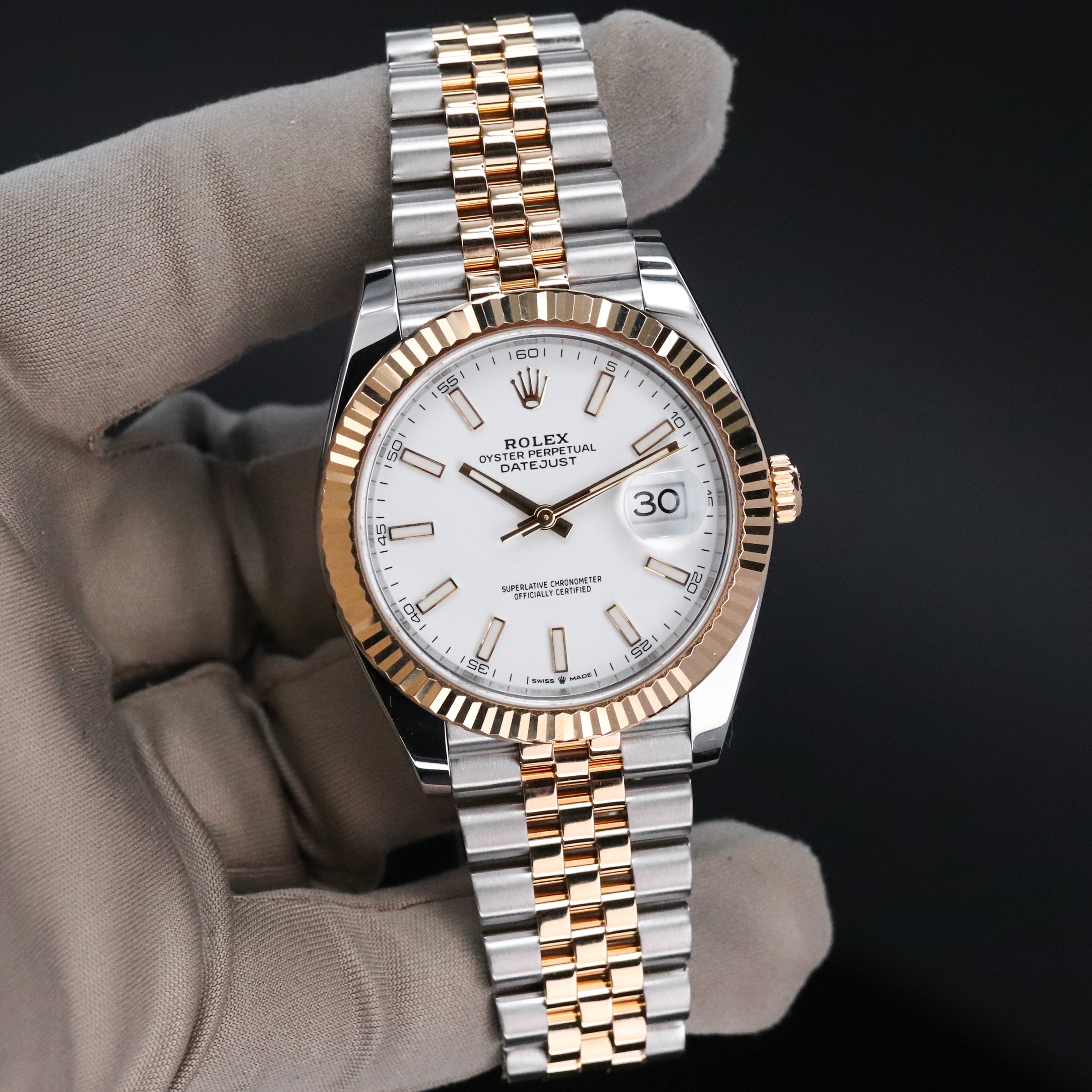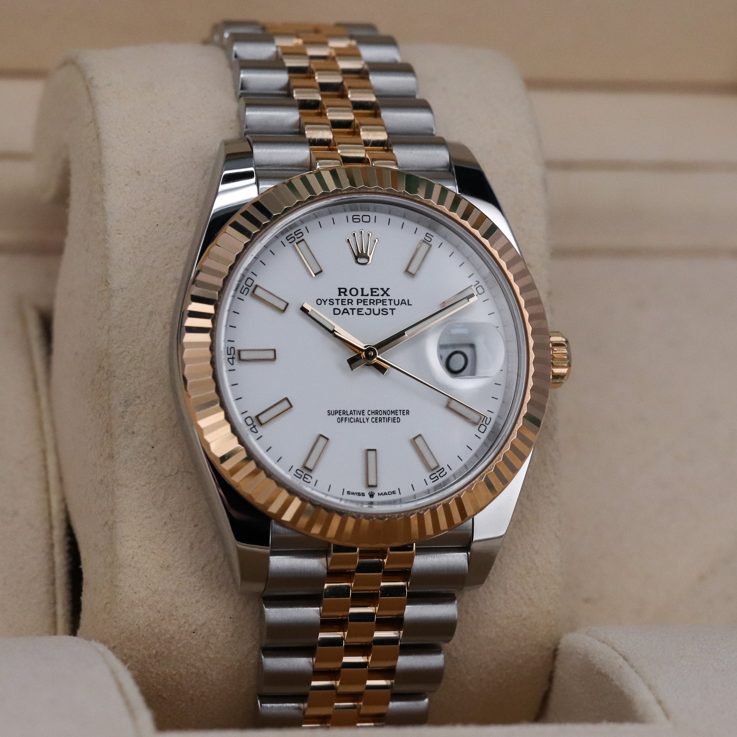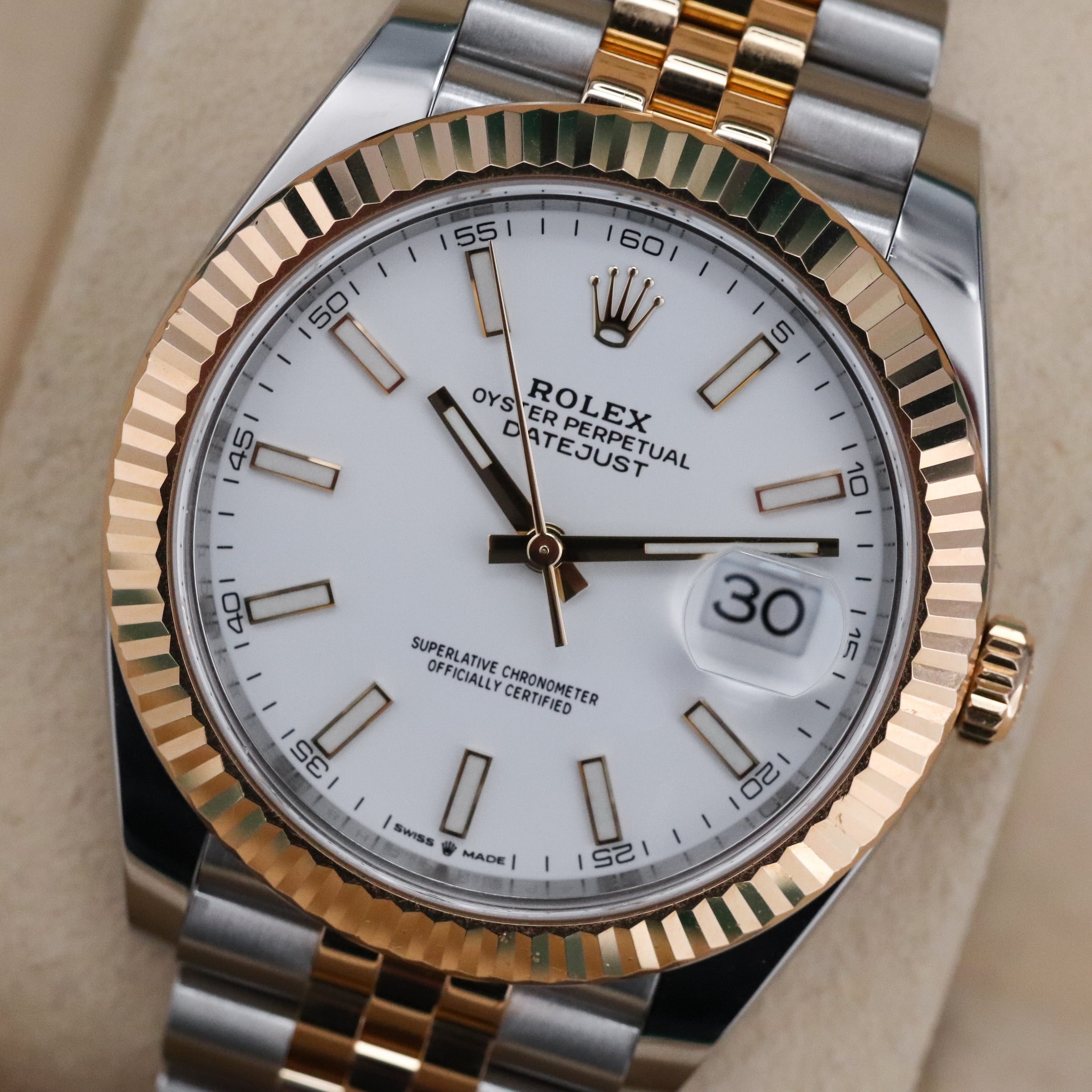 This reference features a 41mm Oystersteel and 18k yellow gold case with fluted bezel, white dial with polished yellow gold applied index hour markers with luminescent fill, and date window at 3 o'clock with Cyclops magnification. Powered by Rolex in-house with 70-hour power reserve and 100-meter water resistance. The watch is fitted with the Jubilee, a supple and comfortable five-piece link metal bracelet designed especially for the launch of the Oyster Perpetual Datejust in 1945.