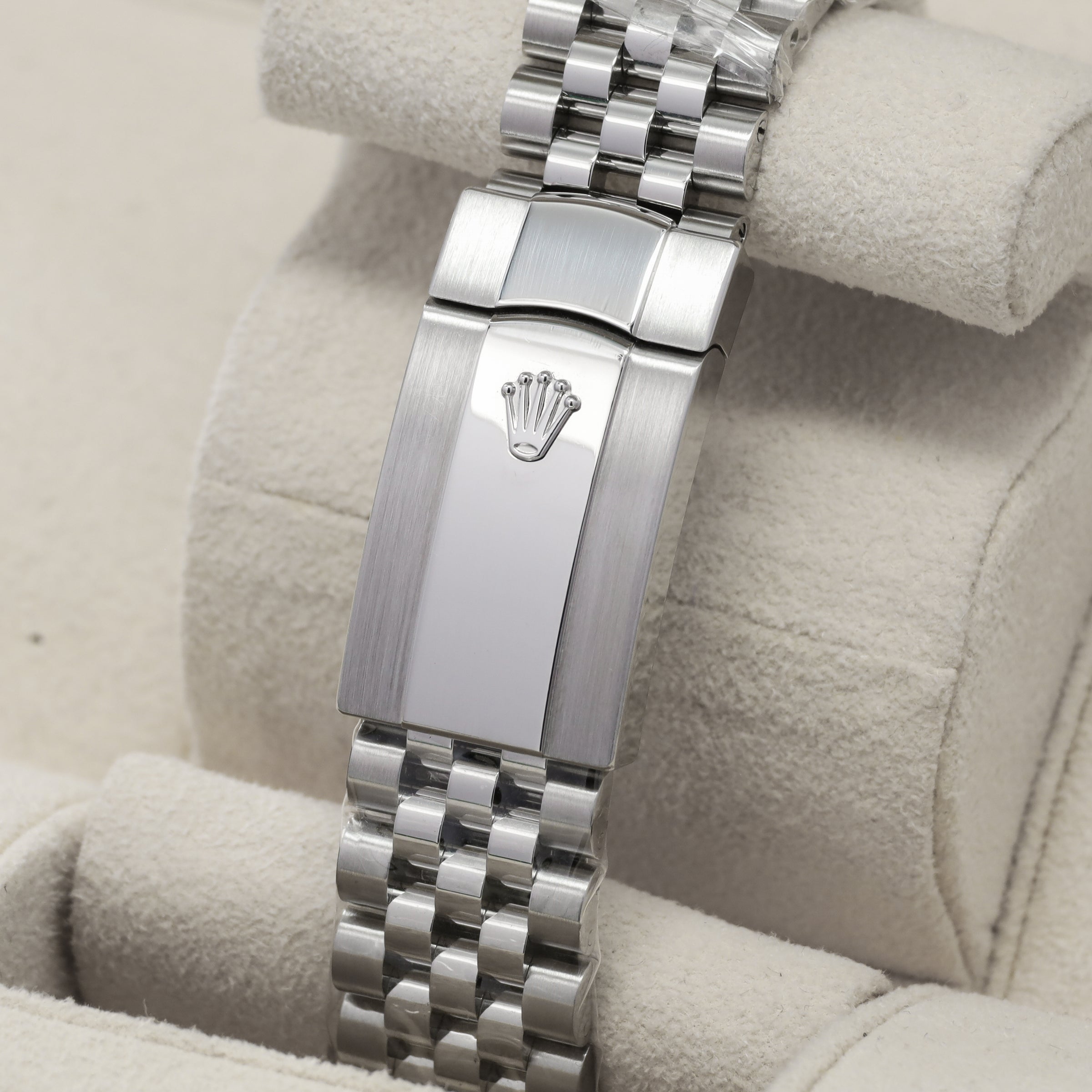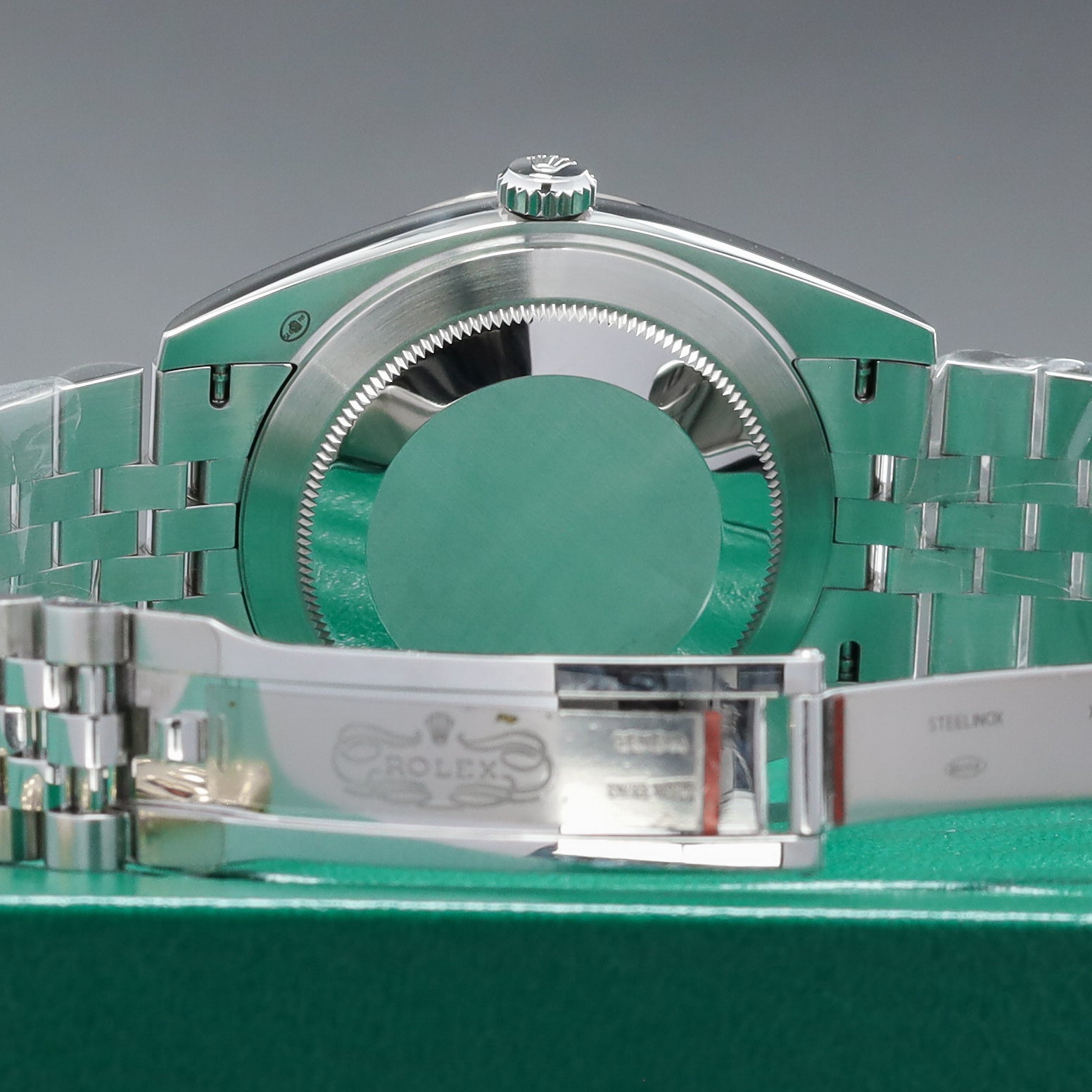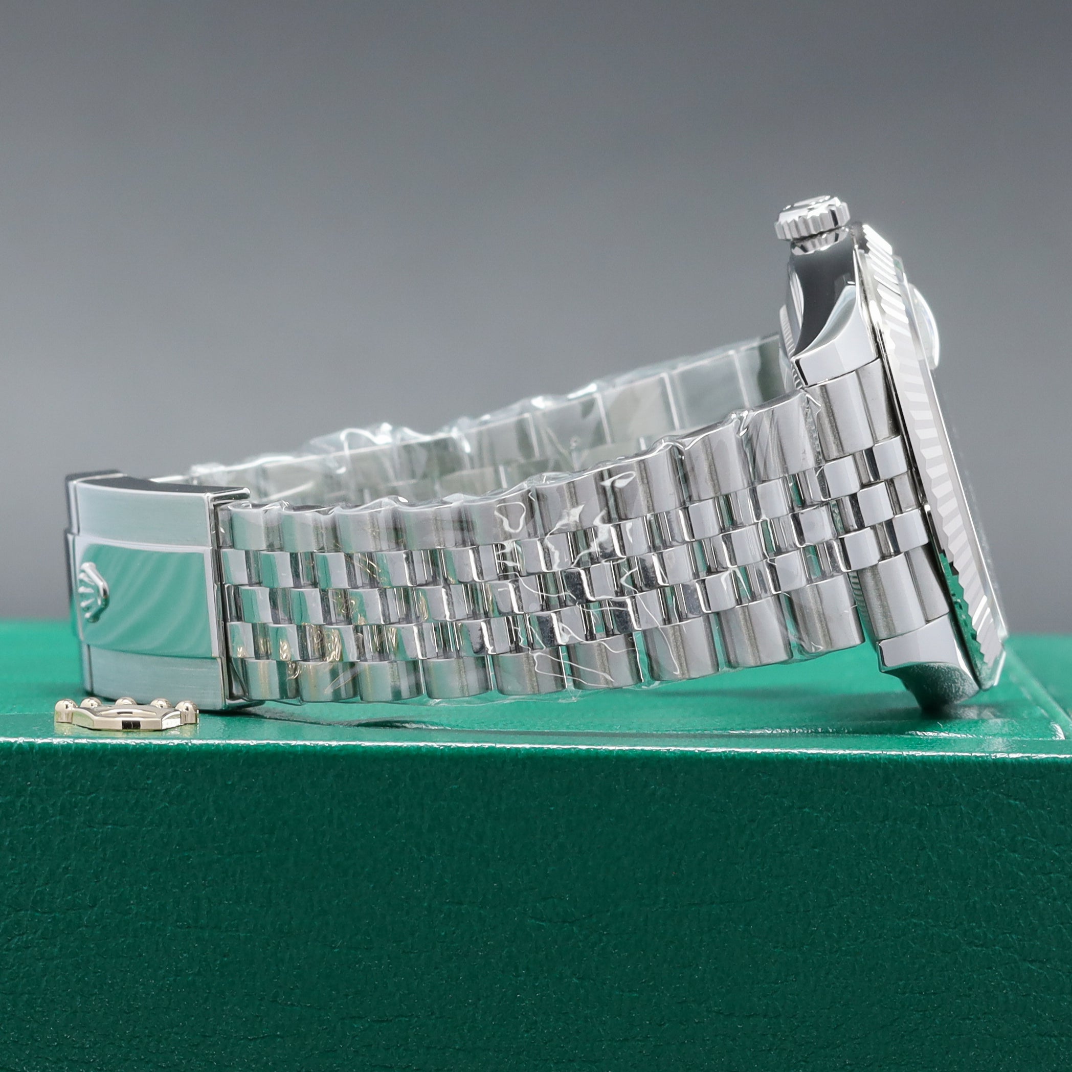 This reference features a 41mm Oystersteel case with an 18k white gold fluted bezel, paired with a green motif dial with applied hour markers and a date window at 3 o’clock. It is powered by the Rolex Caliber 3235 automatic movement, offering a 70-hour power reserve and improved efficiency. The watch is fitted on a Jubilee bracelet with a concealed Crownclasp, giving it a more refined and continuous look on the wrist.