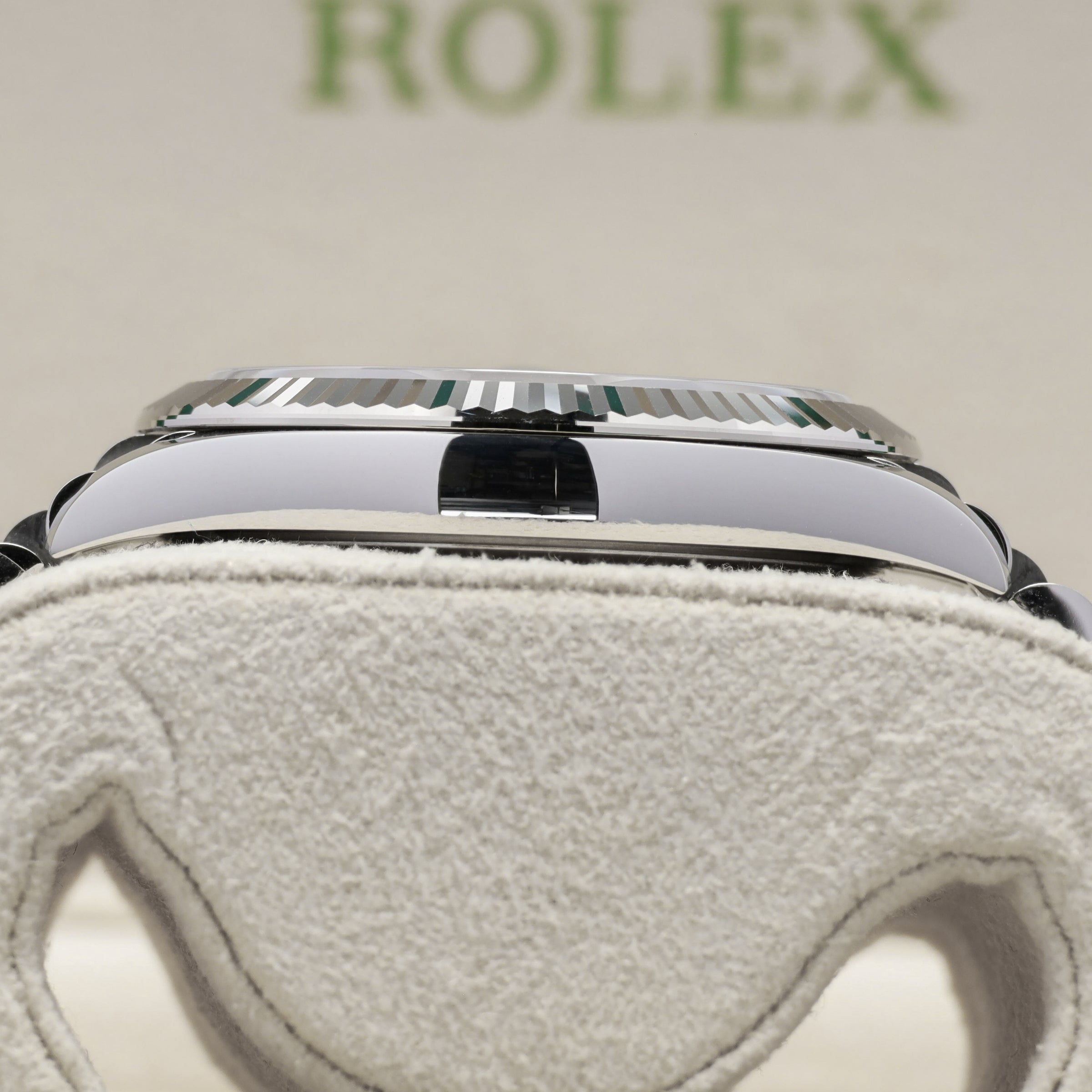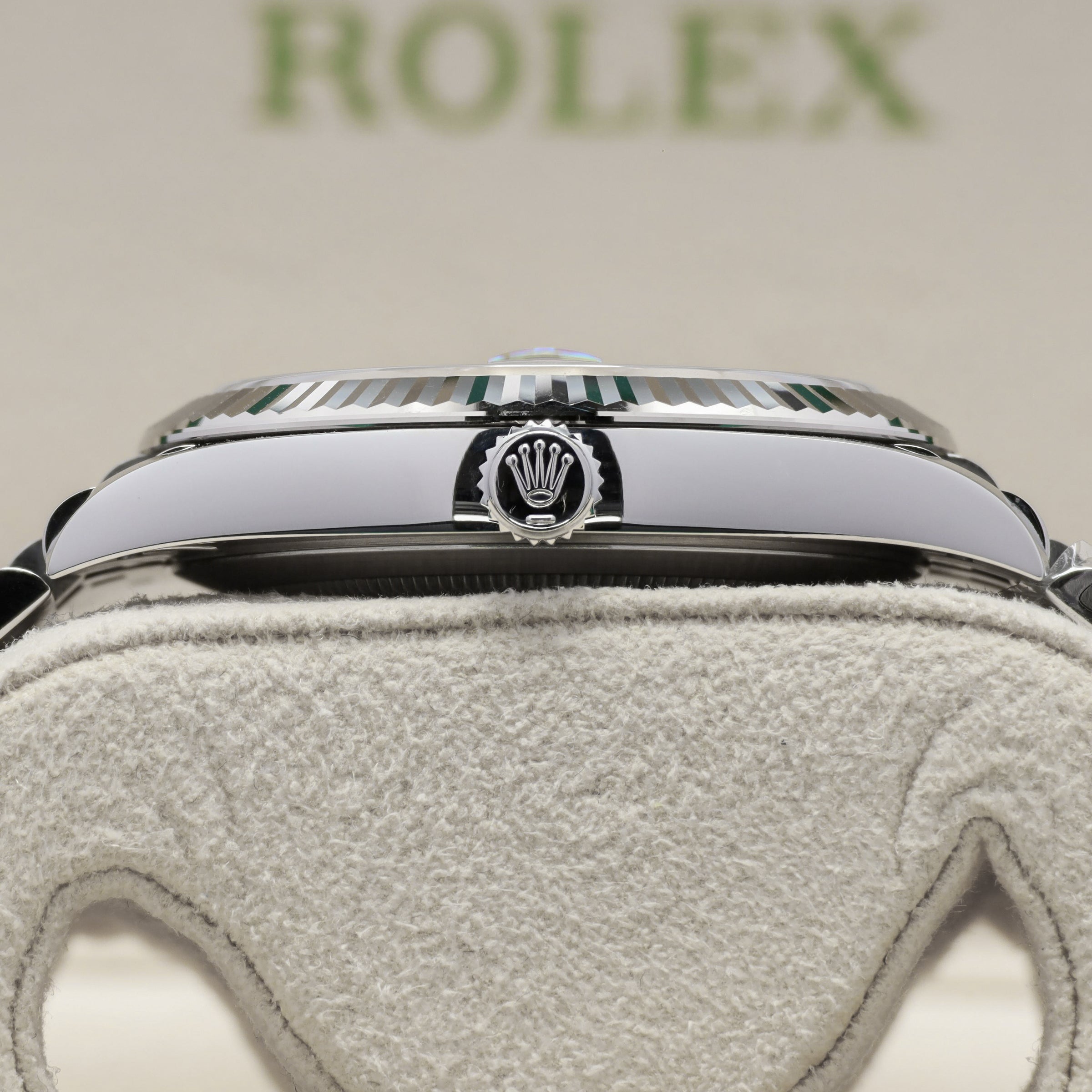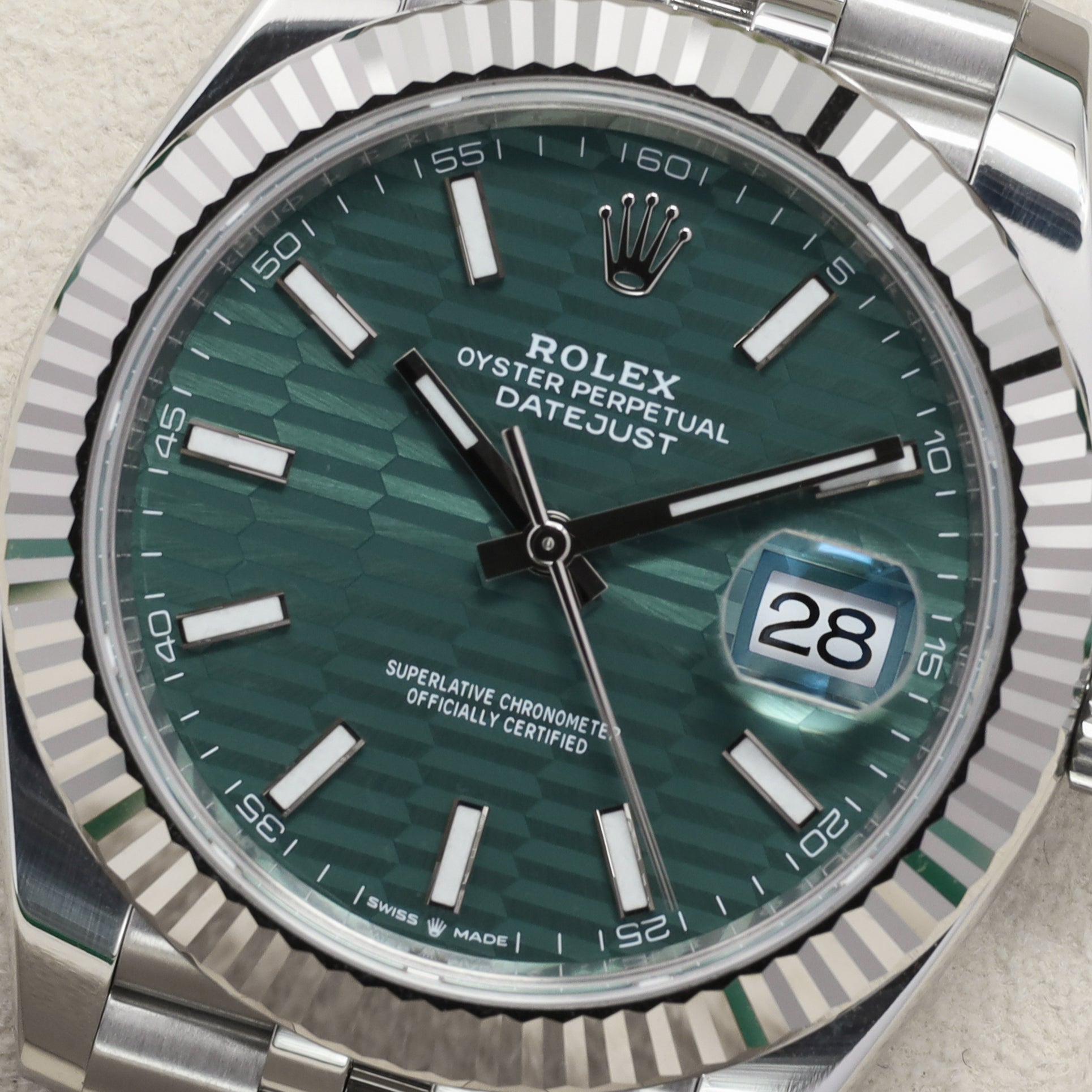 One of the more recent Datejust dial variations to gain attention, the green motif dial on the 126334 stands out for its patterned design that shifts depending on light. The combination of the green dial with the fluted white gold bezel gives it a stronger presence compared to standard smooth bezel configurations. It’s a newer release that’s been moving quickly, especially with buyers looking for something different within the Datejust line.