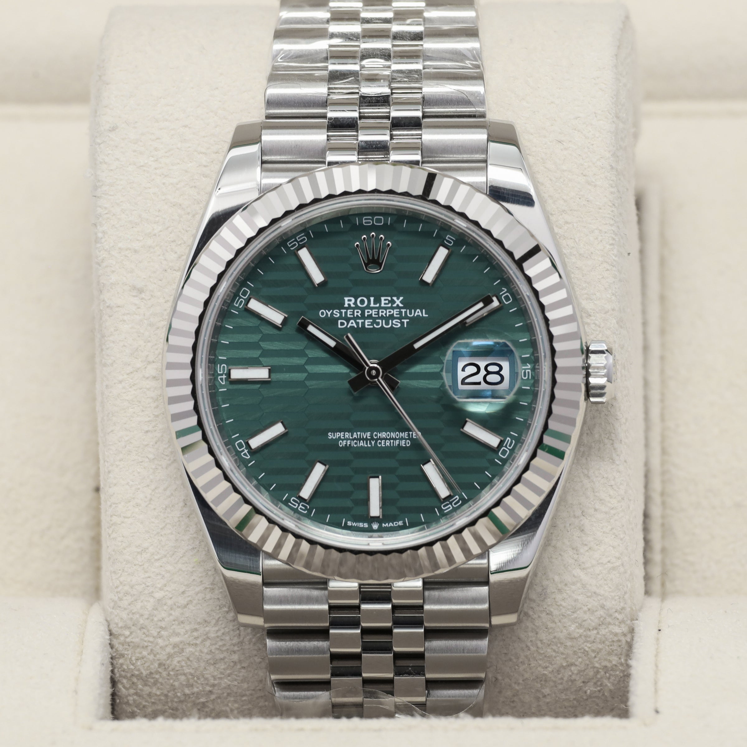 Rolex DateJust 2024 Complete 41mm Oystersteel Green Motif 18k White Gold Fluted Bezel Jubilee Bracelet 126334