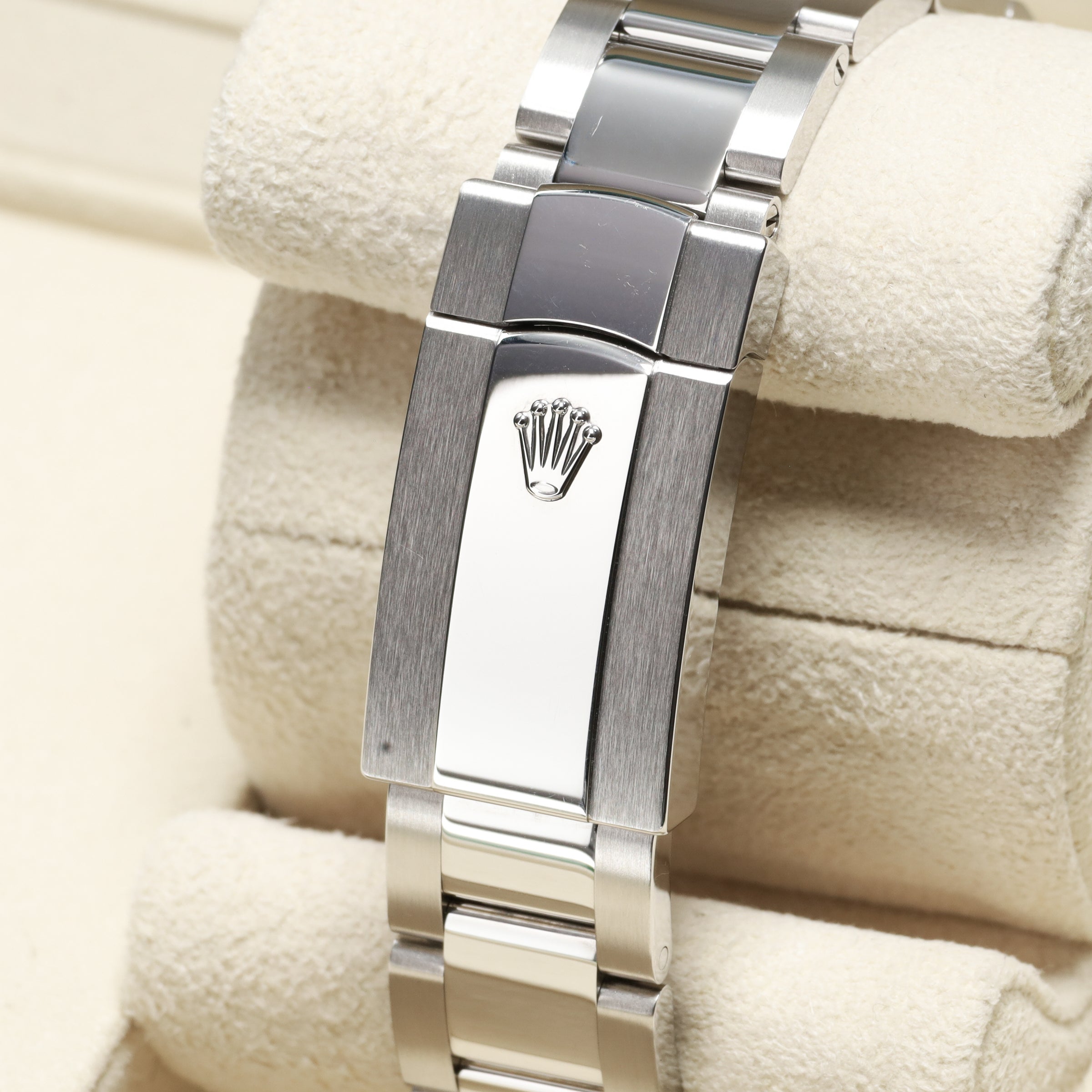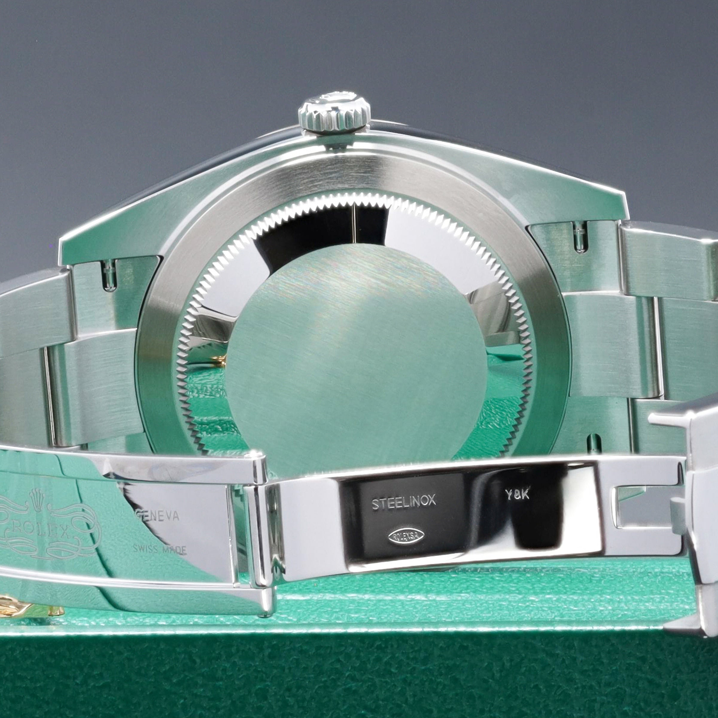 This reference features a 41mm stainless steel case with an 18k white gold fluted bezel surrounding the blue Roman dial with a date display at three o’clock. It’s powered by the Rolex Caliber 3235 automatic movement, offering a 70-hour power reserve. The watch is fitted on a stainless steel Oyster bracelet with a folding Oysterclasp and Easylink extension system.