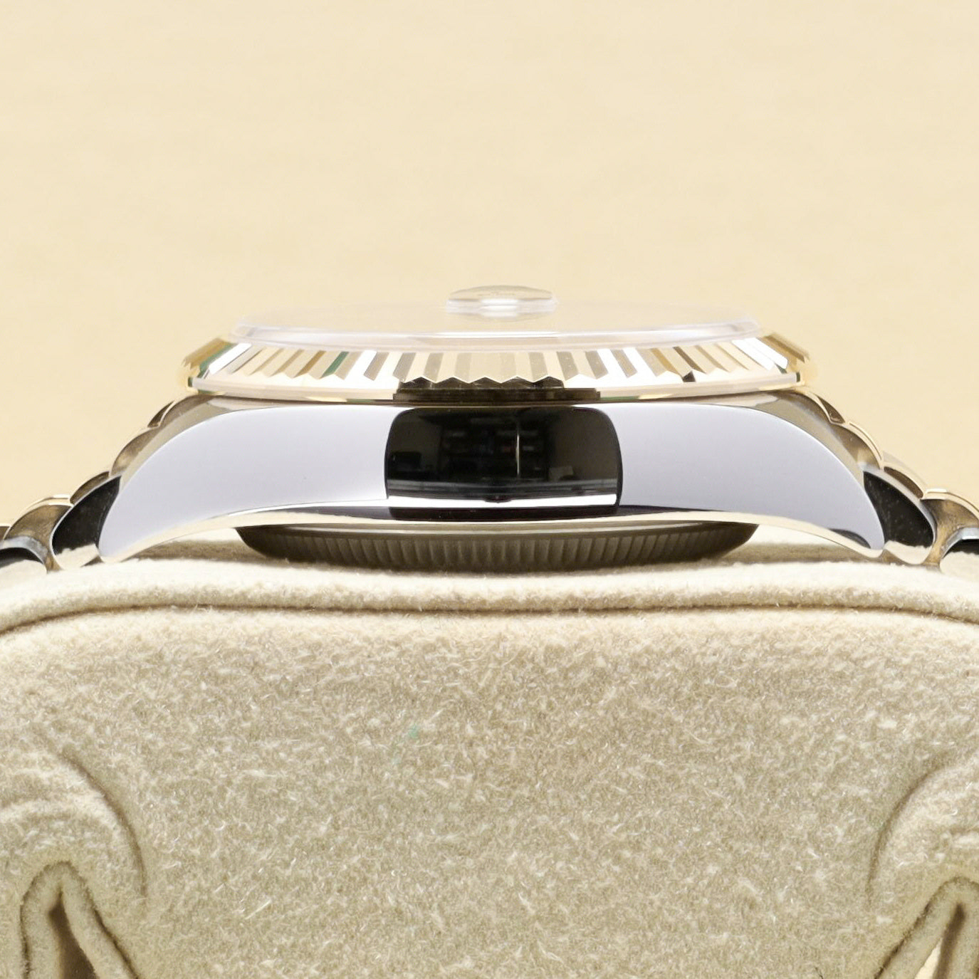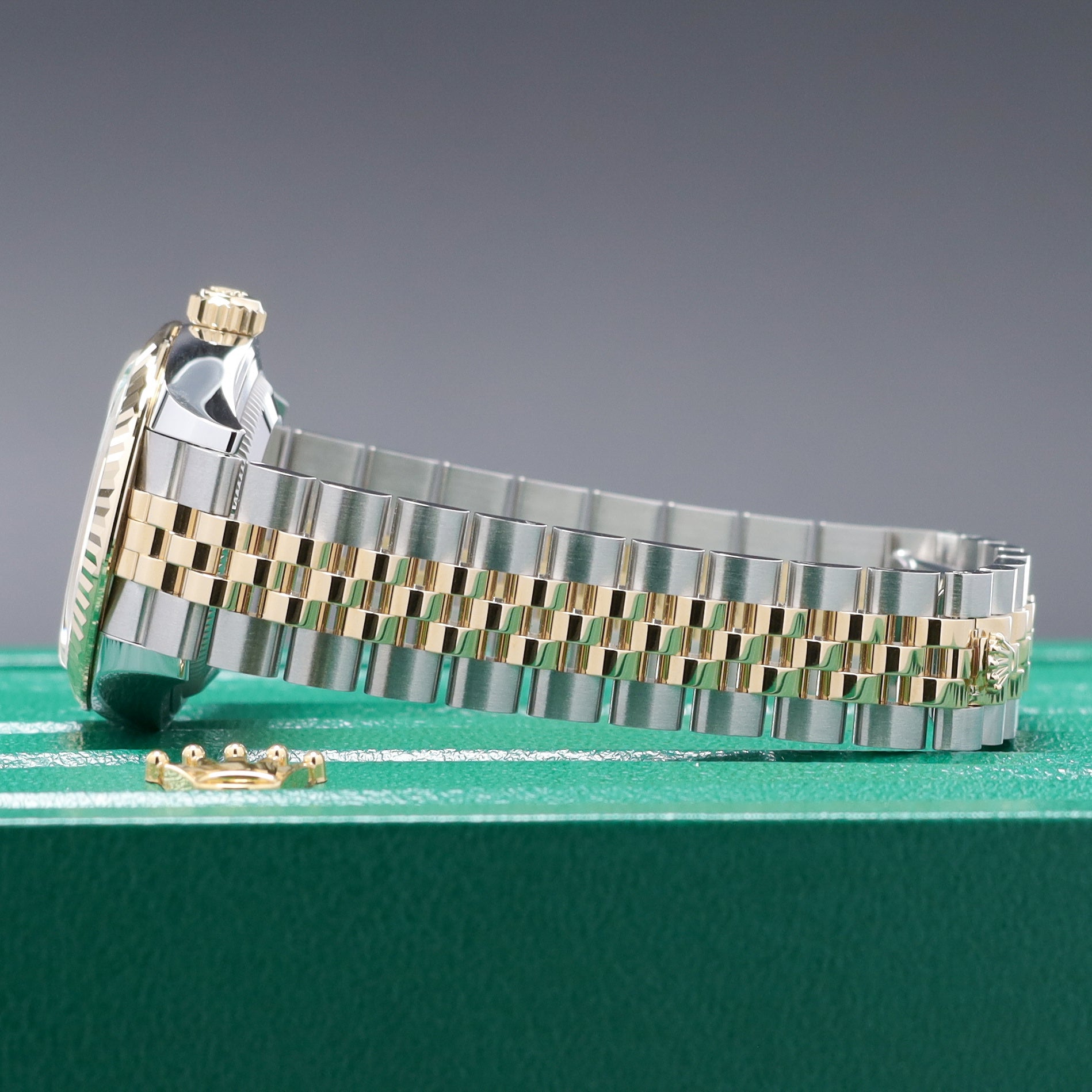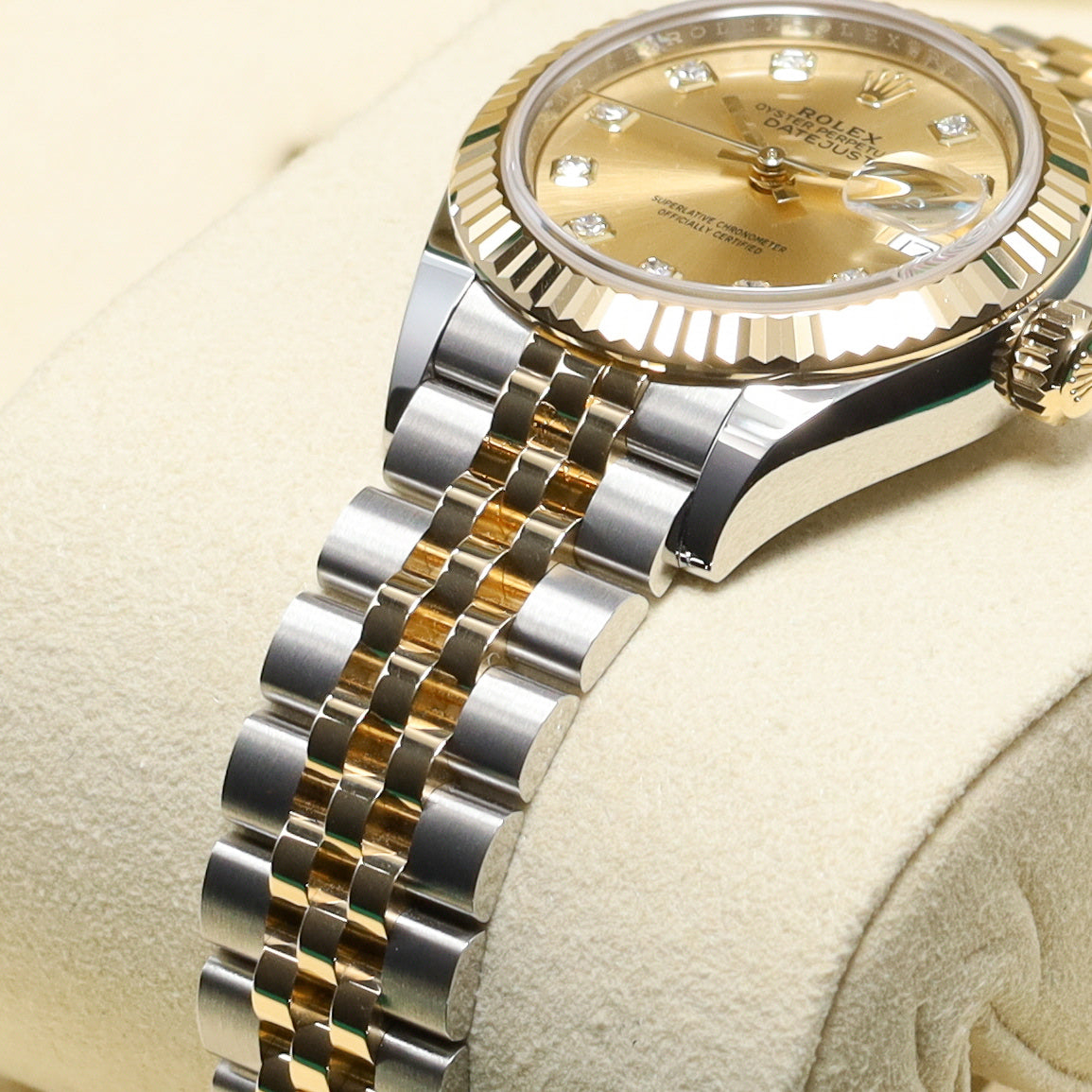 This reference features a 28mm Oystersteel and yellow gold case with a fluted bezel and a champagne dial set with diamond hour markers and a date window at 3 o’clock. It is powered by the Rolex Caliber 2236 automatic movement, offering a 55-hour power reserve and Rolex’s Syloxi silicon hairspring. The watch is fitted on a two-tone Jubilee bracelet with a concealed Crownclasp for a clean, seamless finish on the wrist.