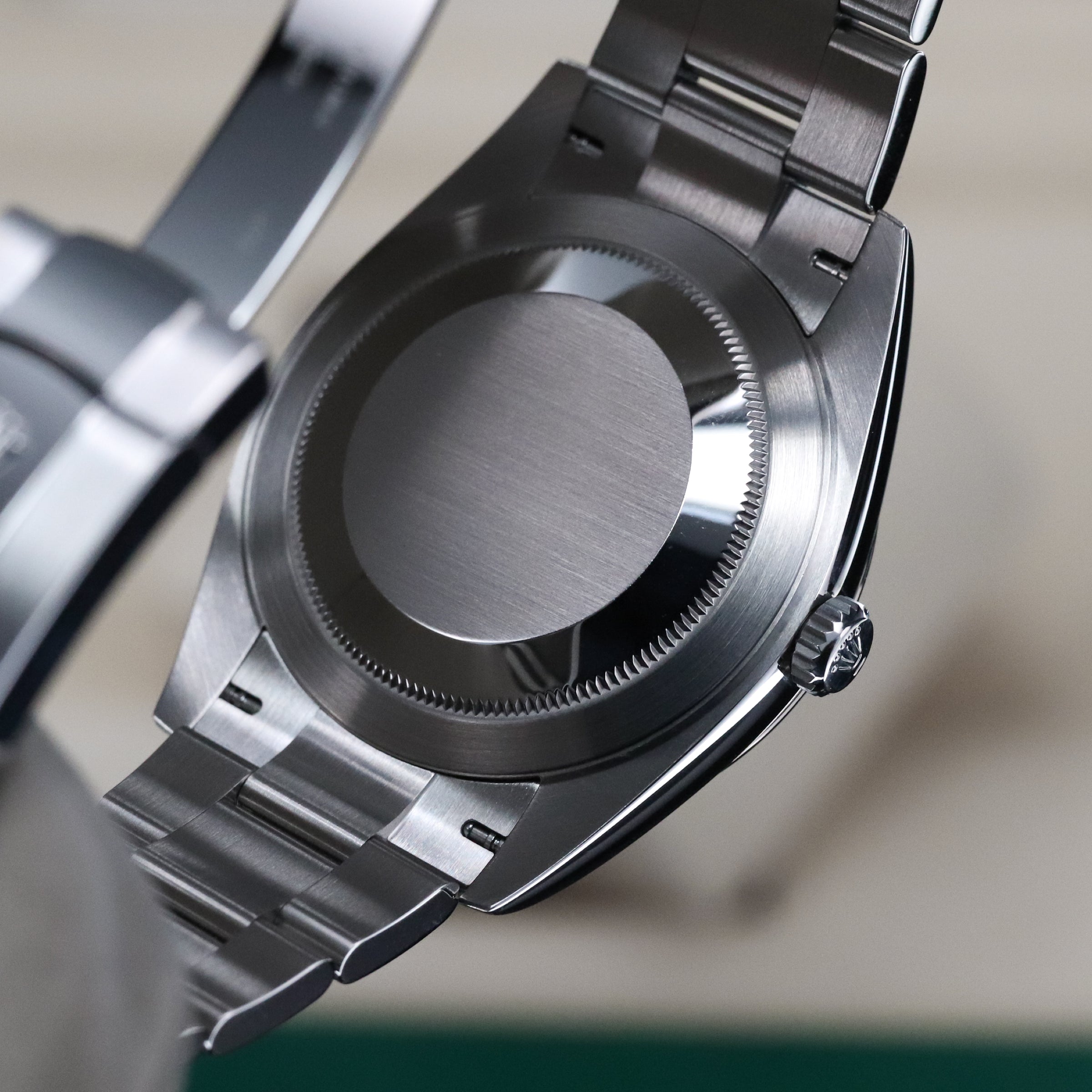 This model features a 41mm stainless steel case, an 18k white gold fluted bezel, and a white sunburst dial with applied stick indices. It’s fitted on the Oyster bracelet with brushed outer links and polished center links, secured by the Oysterclasp.