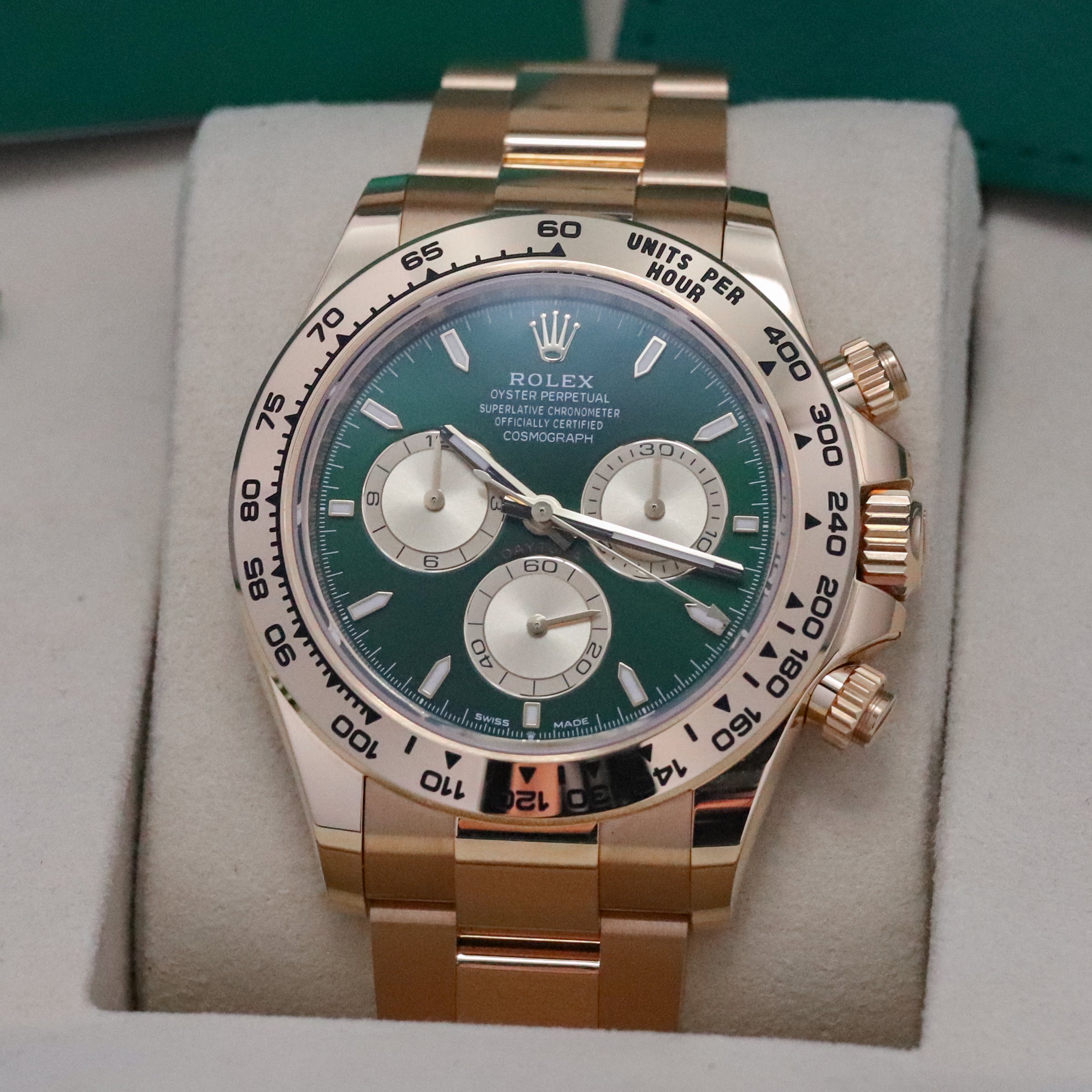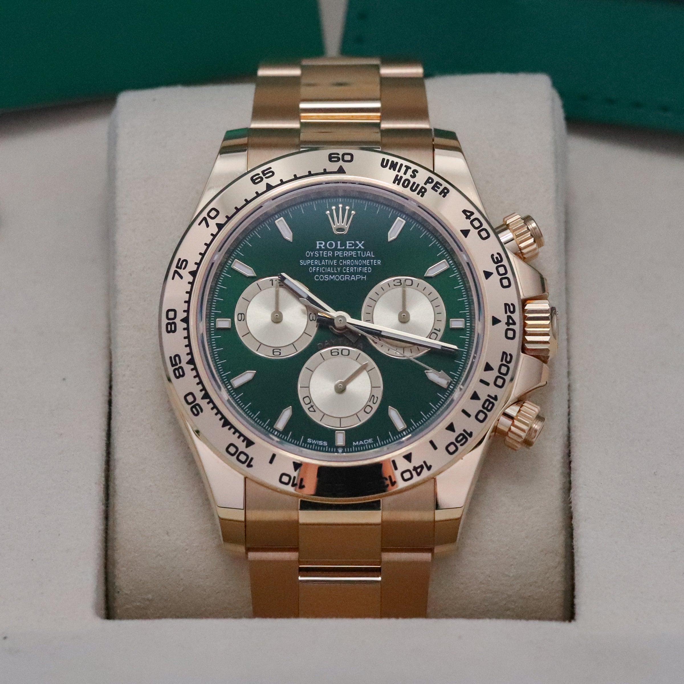 This reference features a 40mm 18k yellow gold case, an 18k yellow gold bezel with engraved tachymetric scale, and a bright green sunburst dial with gold-appliqué hour markers and spray-coated sub-dials. Powered by the Calibre 4131 automatic chronograph movement, it offers a 72-hour power reserve and high-performance timing precision. The watch is fitted with the yellow gold Oyster bracelet and secured by the Oysterlock clasp, blending luxury metal finish with the Daytona’s functional cred.