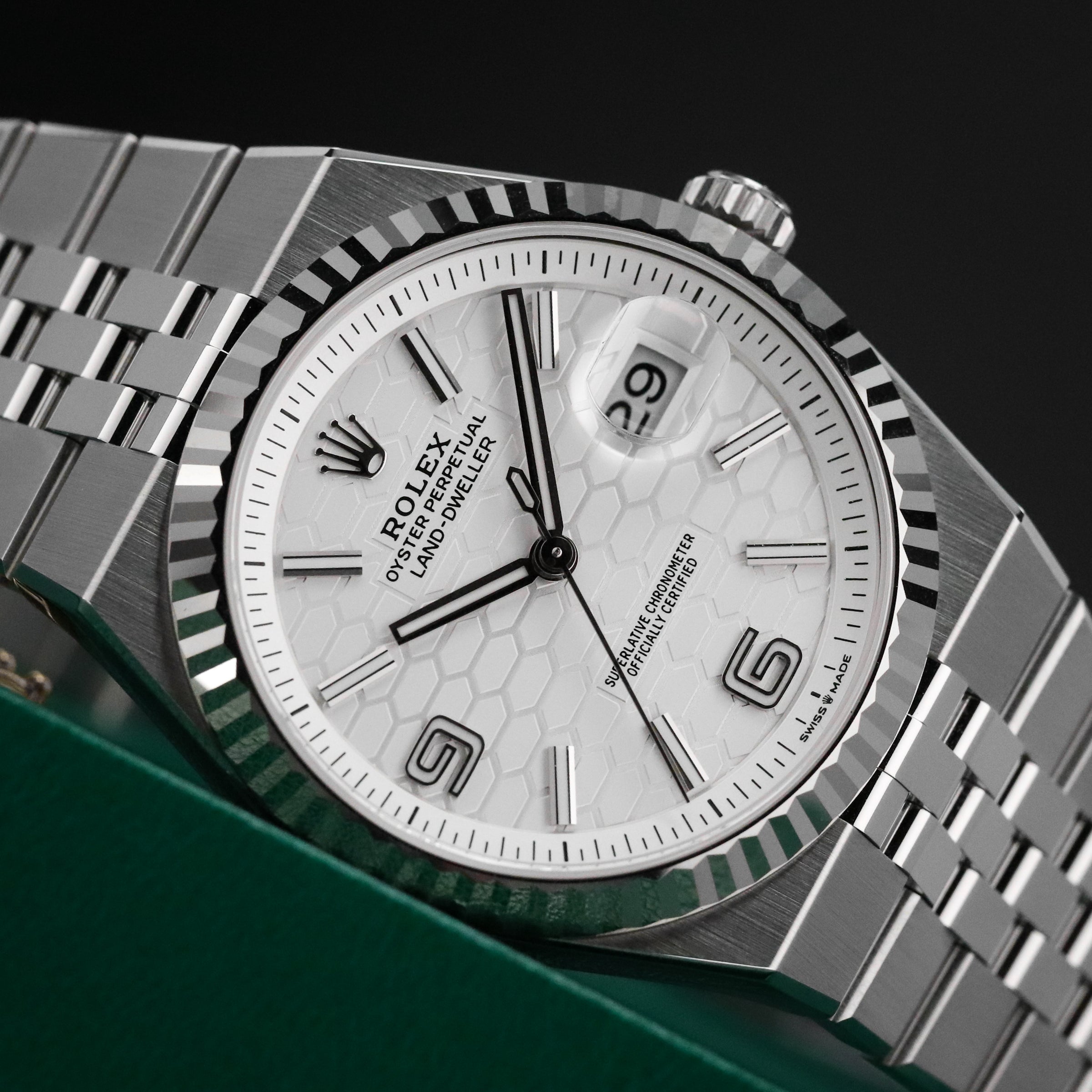 At Watches & Wonders 2025, Rolex introduces the Oyster Perpetual Land-Dweller in 40mm and 36mm sizes, signaling a significant evolution in its catalog, marking the first entirely new collection from Rolex in years. The dial is adorned with a honeycomb motif with a satin finish, created using traditional craftsmanship and high-technology methods. At the heart of the Land-Dweller is a calibre high-frequency movement operating and developed entirely by Rolex, including the proprietary Dynapulse escapement, representing groundbreaking technology for the brand.