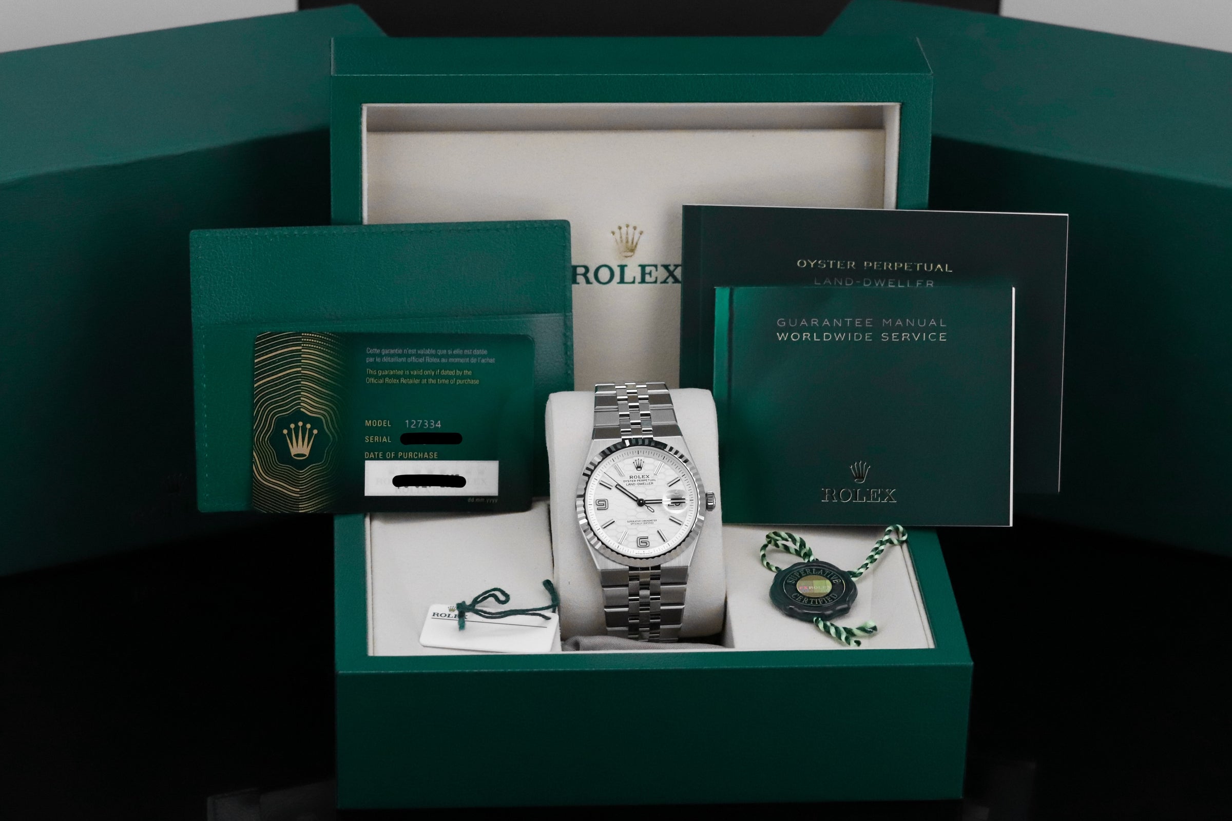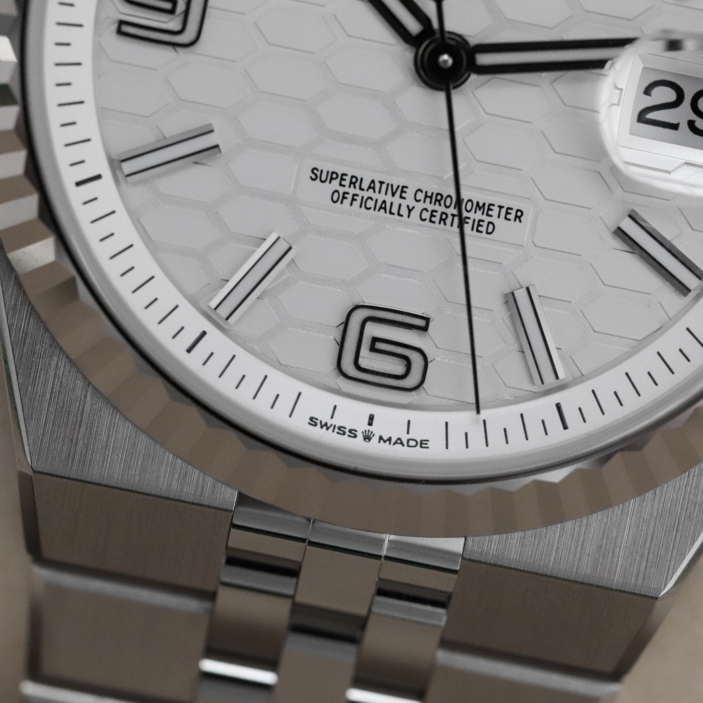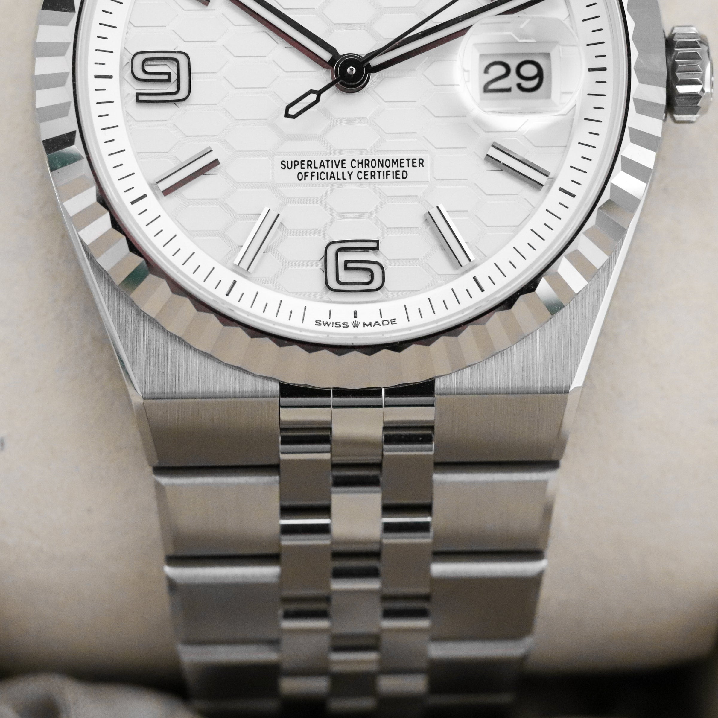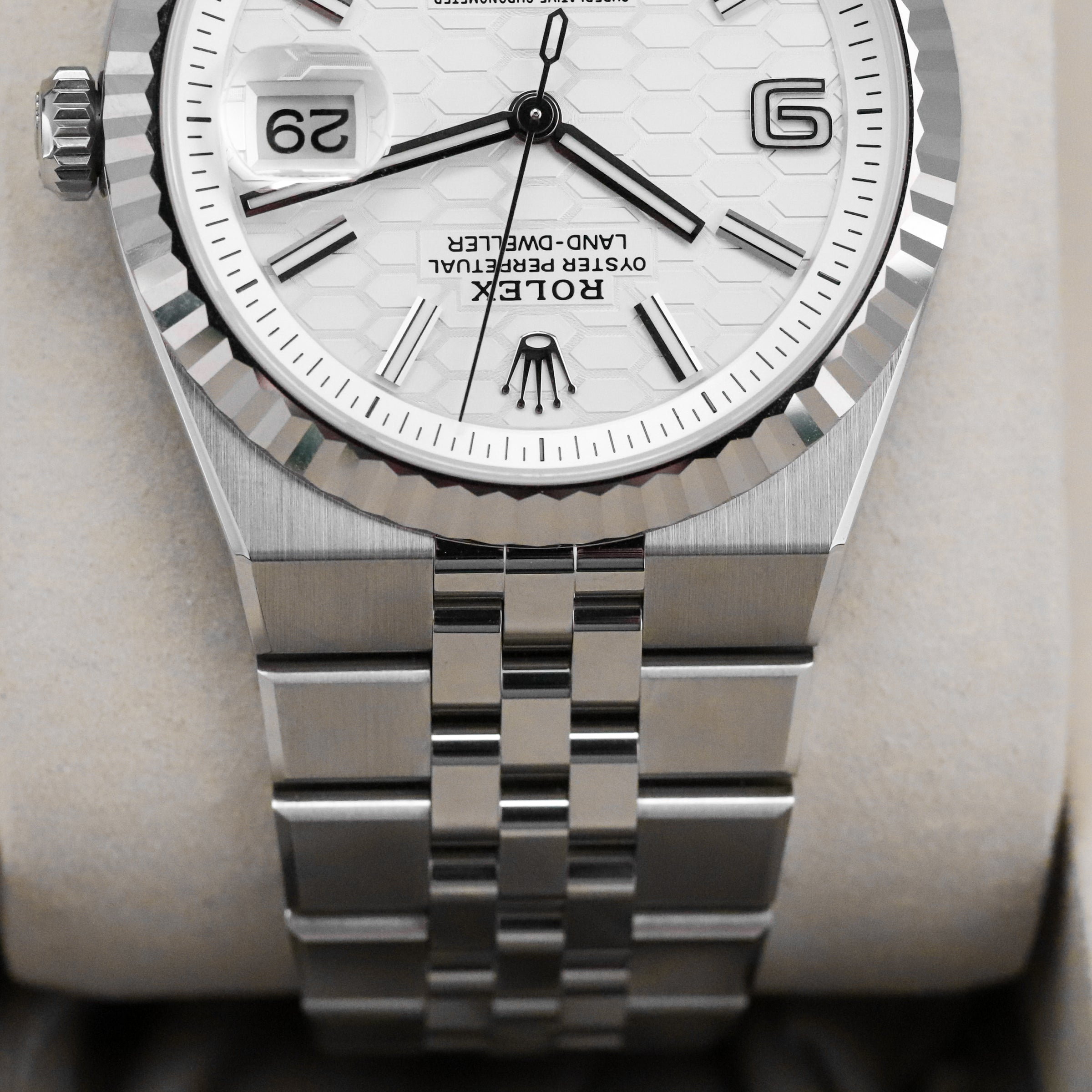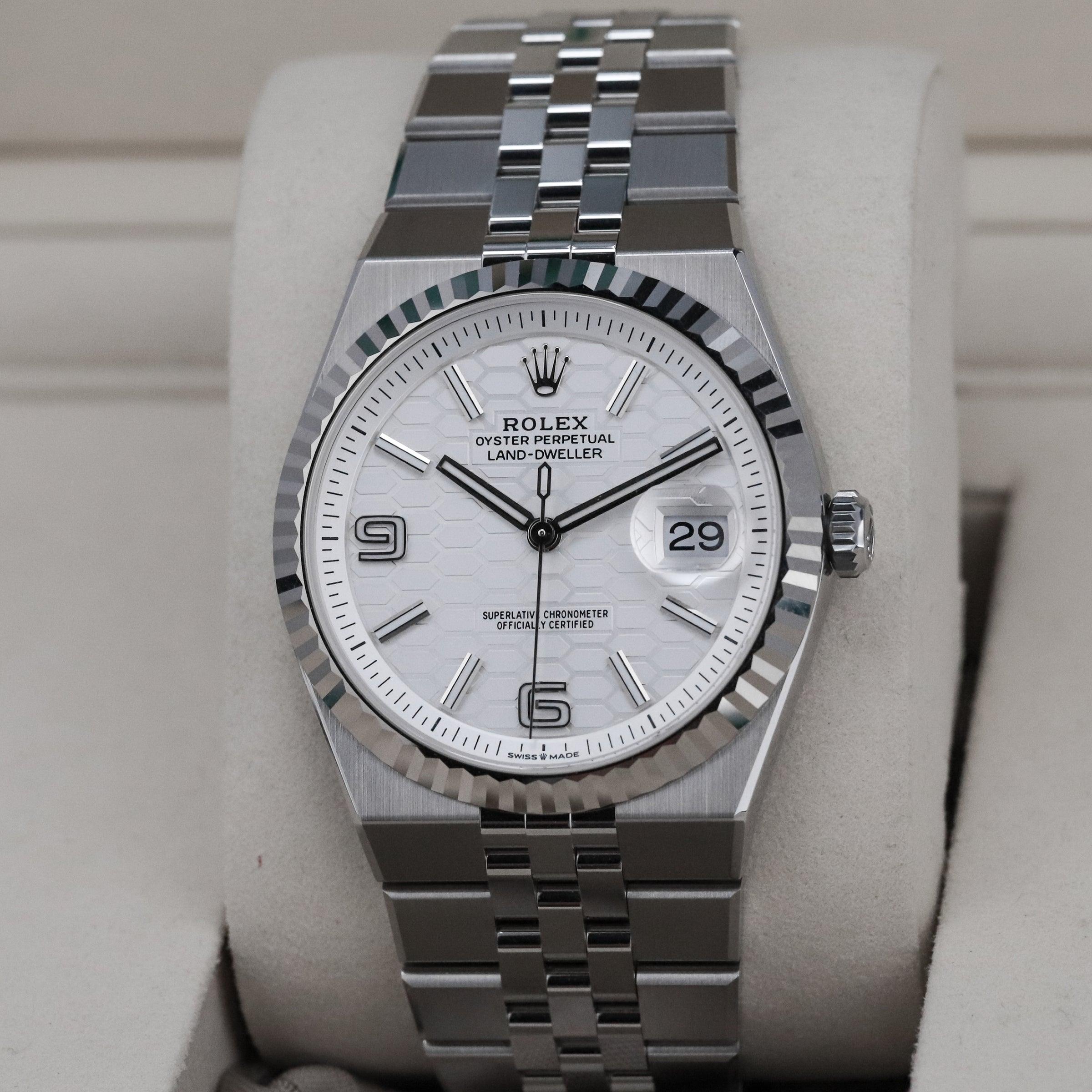 Rolex Land-Dweller [2025 Complete] 40mm Steel Case White Honeycomb Motif Dial White Gold Fluted Bezel Integrated Flat Jubilee Bracelet 127334