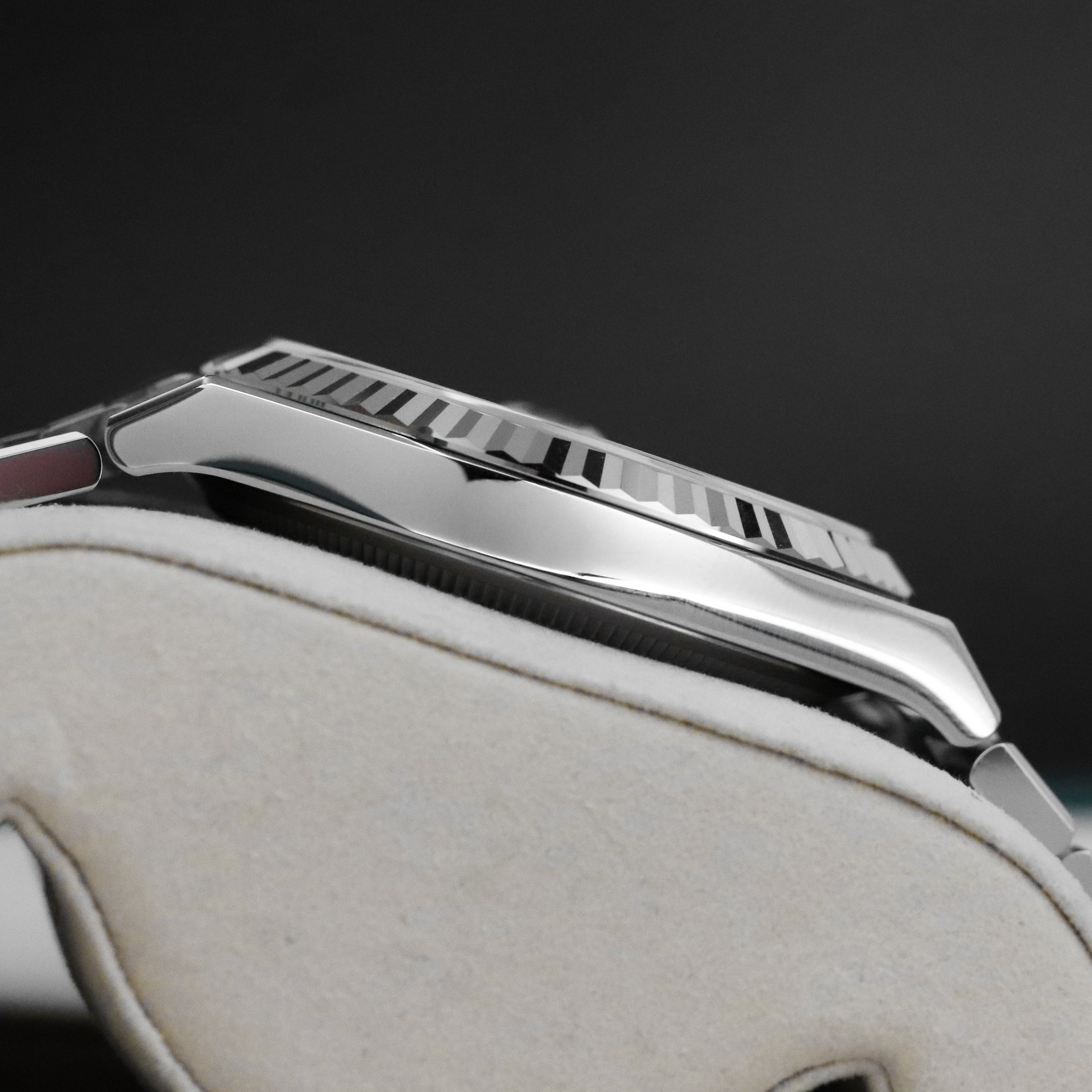 This reference features a 40mm Oystersteel case with 18k white gold fluted bezel, sapphire crystal with AR coating and exhibition caseback, intense white honeycomb dial with open 6 and 9 numerals. Powered by Rolex calibre 7135, beats at 5Hz/36000 vph, 39 jewels, with a power reserve of 66 hours and the revolutionary Dynapulse escapement. The distinctive five-row Flat Jubilee bracelet features a Crownclasp with crown-shaped pull, creating seamless integration from case to clasp.