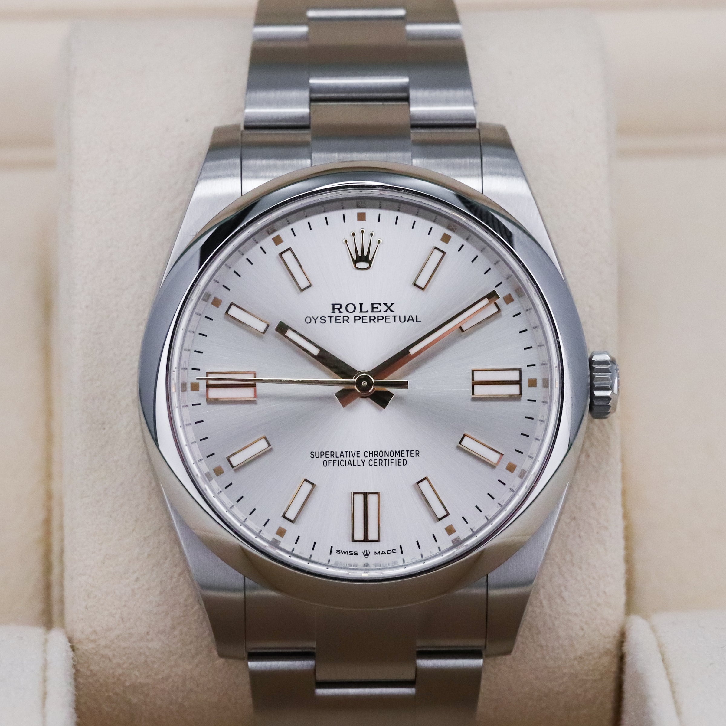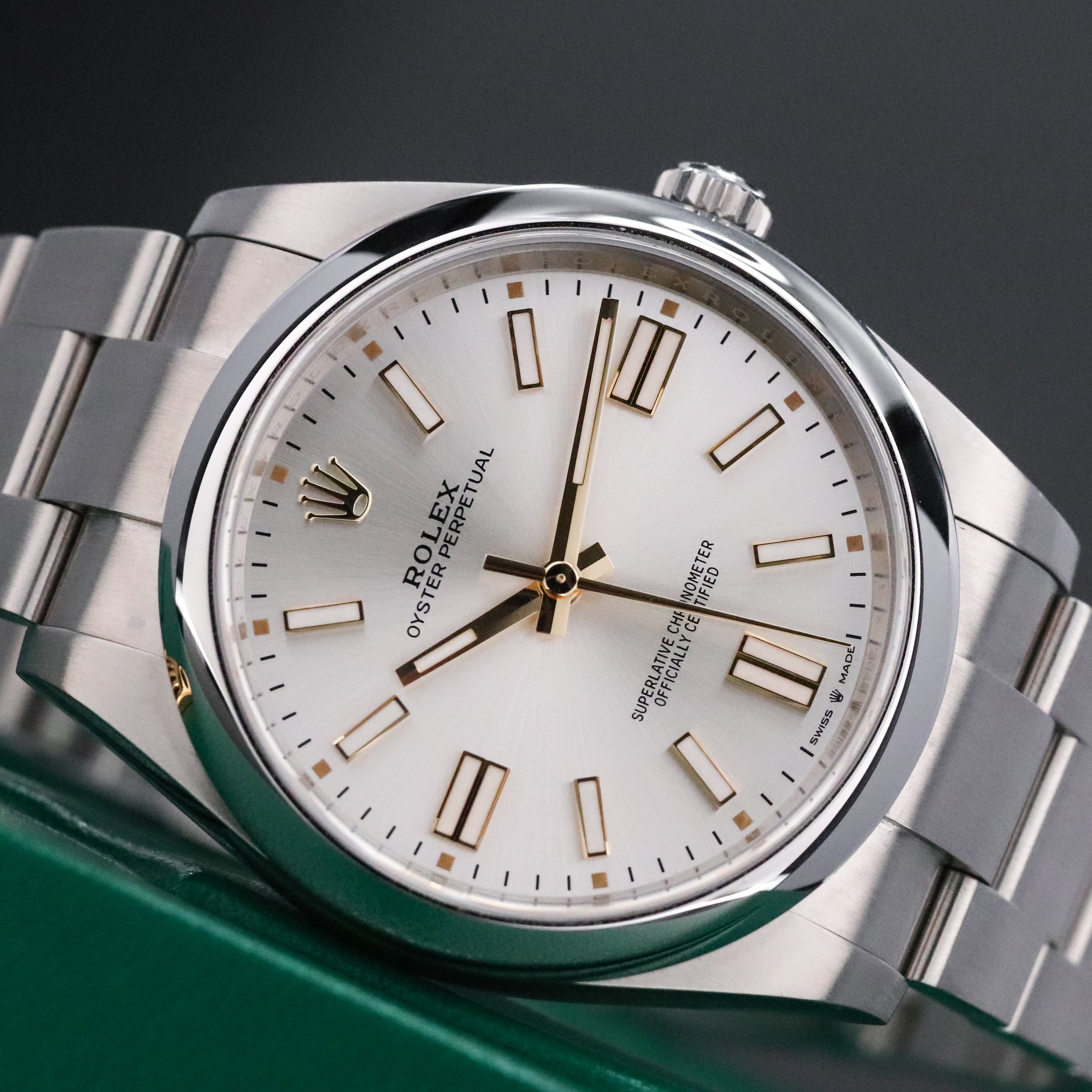 The purest expression of Rolex's foundational innovations. The Oyster Perpetual is the direct descendant of the original Oyster launched in 1926, the first waterproof wristwatch and the foundation on which Rolex has built its reputation, while "Perpetual" refers to the automatically winding movement first unveiled by Rolex in 1931. This silver dial configuration brings timeless sophistication to the collection's most essential model.
