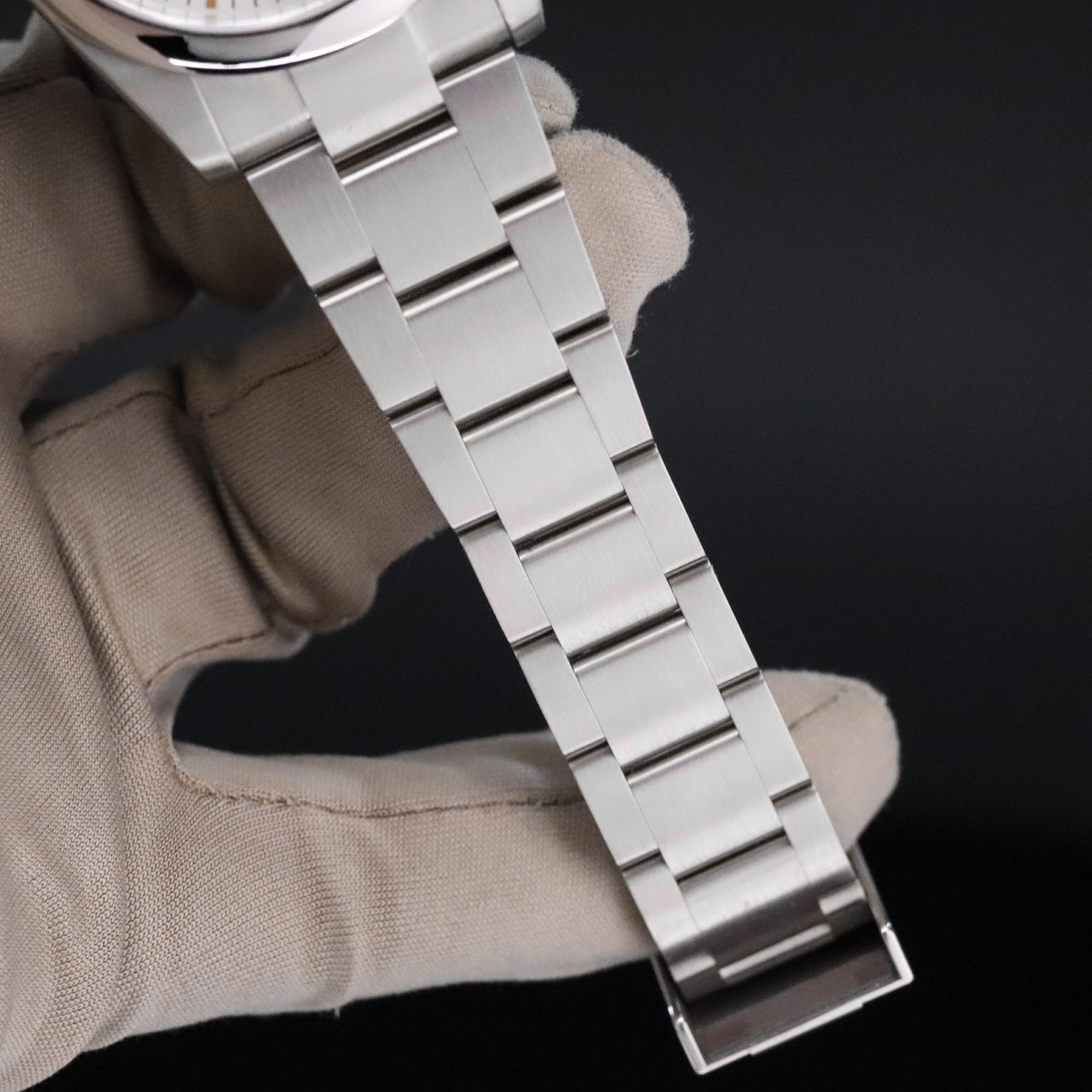 This reference features a 26mm stainless steel case with smooth bezel, white dial with applied hour markers, and sapphire crystal protection. Powered by Rolex's automatic self-winding movement for reliable timekeeping. The watch is fitted with the classic three-link Oyster bracelet and secured by a folding clasp.