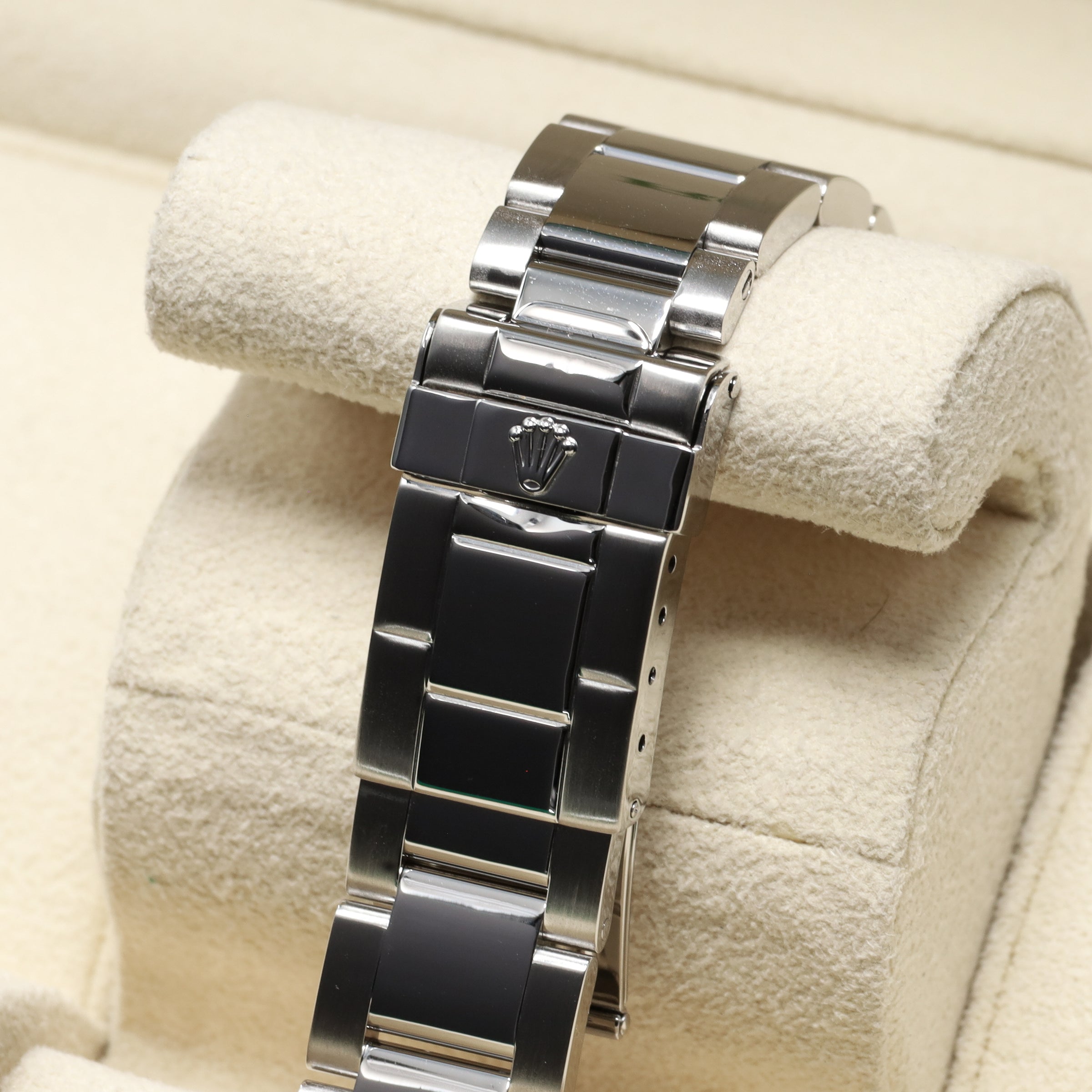 This reference features a 40mm stainless steel case with a bidirectional platinum bezel and a silver dial with luminous hour markers and a date window at 3 o’clock. It’s powered by Rolex’s automatic Caliber 3135 with quickset date and approximately 48 hours of power reserve. The watch is fitted on a stainless steel Oyster bracelet with a folding Oysterlock clasp and Easylink extension.