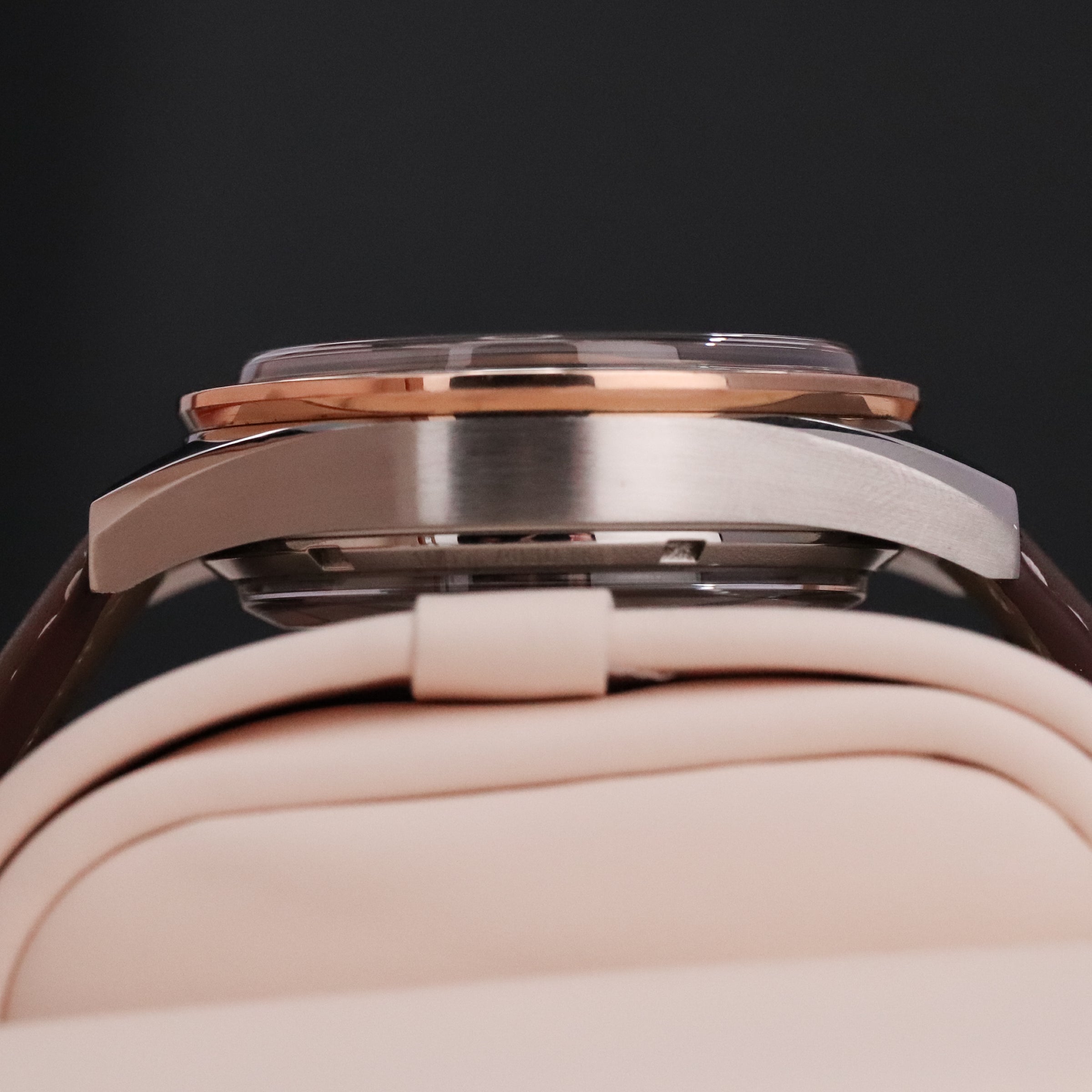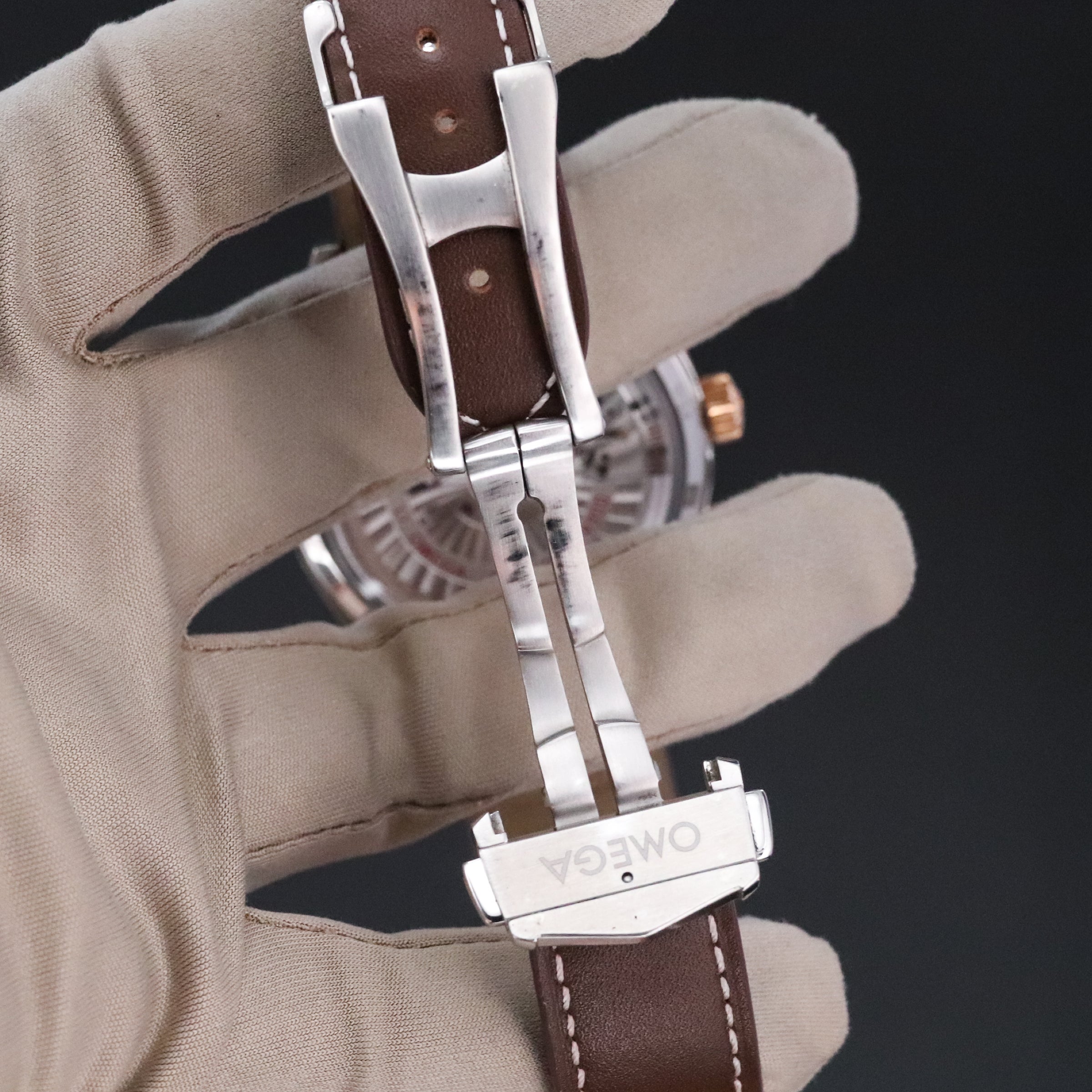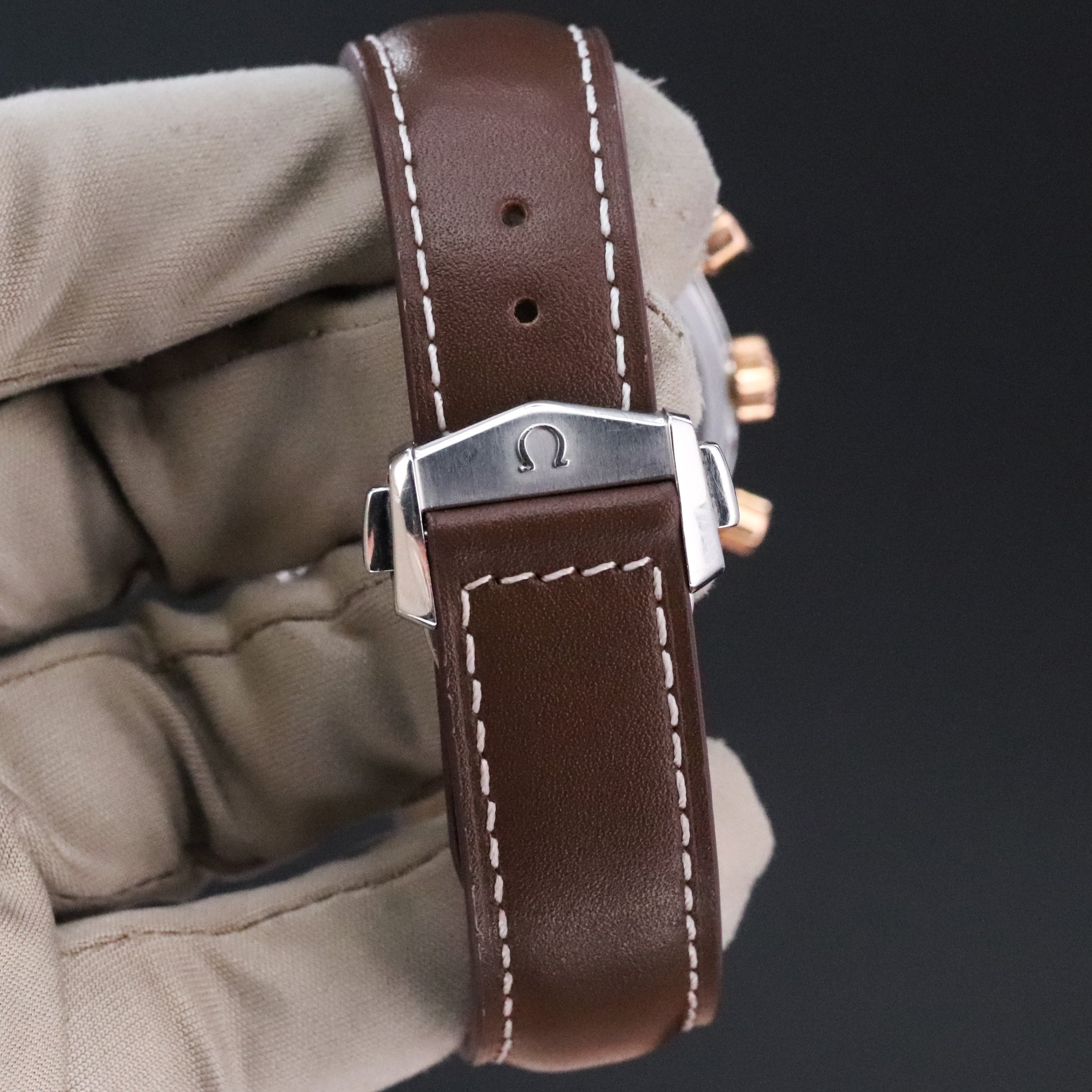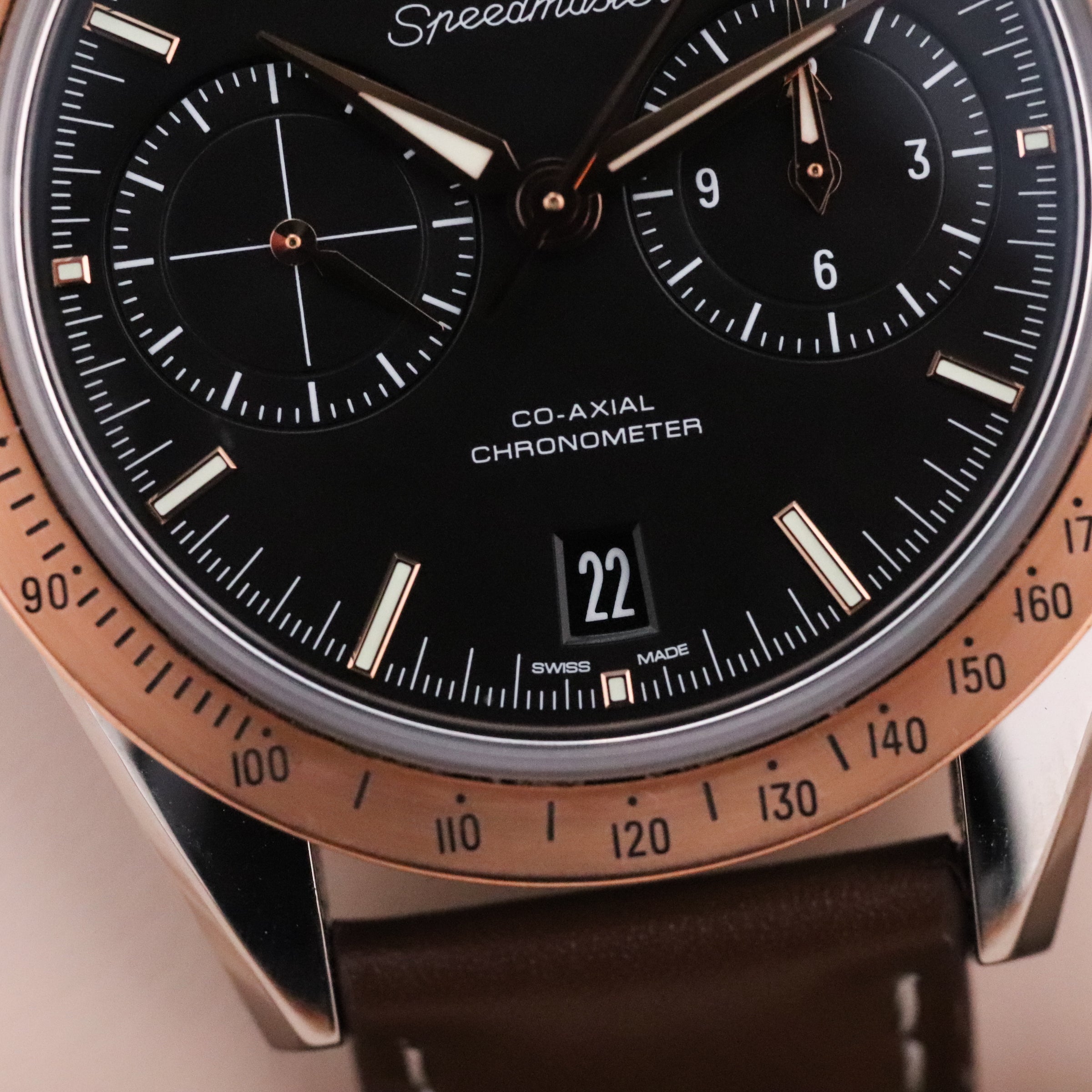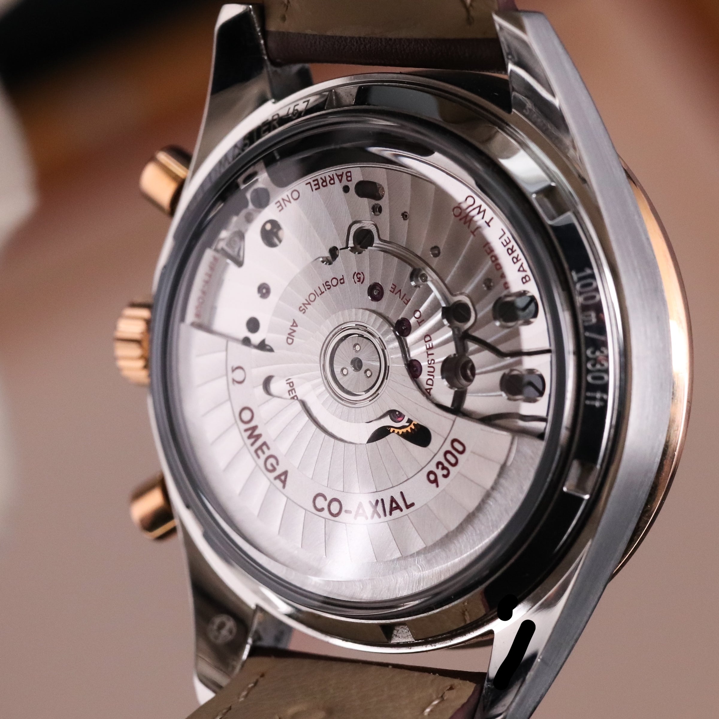 This reference features a 41.50 mm stainless steel case with an 18K red gold bezel featuring a tachymeter scale, and a black dial with the signature broad arrow hands for vintage-inspired elegance. Powered by the OMEGA Co-Axial calibre 9300, the first chronograph in the brand's family of in-house Co-Axial mechanical movements with column wheel mechanism and exceptional precision. The watch is presented on a brown leather strap that complements the warm rose gold tones and secured by a matching buckle.