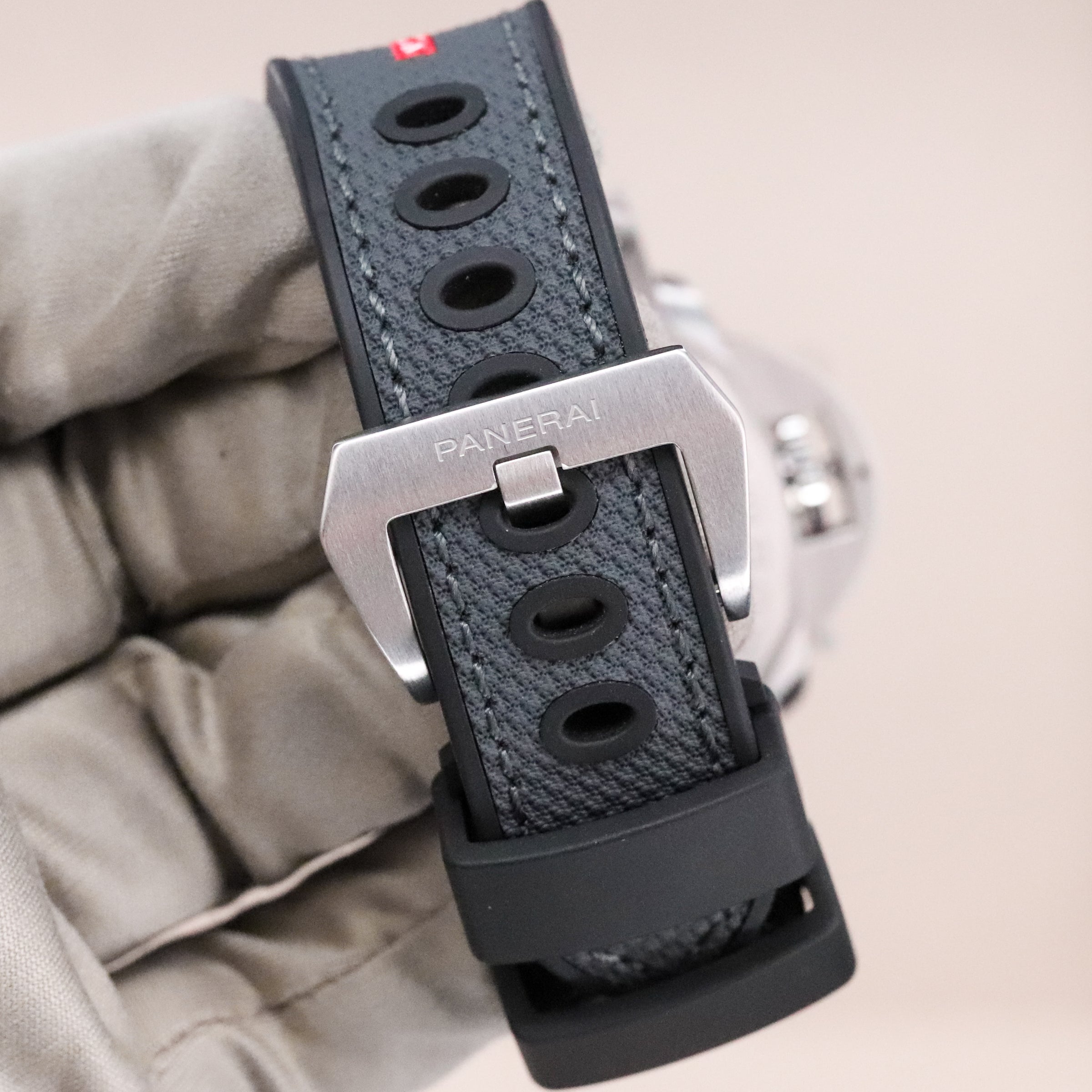 This reference features a 42mm stainless steel case with ceramic bezel insert, blue dial with small seconds, and date display, all protected by scratch-resistant sapphire crystal. Powered by the P.900 automatic calibre, one of the thinnest automatic calibres in Panerai's repertoire at just 4.2mm, with a 72-hour power reserve. The watch is fitted with a black rubber strap with grey textile outer layer showing a red Luna Rossa strip.