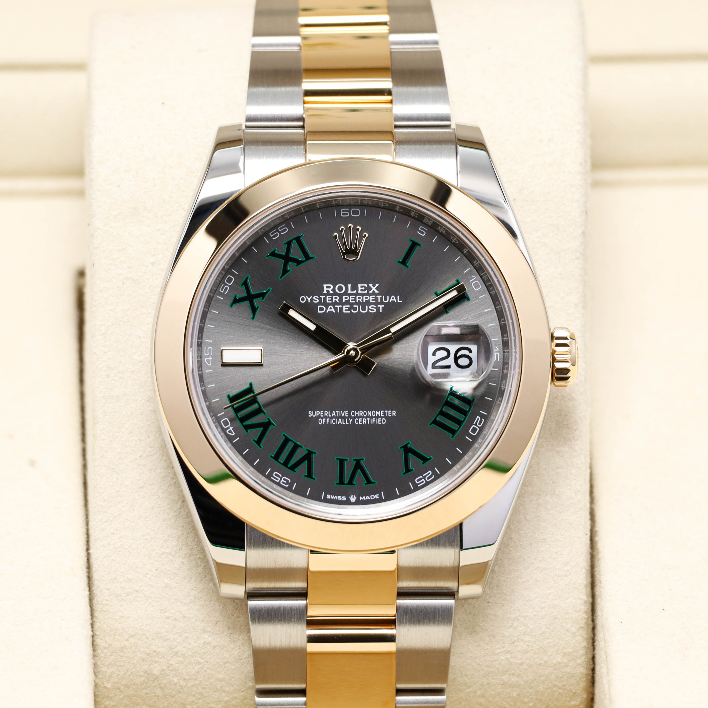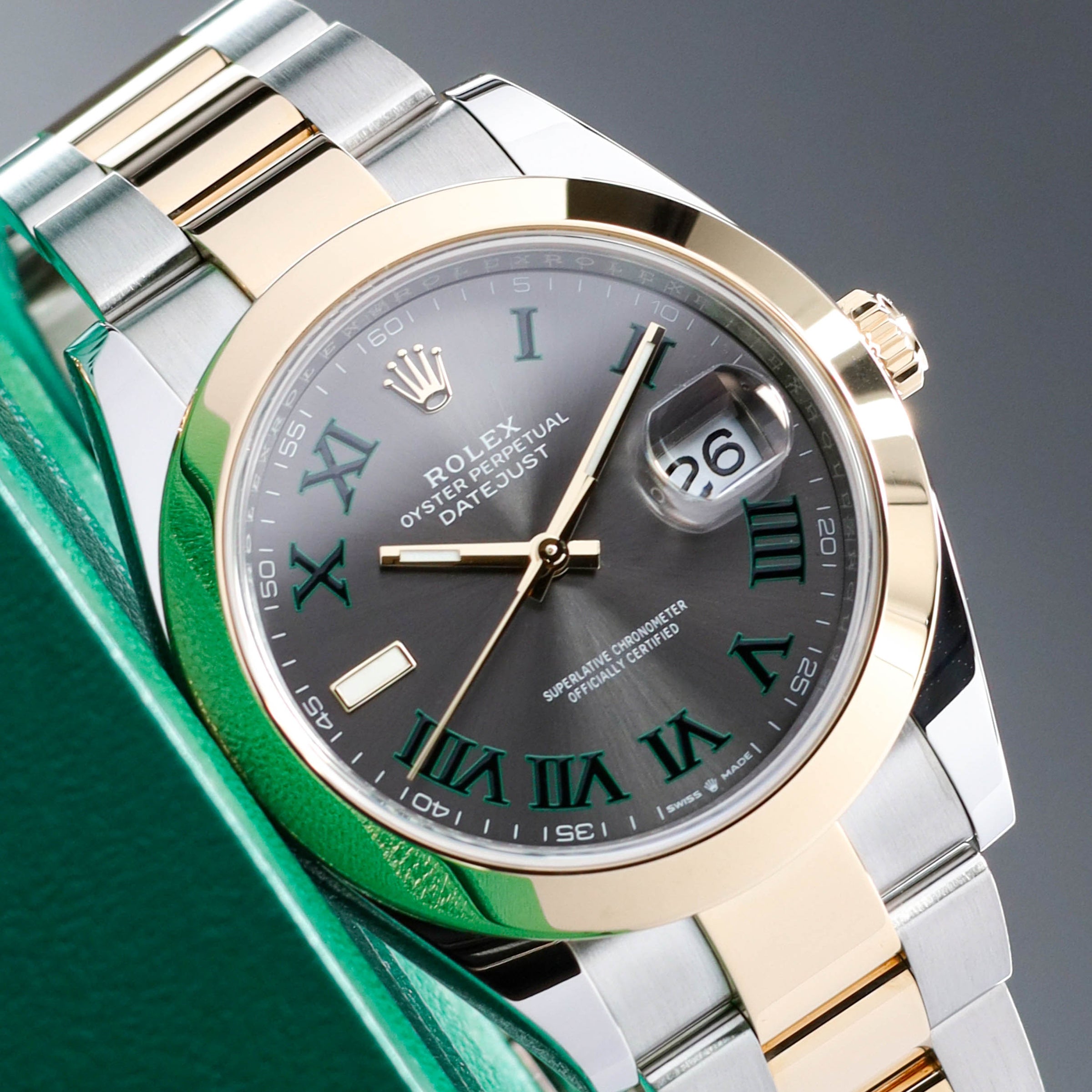 Rolex Datejust 2025 Complete 41mm Oystersteel Two Tone Slate Wimbledon Green Roman Numerals Smooth Yellow Gold Bezel Oyster Bracelet 126303