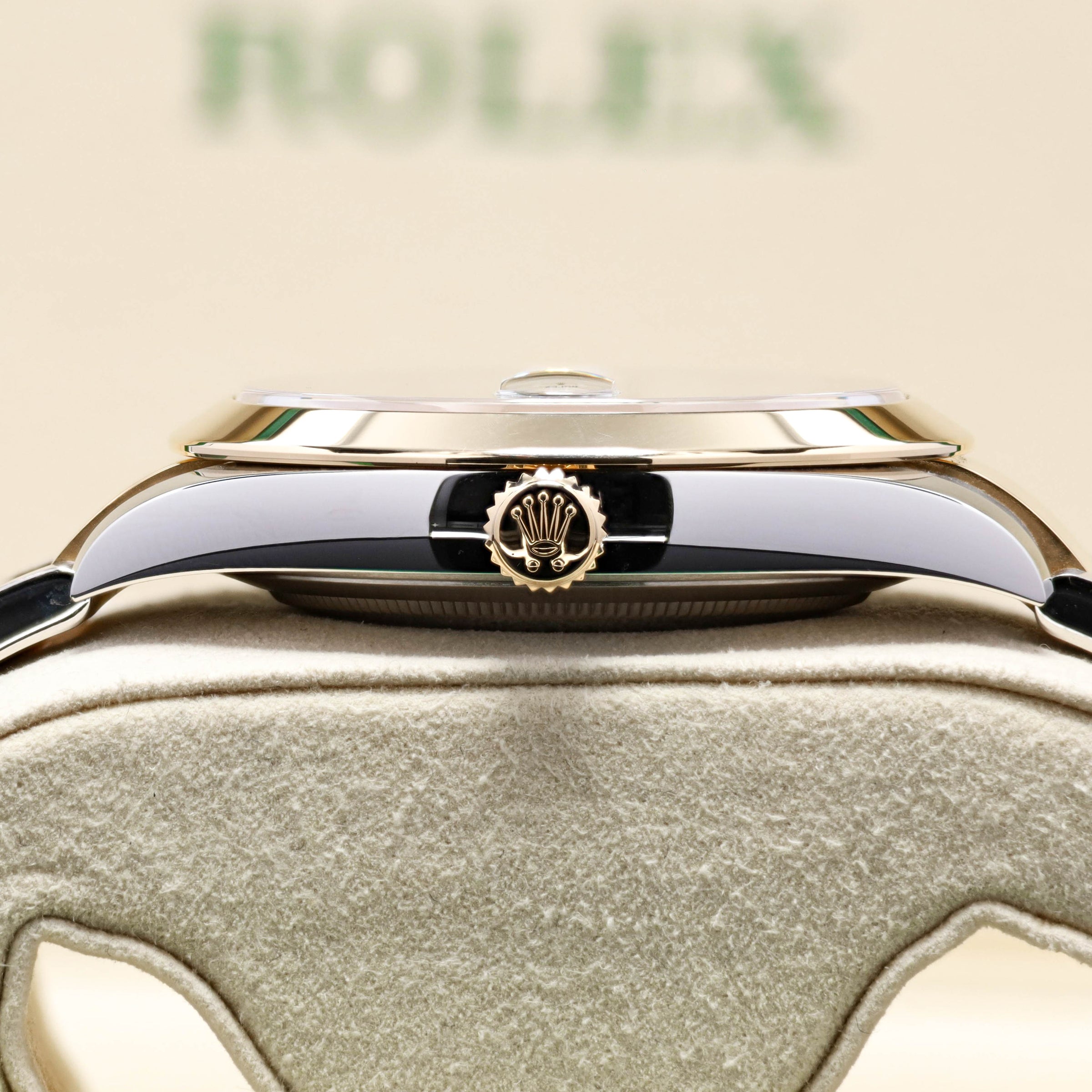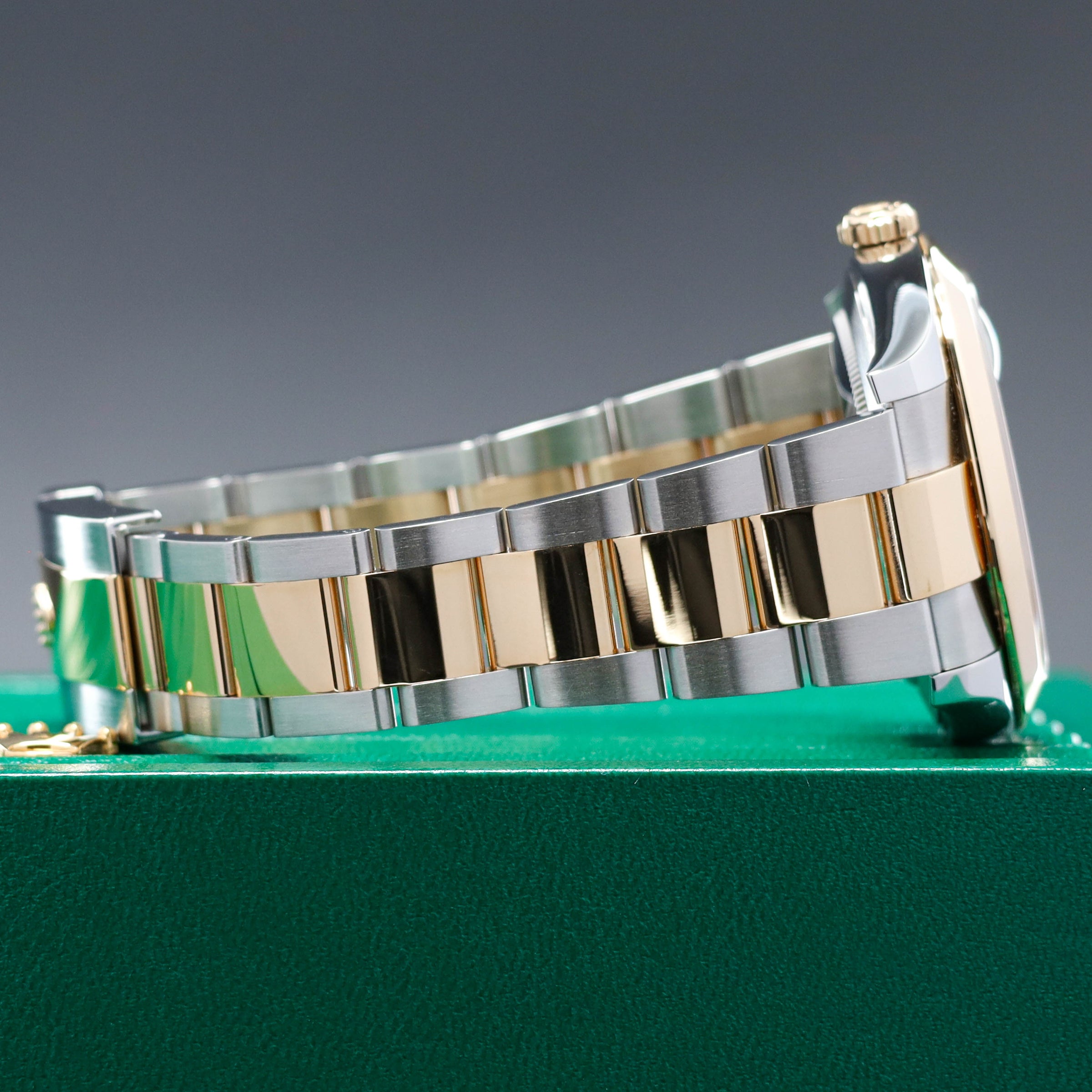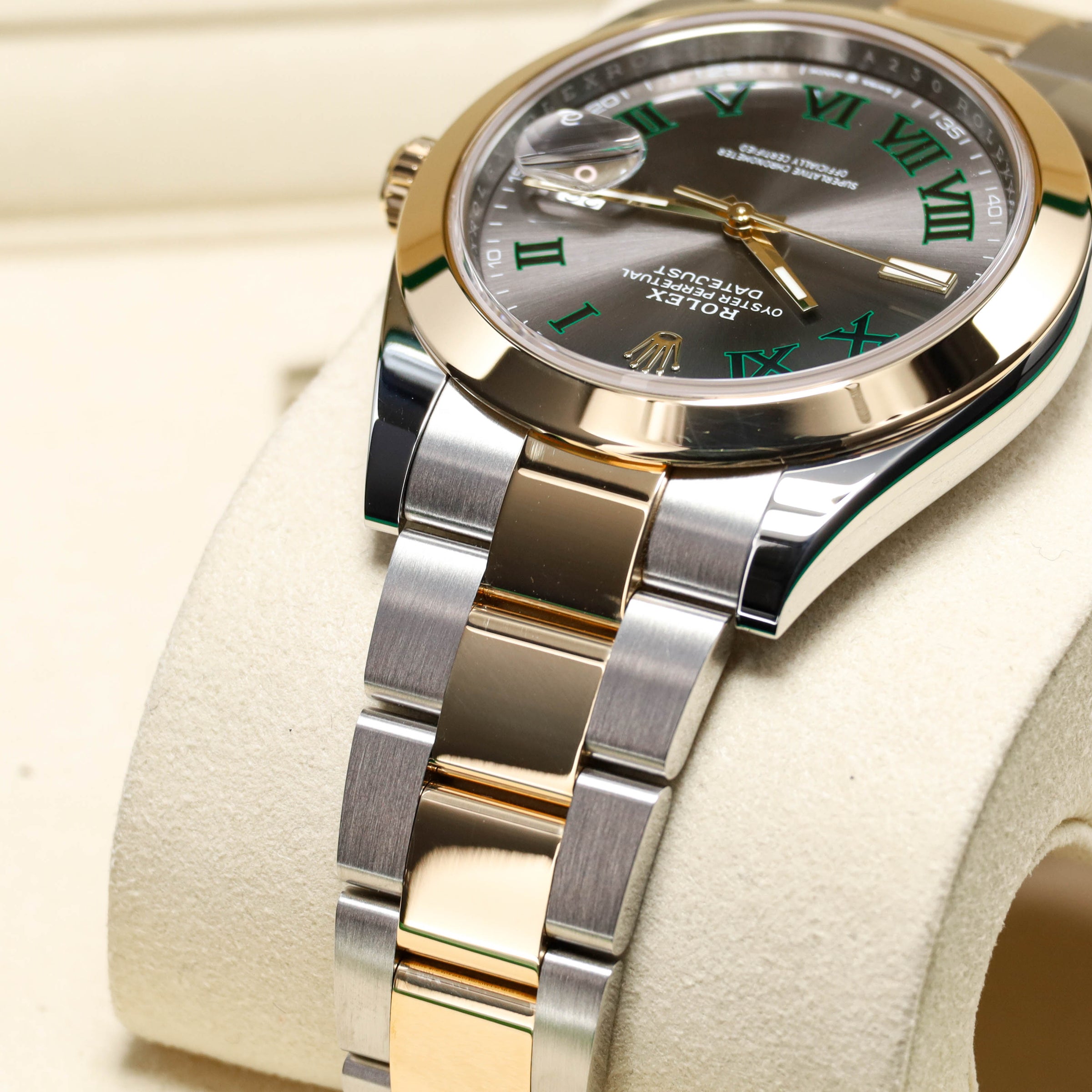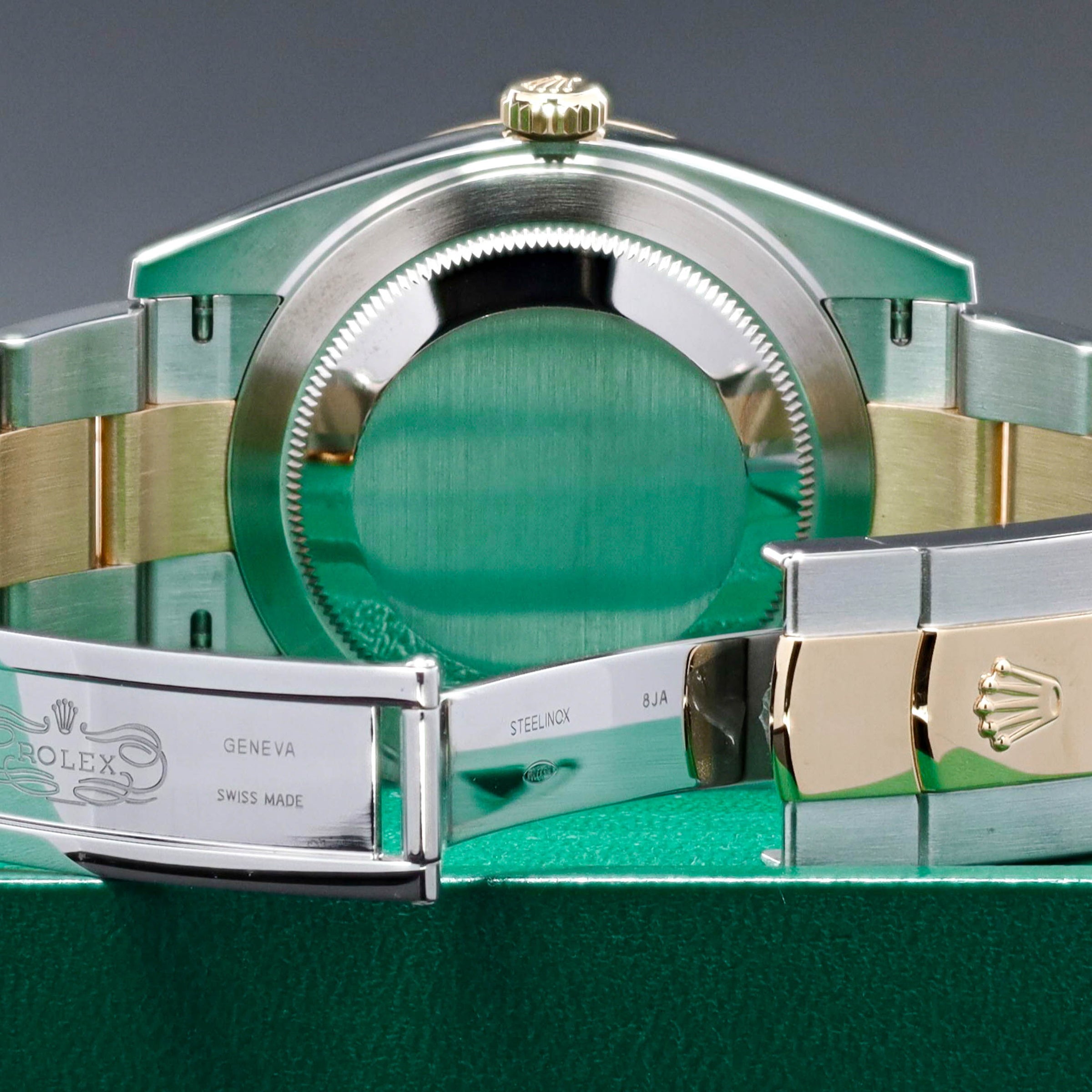 The Wimbledon dial has become one of the most recognizable modern Datejust configurations, especially in the larger 41mm size. The slate dial with green Roman numerals gives this reference a look that’s instantly identifiable without being loud. If you want a two-tone Datejust 41 that collectors consistently ask for, the Wimbledon is the safe bet.