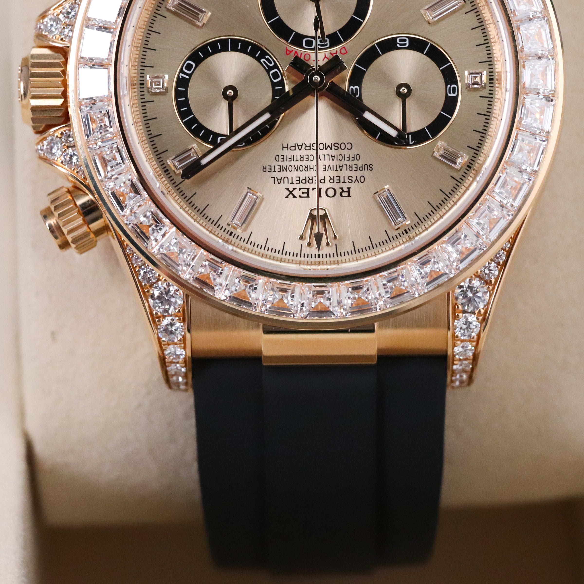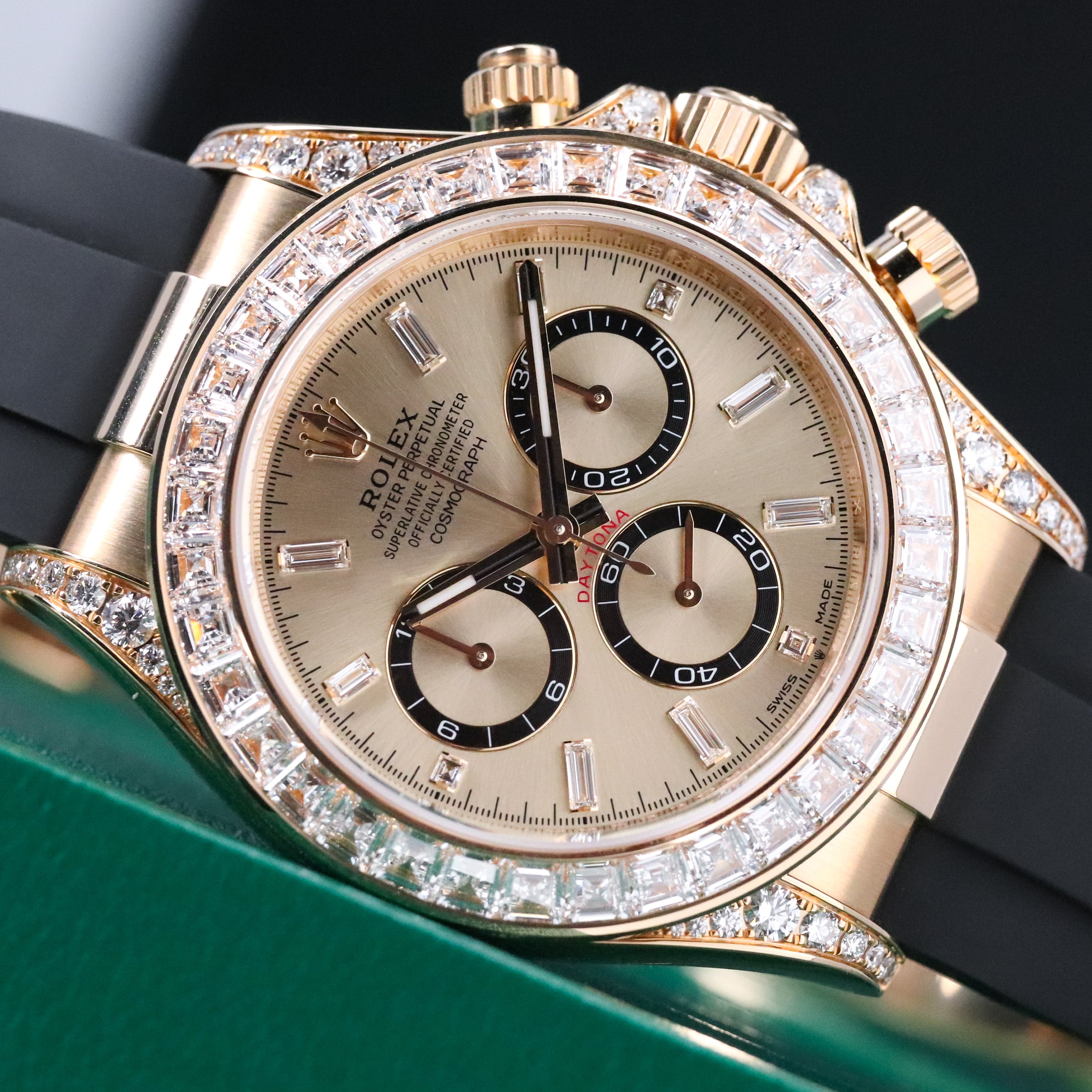 This reference features a 40mm 18k yellow gold case with diamond-set baguette bezel, champagne dial with diamond hour markers, and black Oysterflex bracelet. Powered by the self-winding Calibre 4131 movement offering COSC-certified accuracy and 72-hour power reserve with chronograph functionality and tachymetric scale. The watch is fitted with the black Oysterflex bracelet, secured by the folding Oysterlock safety clasp.