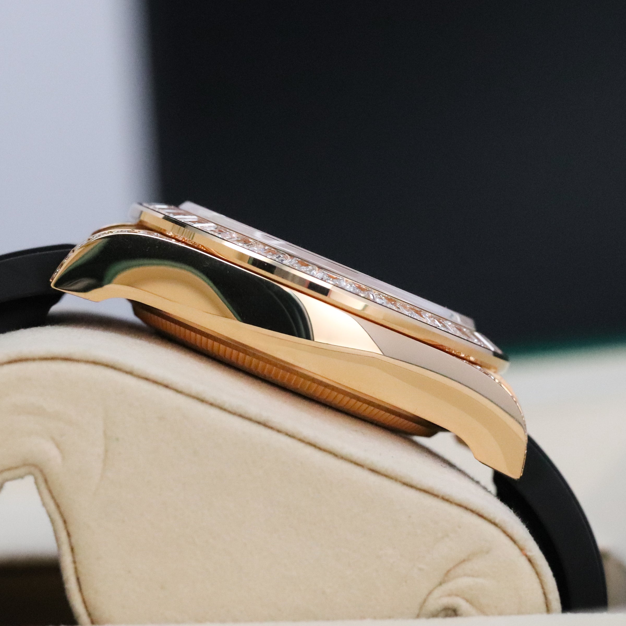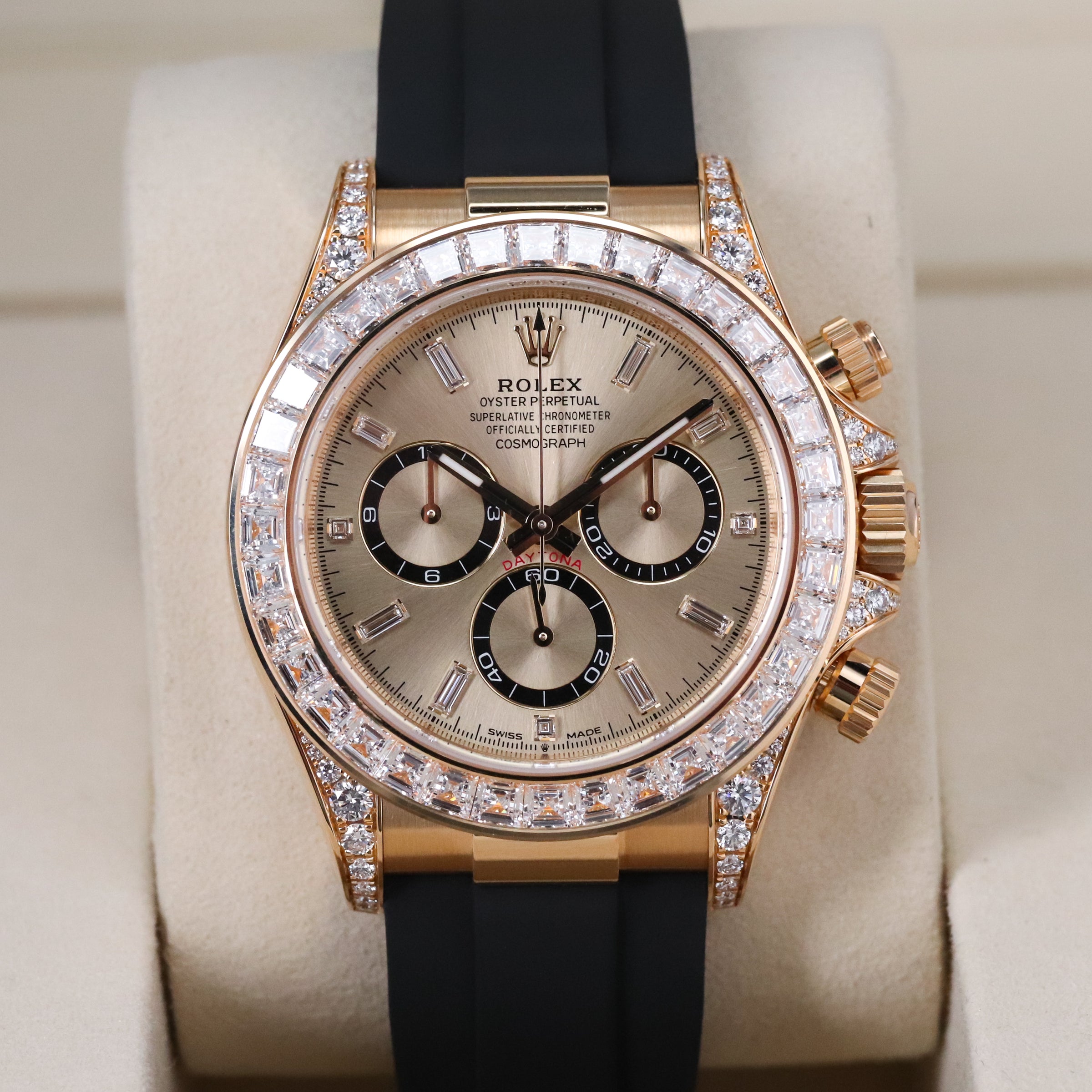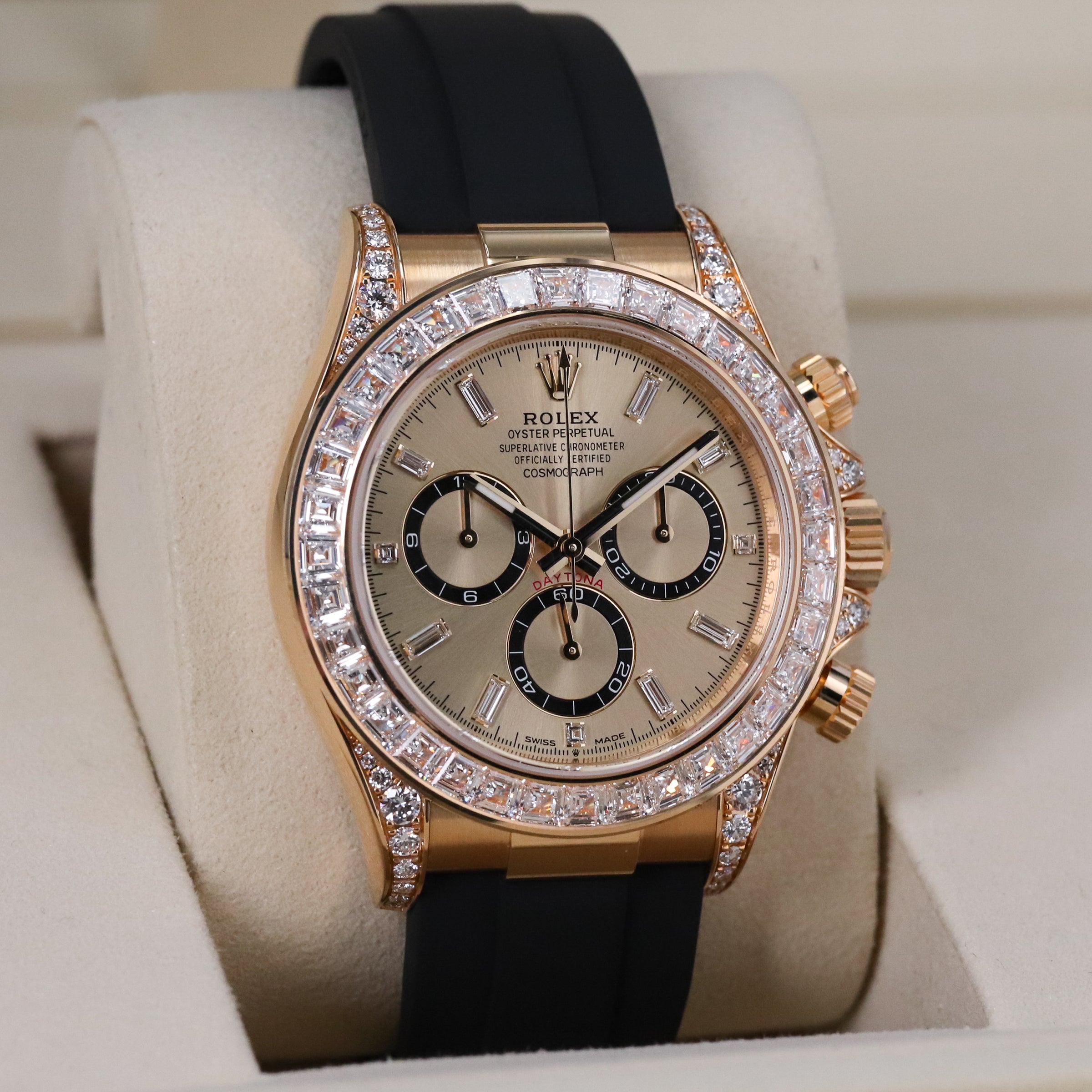 The Rolex Daytona is today one of the most coveted and collectible luxury watches in the world, and indisputably a legend among racing-inspired chronograph wristwatches. The 40mm case is crafted from 18 kt yellow gold with a diamond-set bezel featuring baguette-cut diamonds chosen for their clarity and brilliance, transforming this racing icon into a statement of absolute luxury. The champagne dial is adorned with diamond hour markers, creating a refined aesthetic that balances opulence with the Daytona's motorsport DNA.