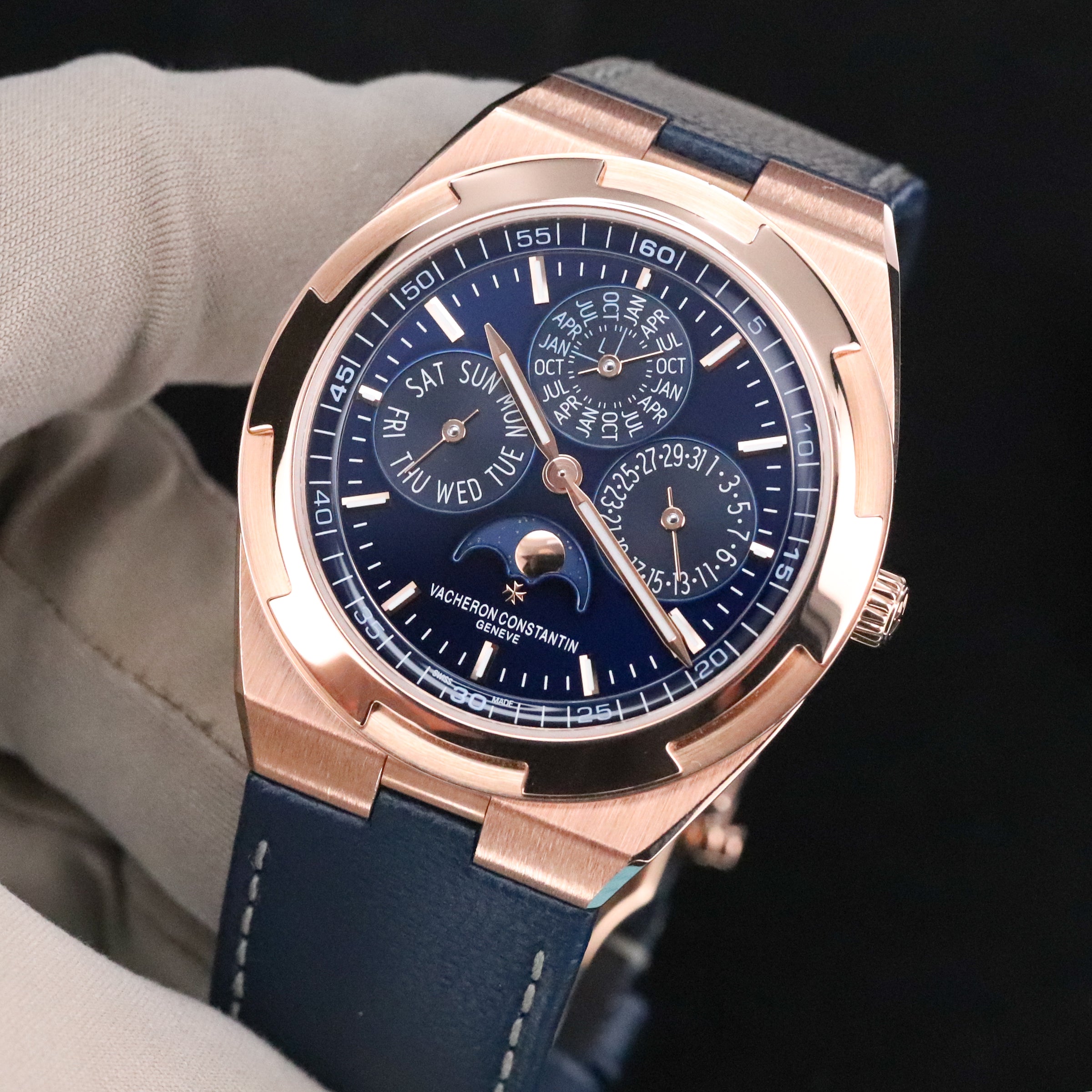This reference features a 41.5mm 18k rose gold case, a blue lacquered dial with day, date, month, leap year, and moonphase displays. Powered by the caliber 1120 QP/1 automatic movement, offering a 40-hour power reserve and perpetual calendar accuracy without adjustment until the year 2100. It comes mounted on a blue rubber strap, with Vacheron’s quick-change system that allows you to swap between the included straps and bracelet in seconds.